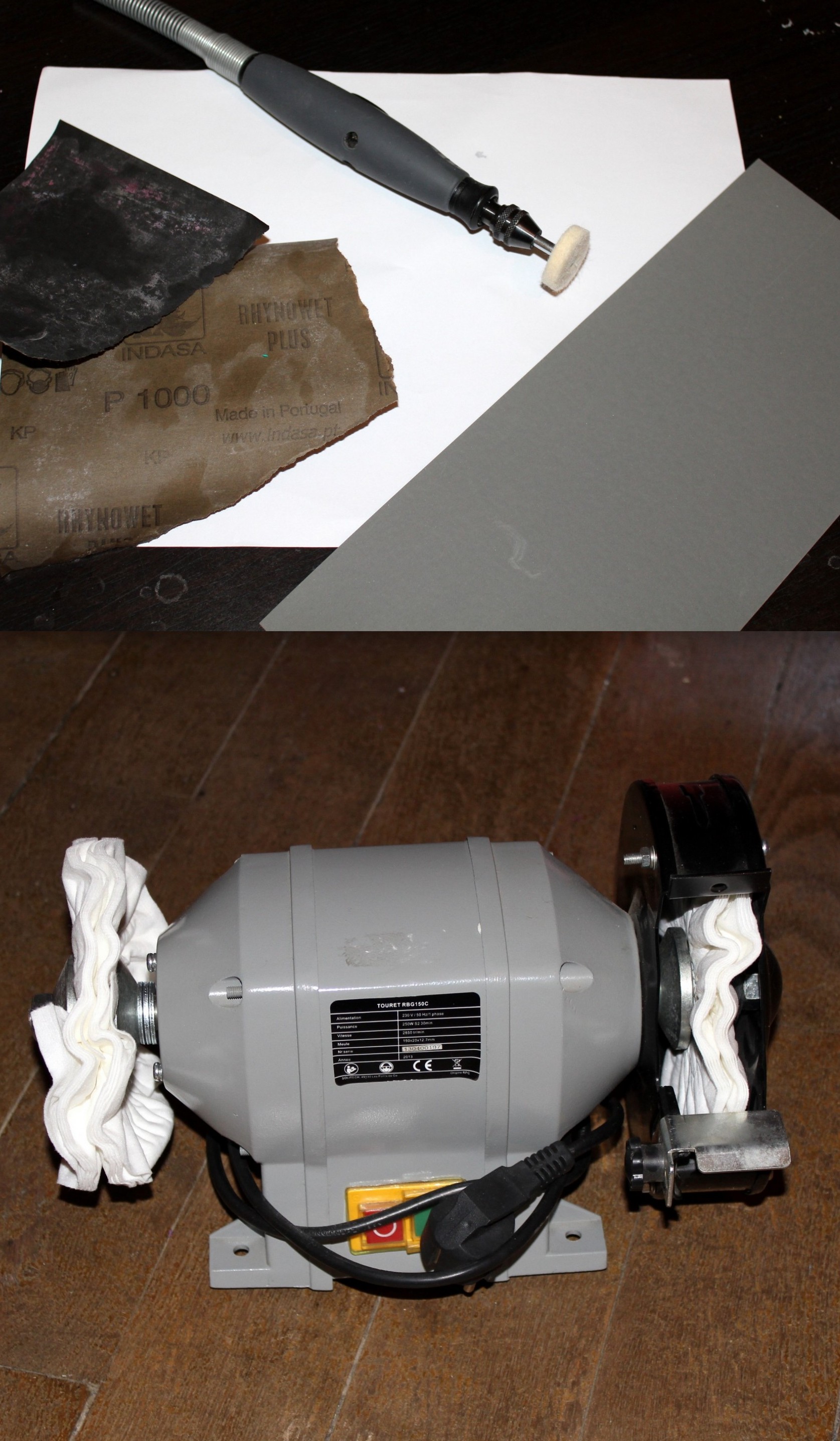 Il reste encore à poncer vos perles. Pour une finition parfaite, poncez au papier de carrossier (toujours mouiller sa pièce et son papier) en commençant par un gros grain type 400 puis en réduisant progressivement le grain jusqu’à 1200. (400, 600, 800, 1000, 1200). Enfin, lustrez doucement à l’aide d’un disque de lustrage monté sur votre perceuse ou, et c’est bien mieux, à l’aide d’un touret à polir. Si vous ne possédez rien de tout ça, vous pouvez tout de même poncer, cela uniformise la surface et efface les éventuelles salissures qui ont marqué vos perles crues et vernir ensuite.