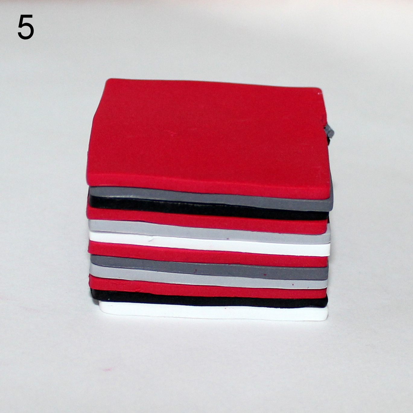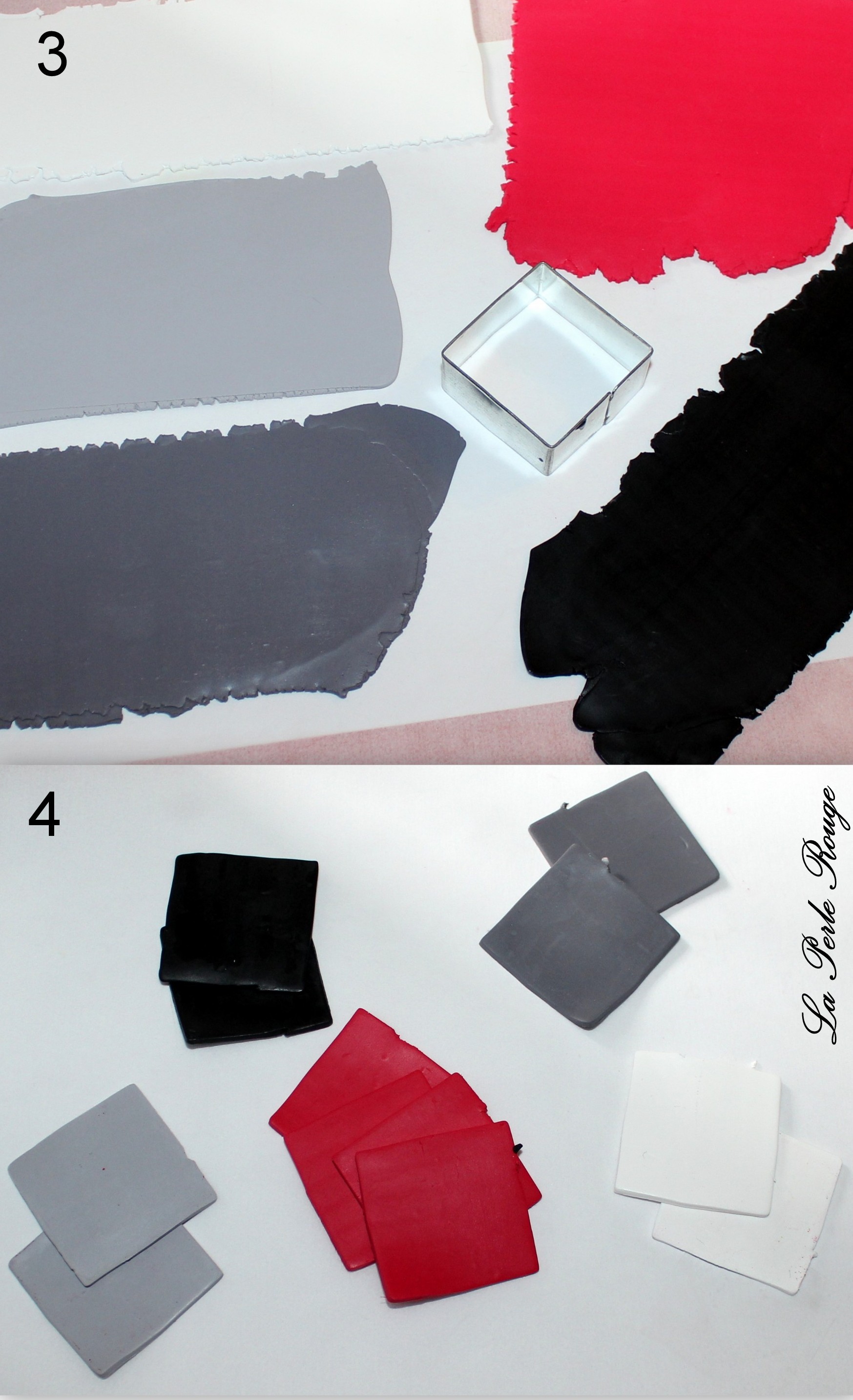 Photos 3 et 4 : Préparez vos couleurs en mélangeant du noir et du blanc afin d’obtenir deux nuances de gris (rappel, ajoutez un peu de noir dans du blanc, et non l’inverse car il faut toujours plus de blanc que de noir à un joli gris). Préparez-vous des plaques pas trop épaisses (réglage 3) de blanc, noir, gris clair, gris foncé et rouge cerise. Saisissez-vous d’un emporte-pièce carré et découpez autant de carrés que vous voulez. Ici, 4 carrés rouges et 2 de chacune des autres couleurs.