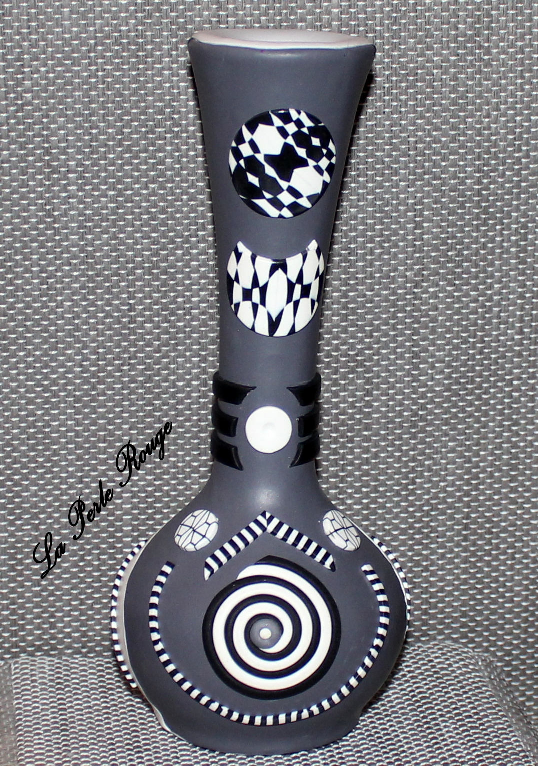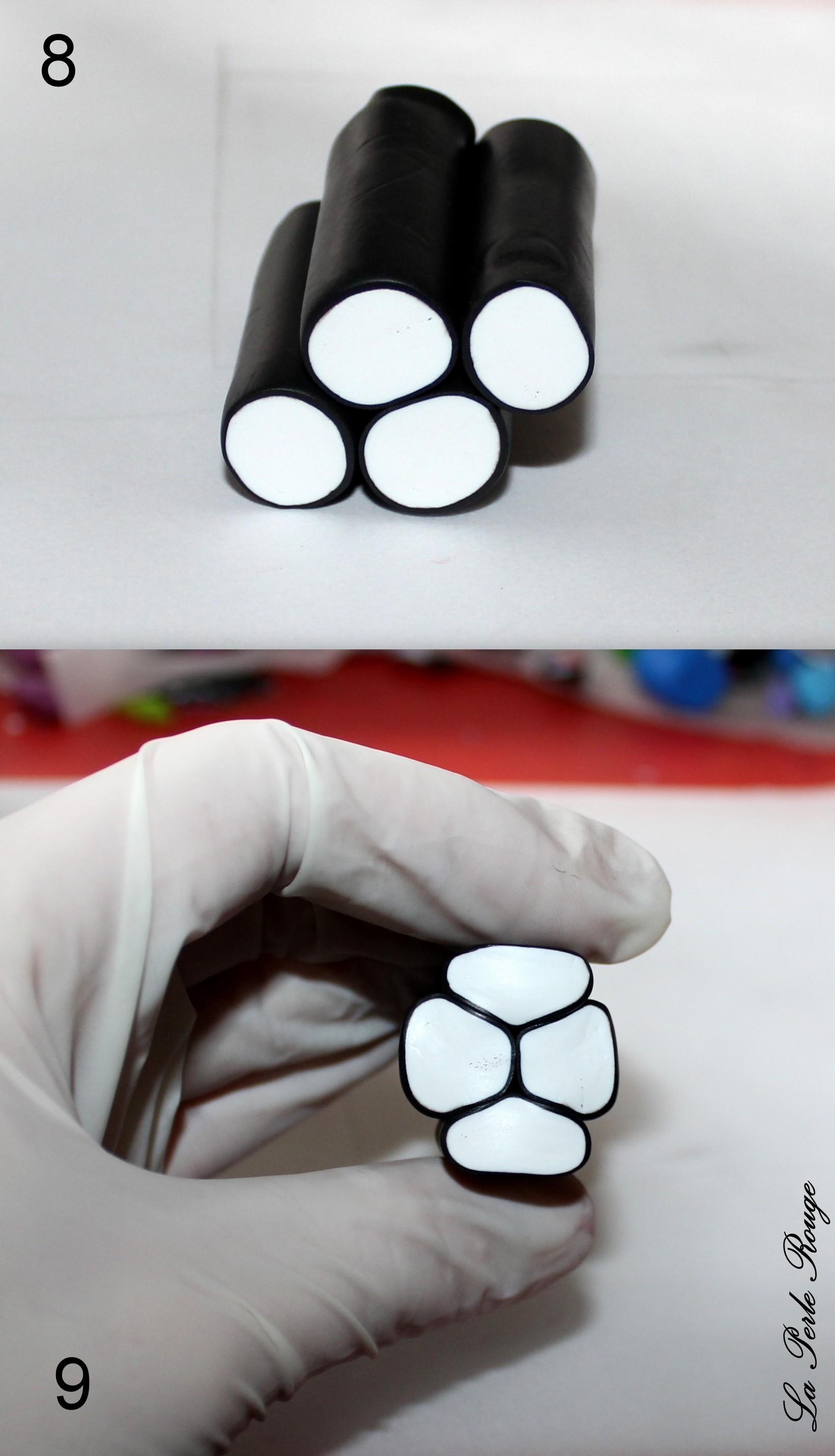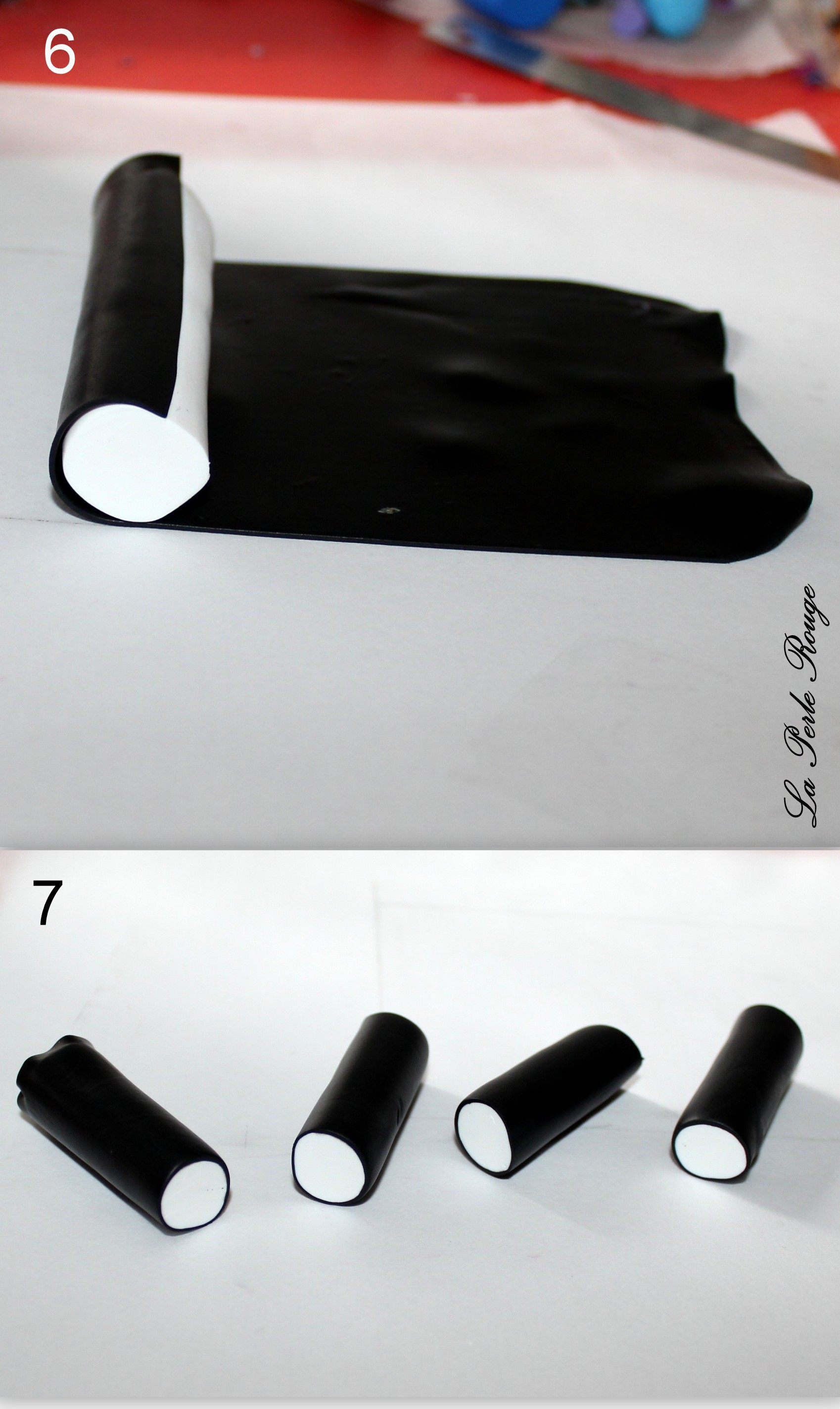 Photos 6 et 7 : Cerclez un colombin blanc d’une FINE plaque de noir (réglage 2, soit l’avant-dernier). Étirez la cane et coupez-la en 4 tronçons.