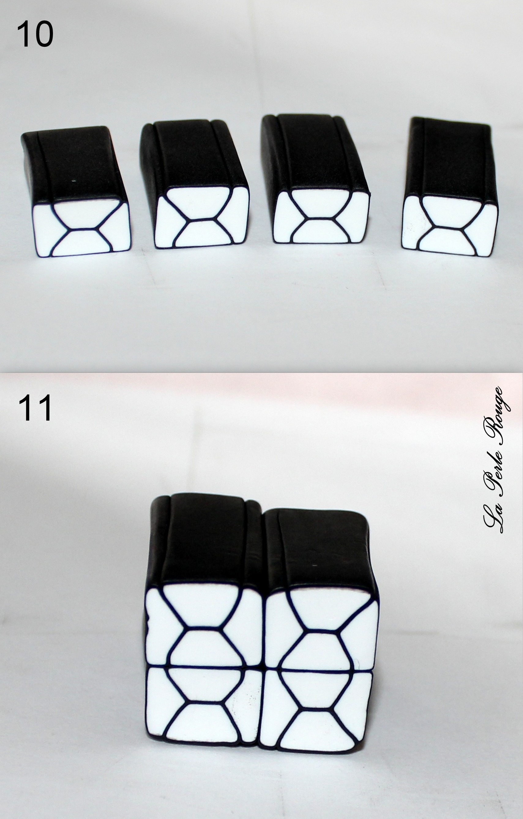 Photos 10 et 11 : Étirez de nouveau cette cane pour la couper en 4 tronçons et procédez de nouveau à un assemblage.