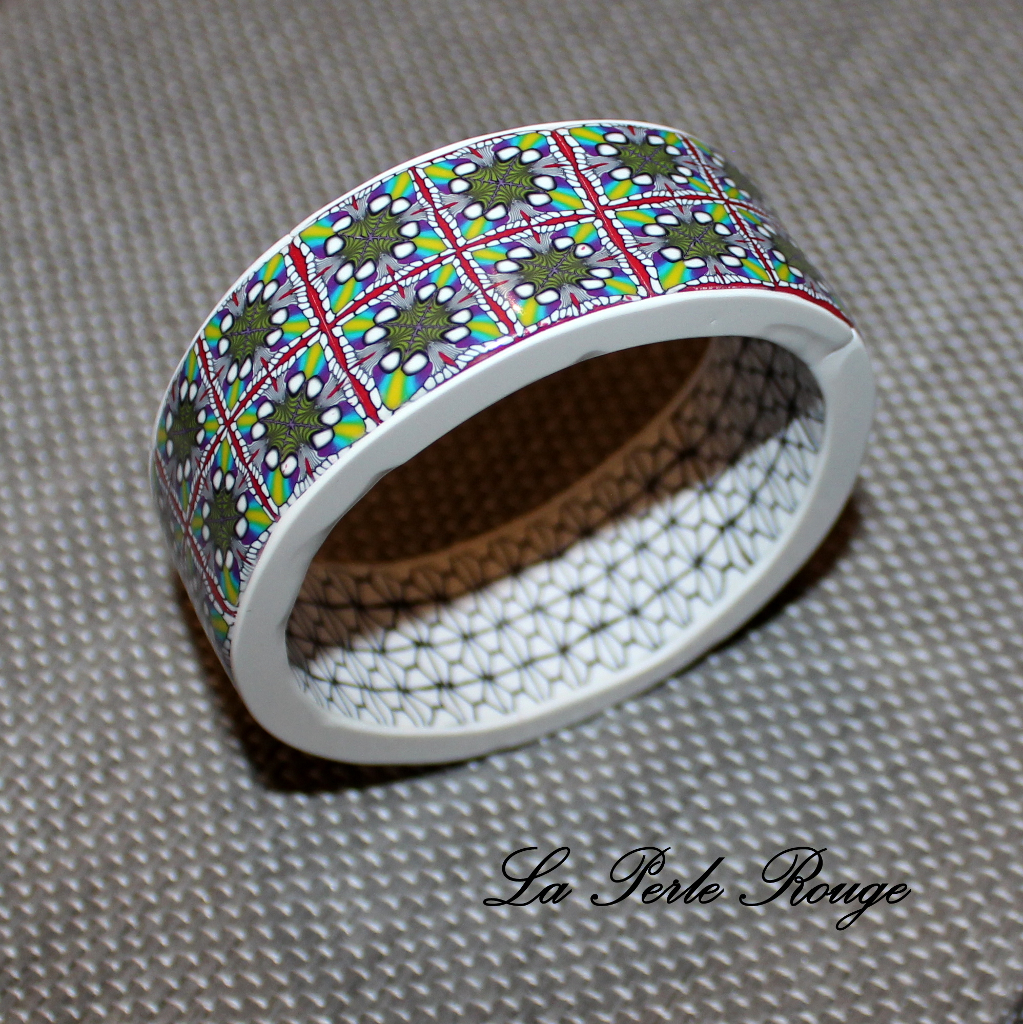 Photos 15 et 16 : Il est temps de procéder à la réalisation du plastron. Pour ce faire, préparez une plaque unie de fine épaisseur (réglage 2 ou 3 max) qui sera le dos de vos perles. Posez votre gabarit et découpez-en la forme dans la pâte.