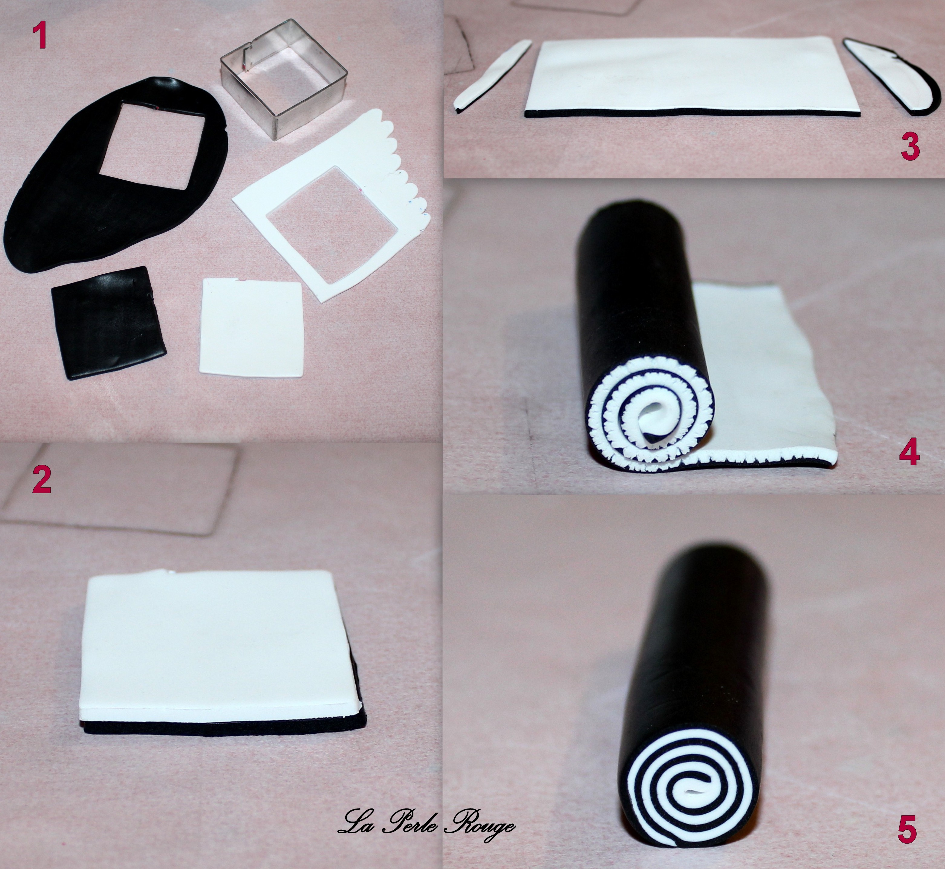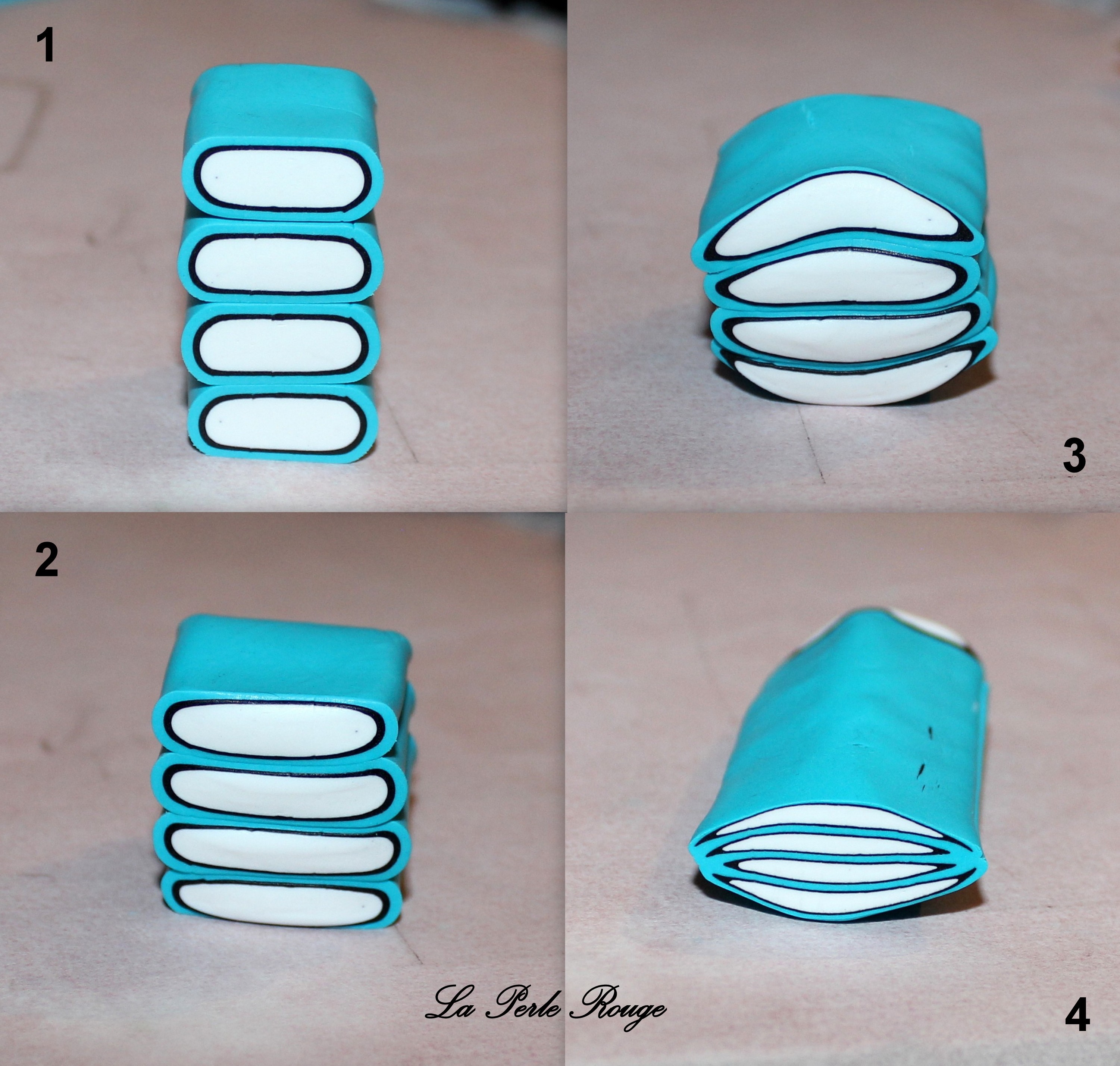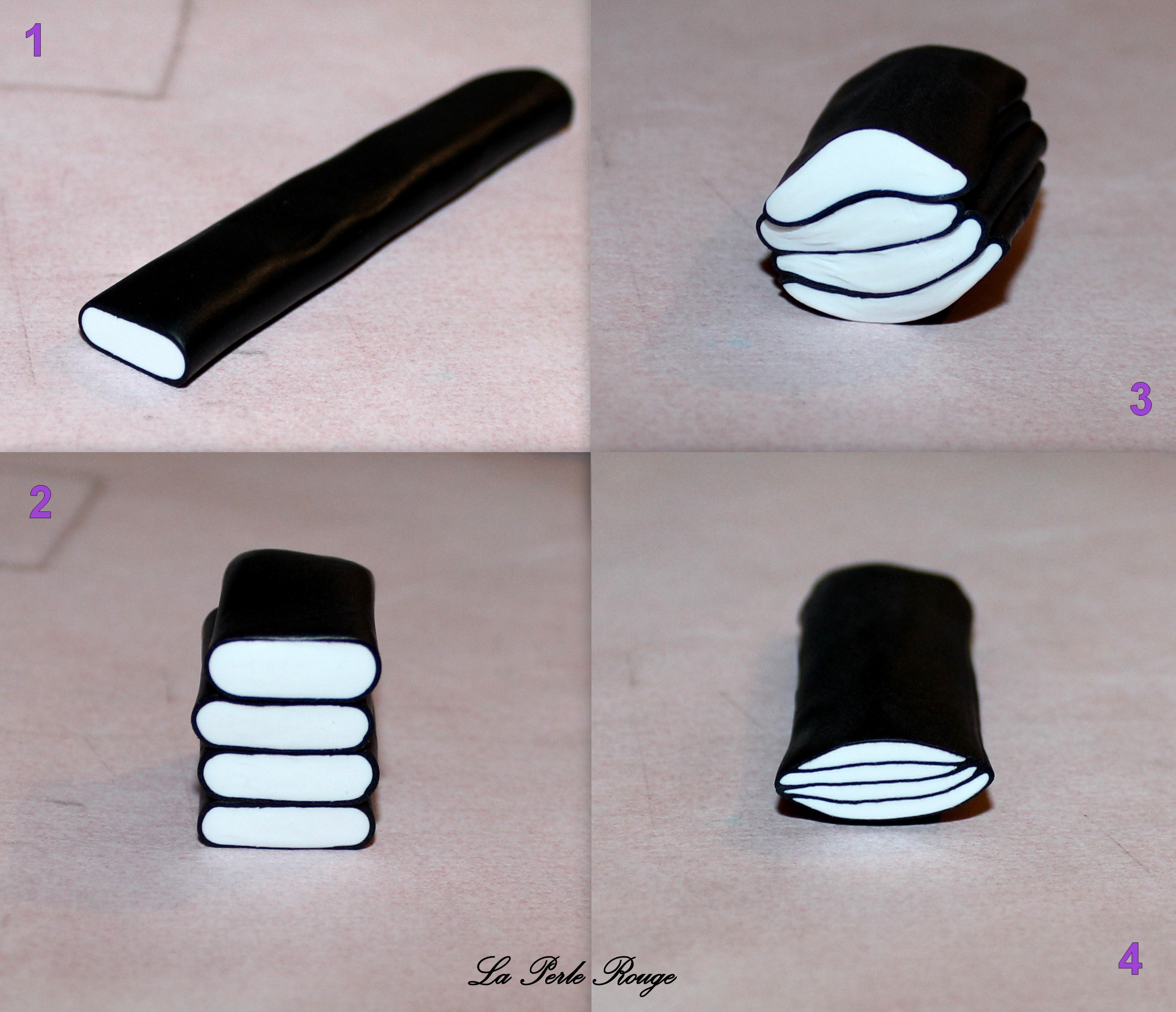 Prenez un des trois morceaux de colombin noir et blanc. Étirez-le un peu et aplatissez-le légèrement. Coupez-le en 4 tronçons que vous allez superposer les uns sur les autres. Faites se rejoindre les tronçons extérieurs  en modelant votre cane comme sur la photo n°3 afin d’obtenir l’image de la photo n°4.