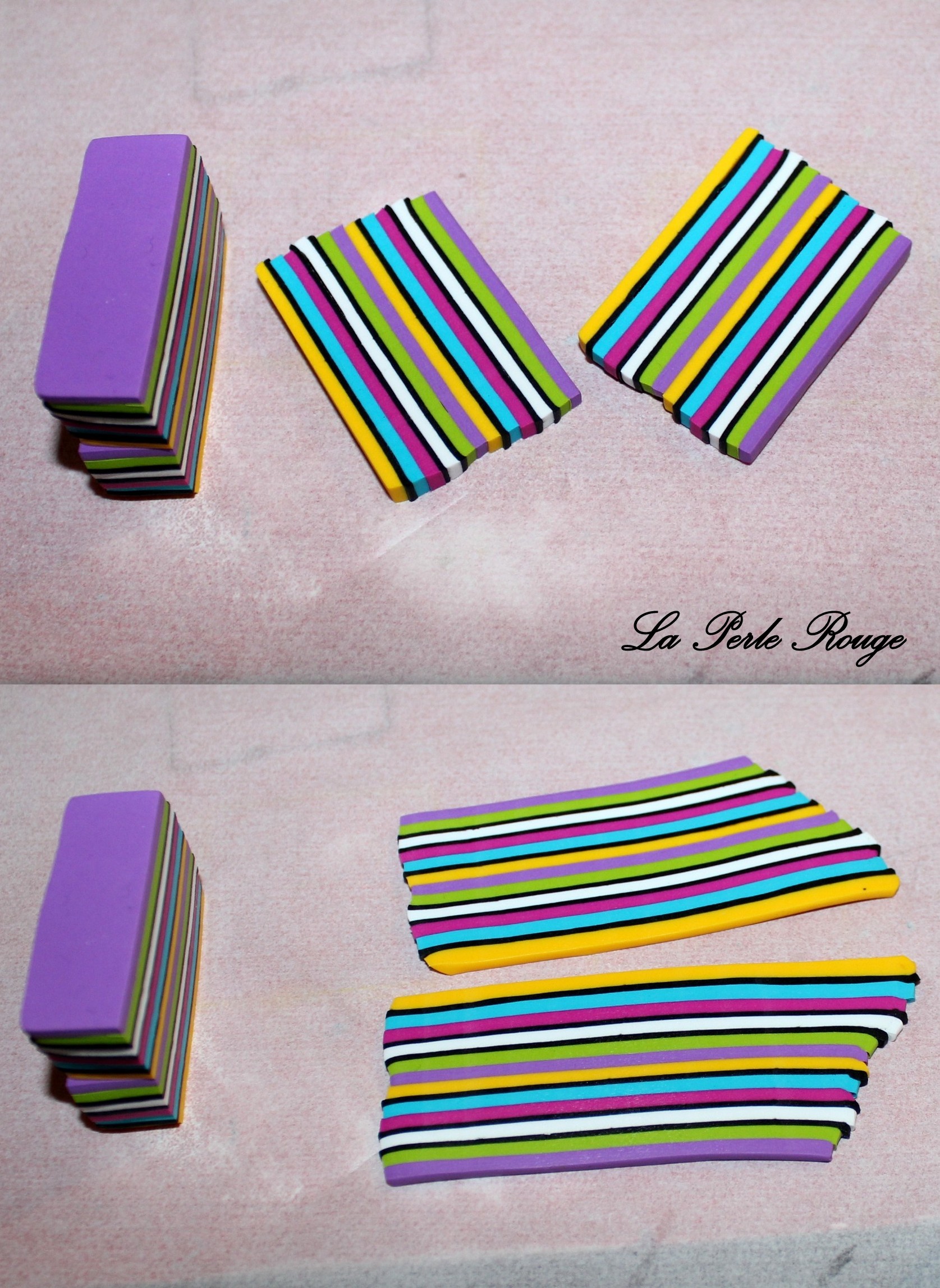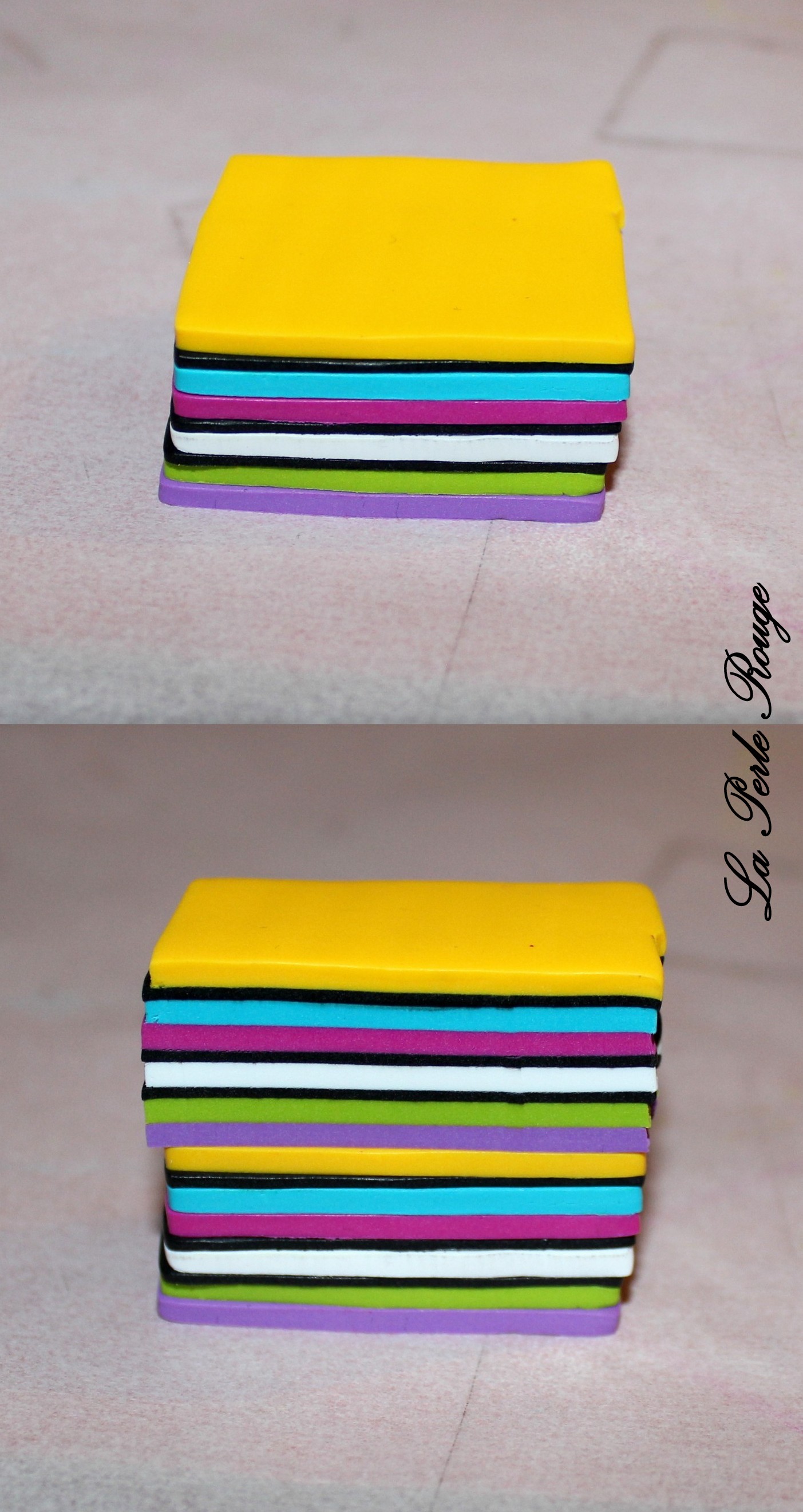 Superposez vos carrés proprement, appuyez légèrement pour les faire bien adhérer entre eux, coupez votre bloc en deux et superposez les deux morceaux afin de multiplier les rayures.