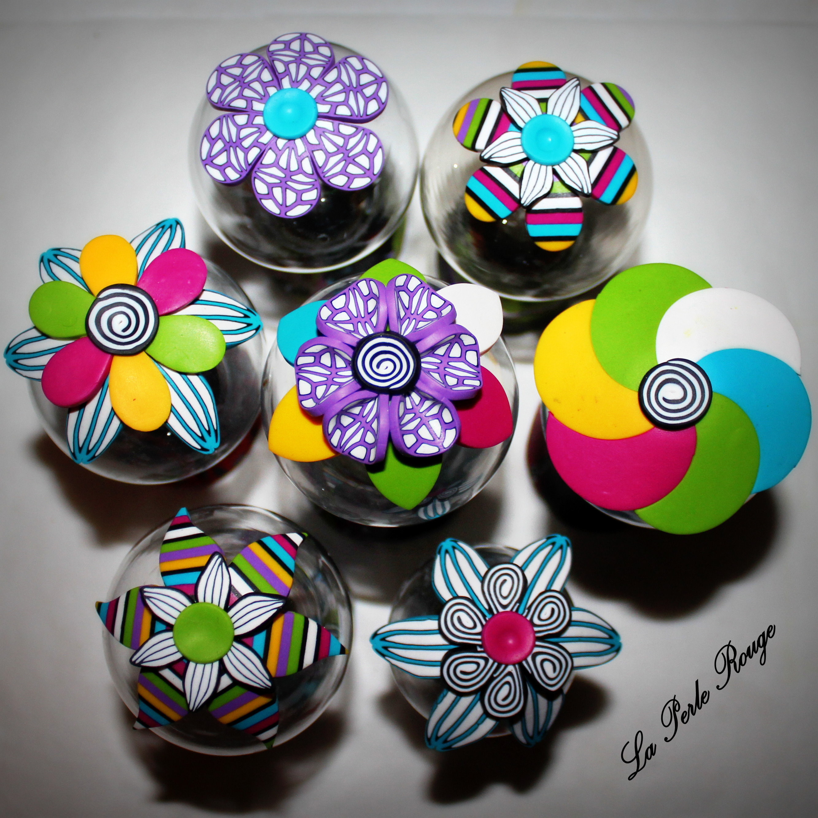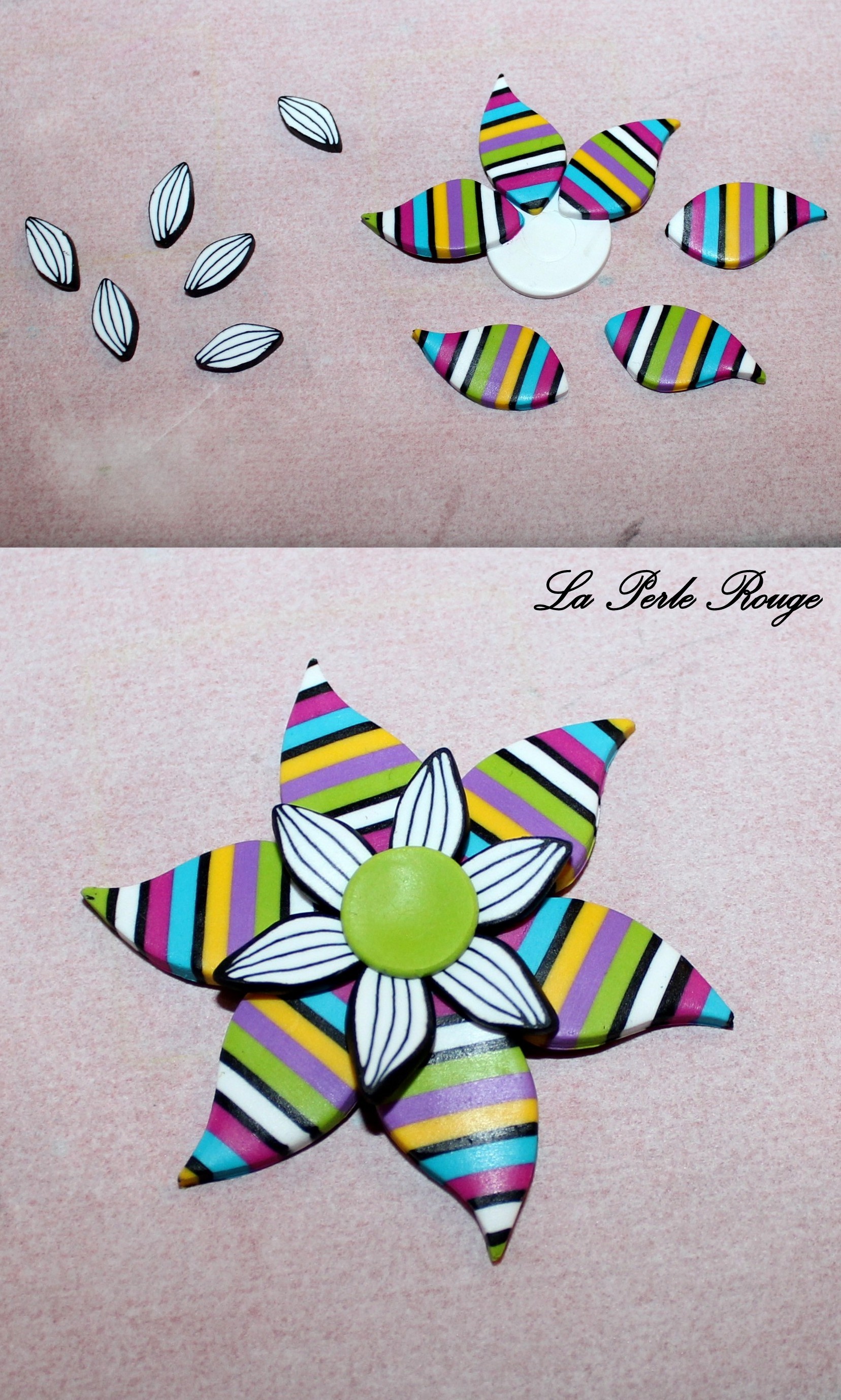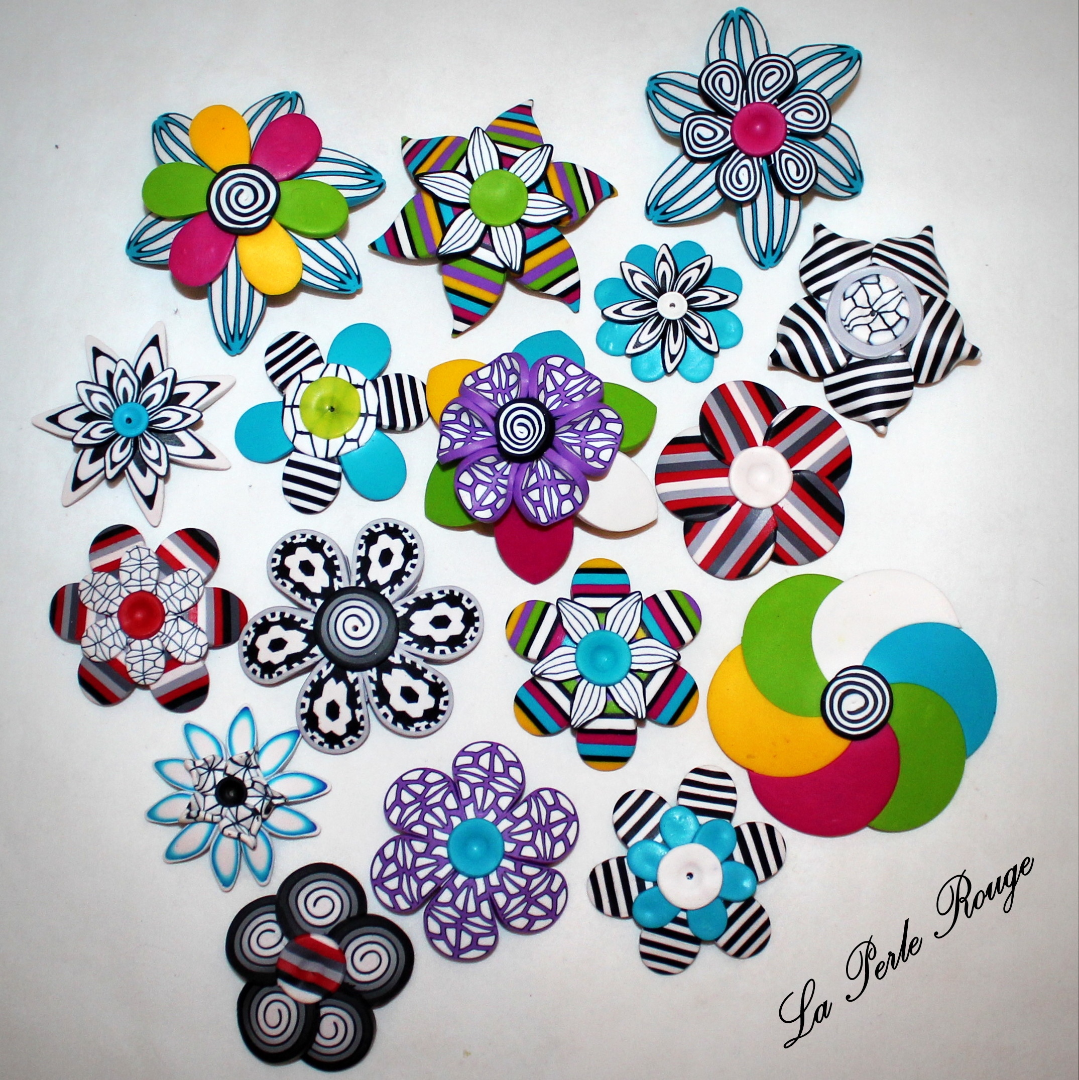 Voilà, je pense que vous avez à présent une bonne idée de ce qu’on peut réaliser à partir de canes très simples. Voici encore deux modèles et puis on va passer à la cuisson. ATTENTION si vous ne possédez pas de perceuse, pensez à percer maintenant vos fleurs en leur cœur. Le but est de percer un trou au moins aussi large que le diamètre du fil de décoration que vous allez passer dedans par la suite.