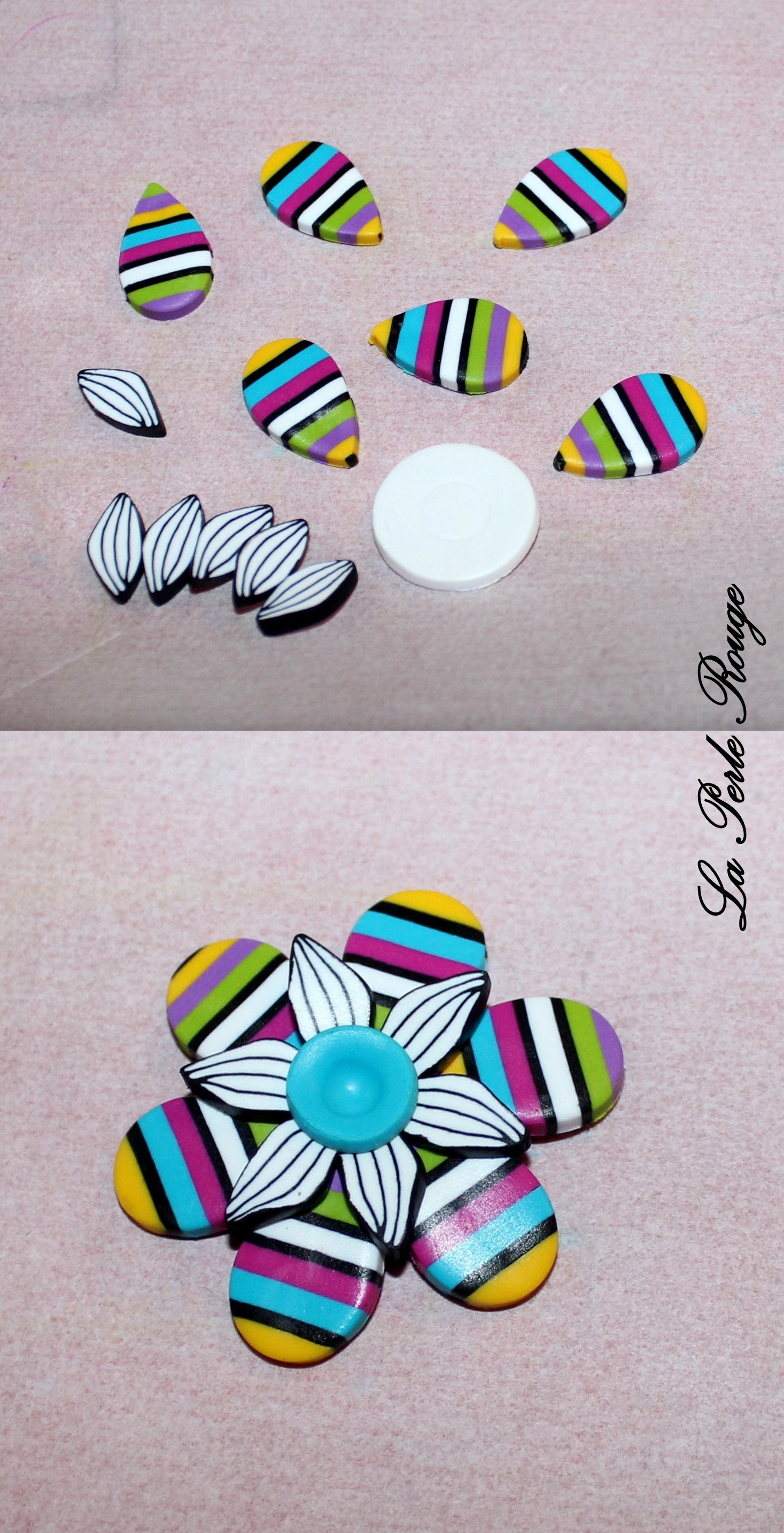 Voici le même exemple avec des pétales rayés découpés à l’emporte-pièce en forme de goutte :