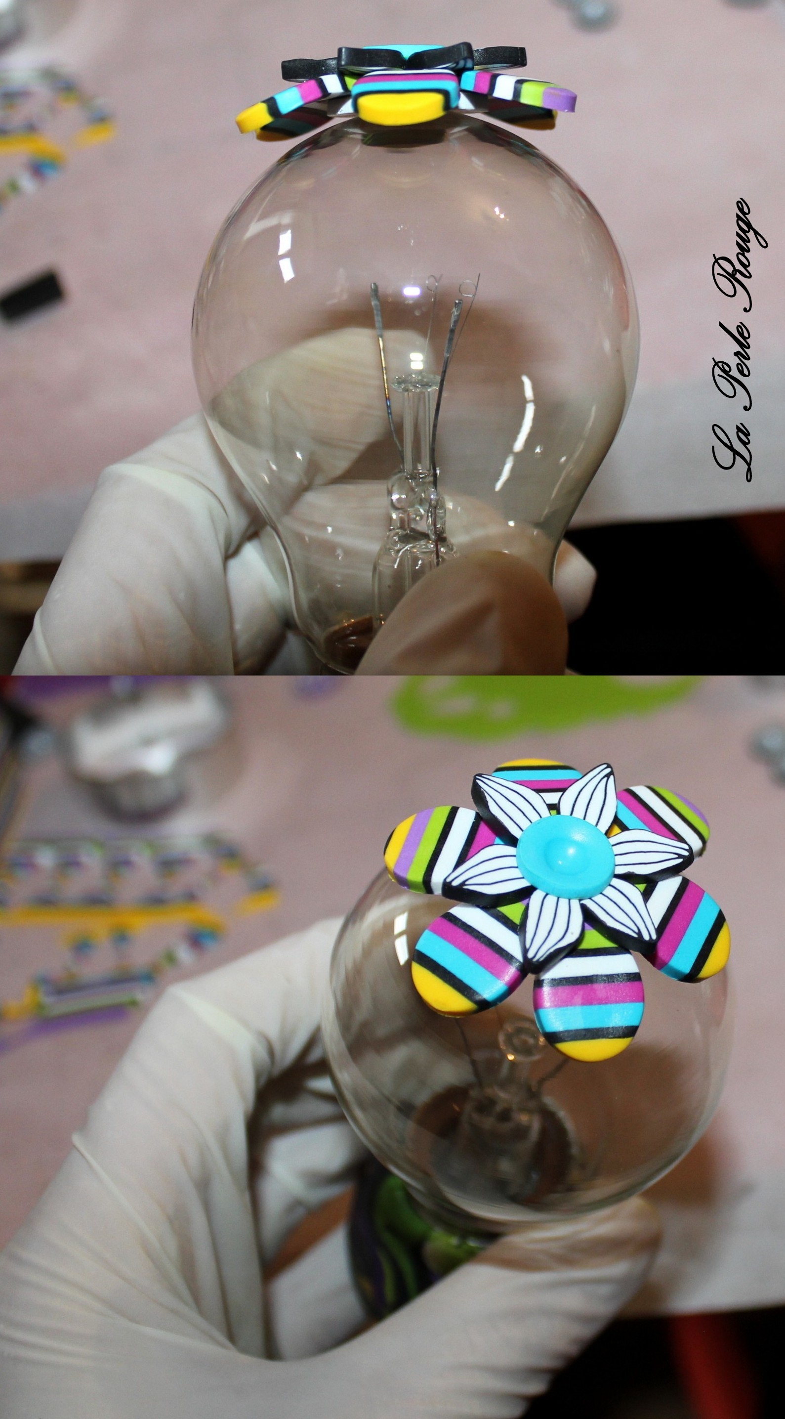 L’effet de votre montage sera plus joli si vos fleurs ont l’air de s’épanouir. Pour ce faire, privilégiez leur cuisson sur une surface courbe. Pour ma part, je me suis fabriqué, il y a longtemps, des supports de cuisson à l’aide d’ampoules défectueuses (bien sûr !) et de pâte beurk (ça évite de  mettre tout ça à la poubelle !!!). Ils sont extrêmement pratiques et efficaces.
