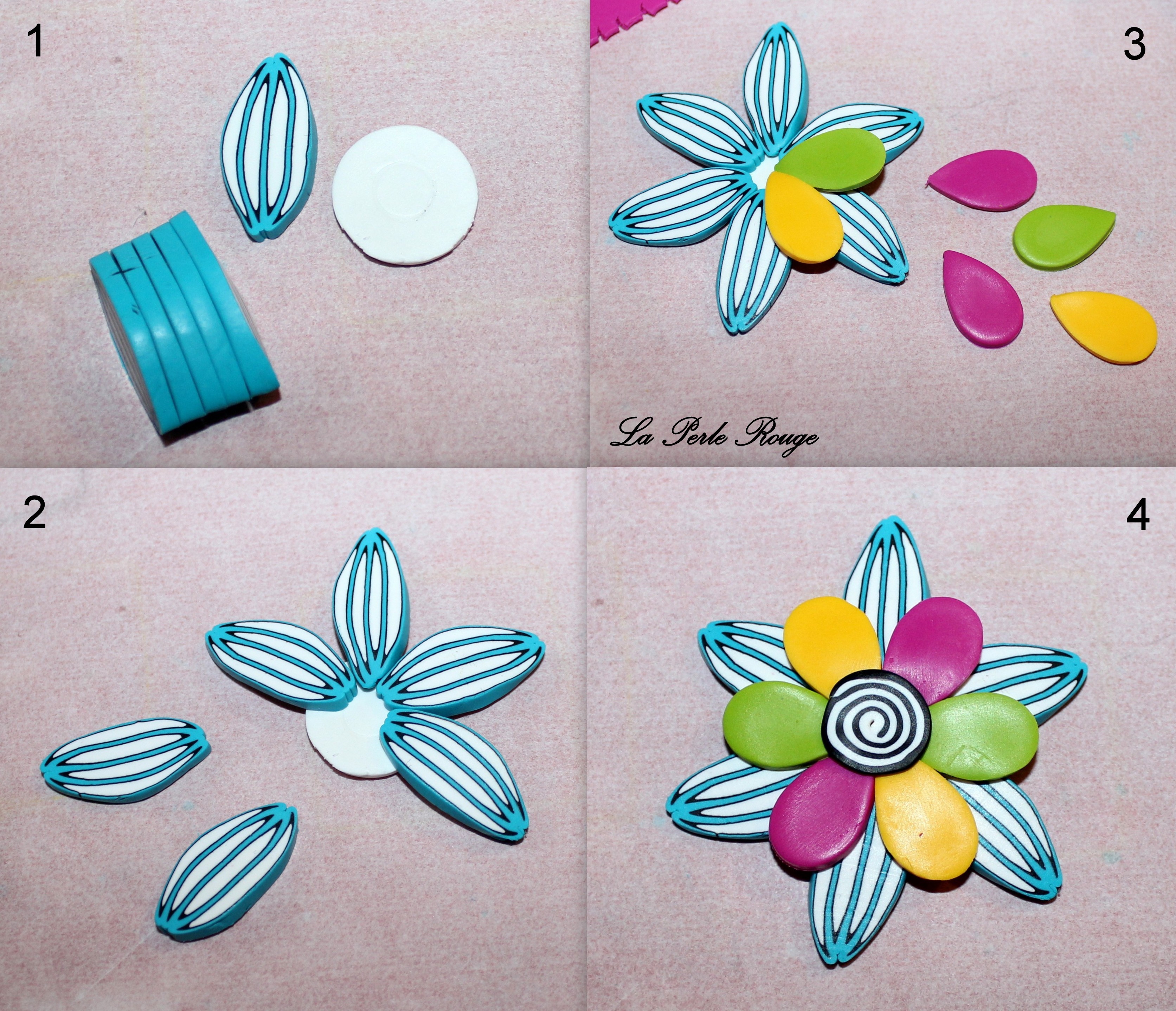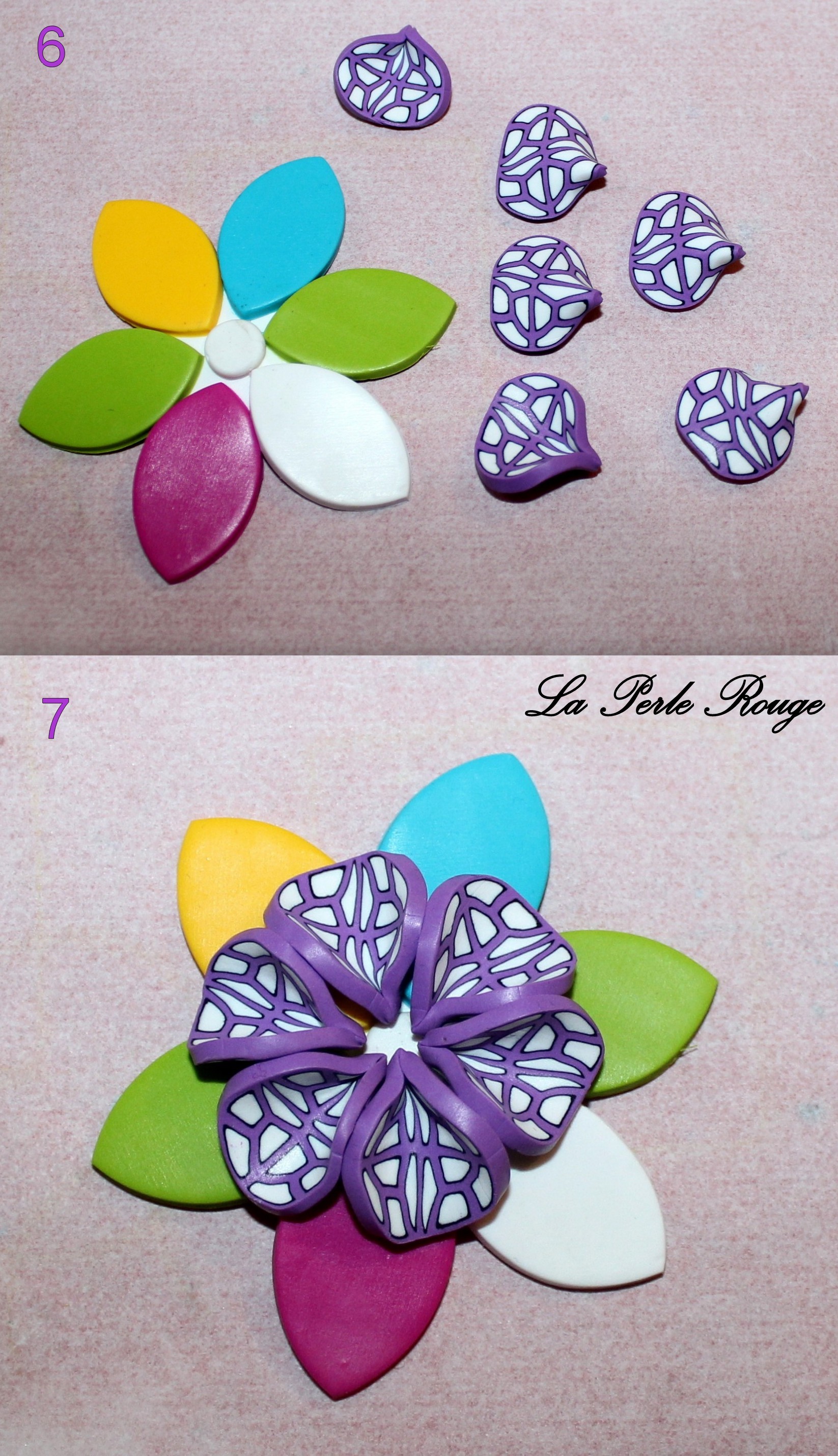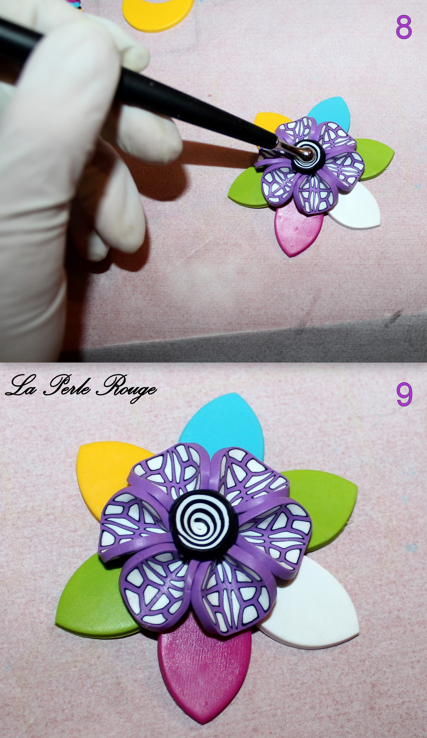 Placez un petit morceau de pâte au centre de votre fleur et venez fixer  délicatement vos jolis pétales à motifs. Terminez en déposant une tranche de cane à spirale. L’idéal est de faire adhérer cette tranche de cœur en lui donnant la forme qui recevra la perle de finition. Servez-vous pour cela d’un outil de modelage « boule » ou de quelque chose qui y ressemble (vous pouvez fabriquer auparavant votre propre outil de modelage en cuisant une petite boule de pâte sur une tige !!!).