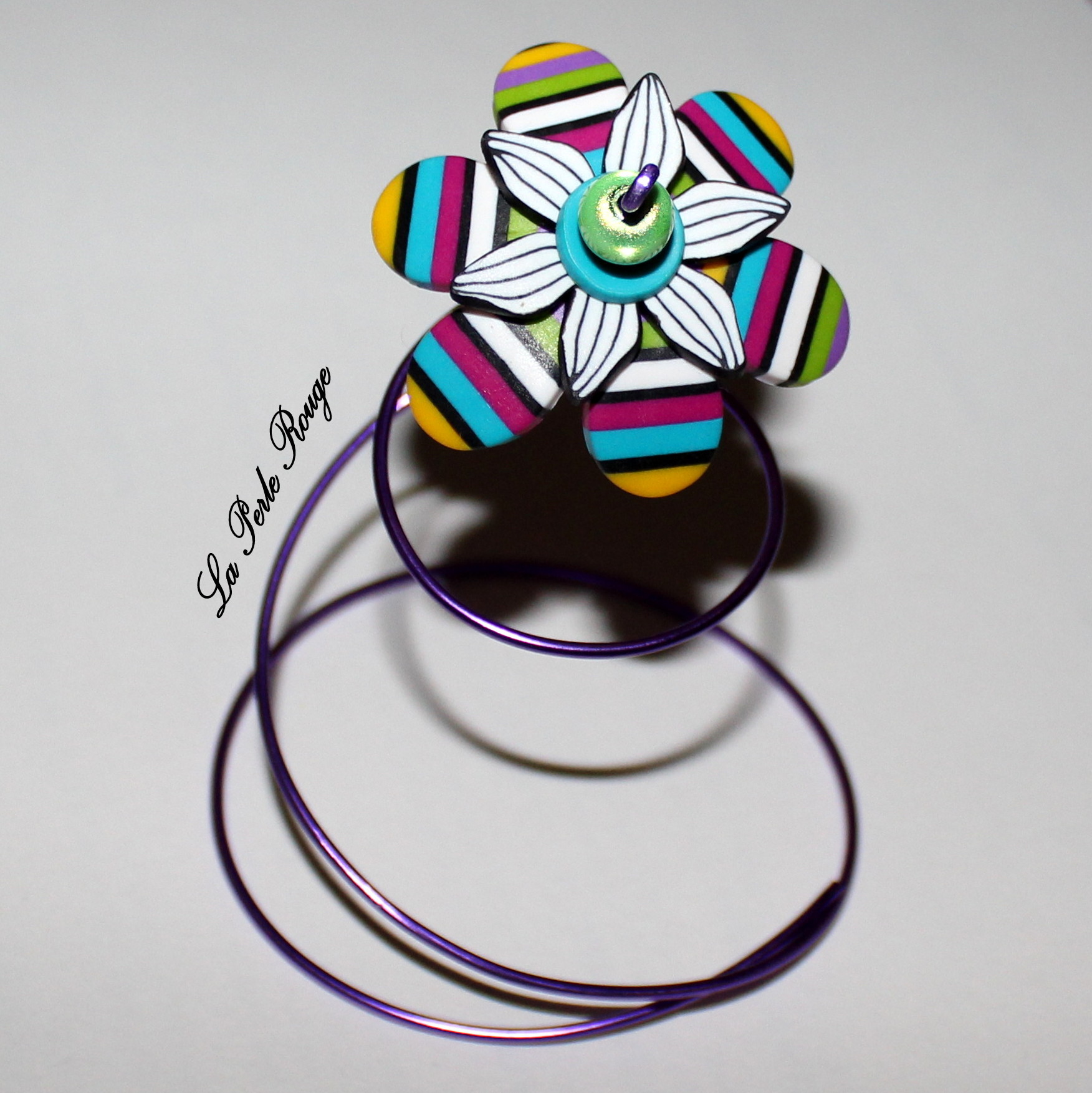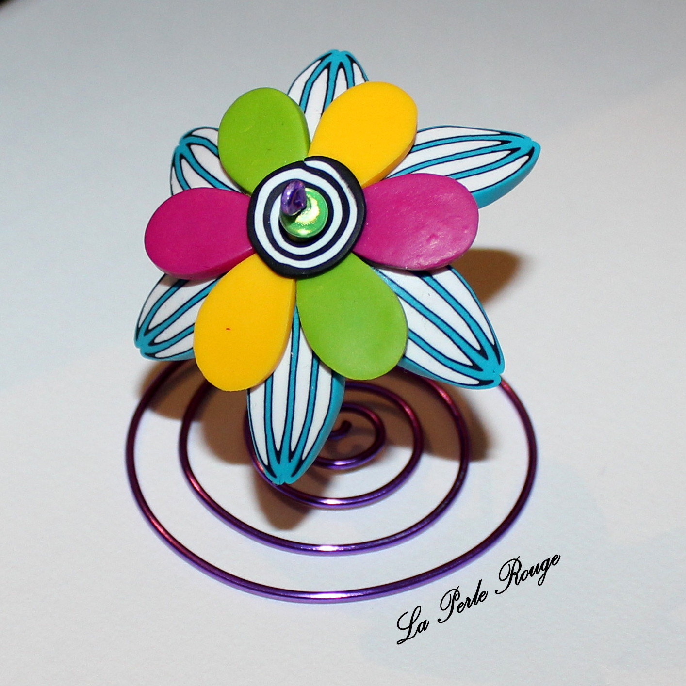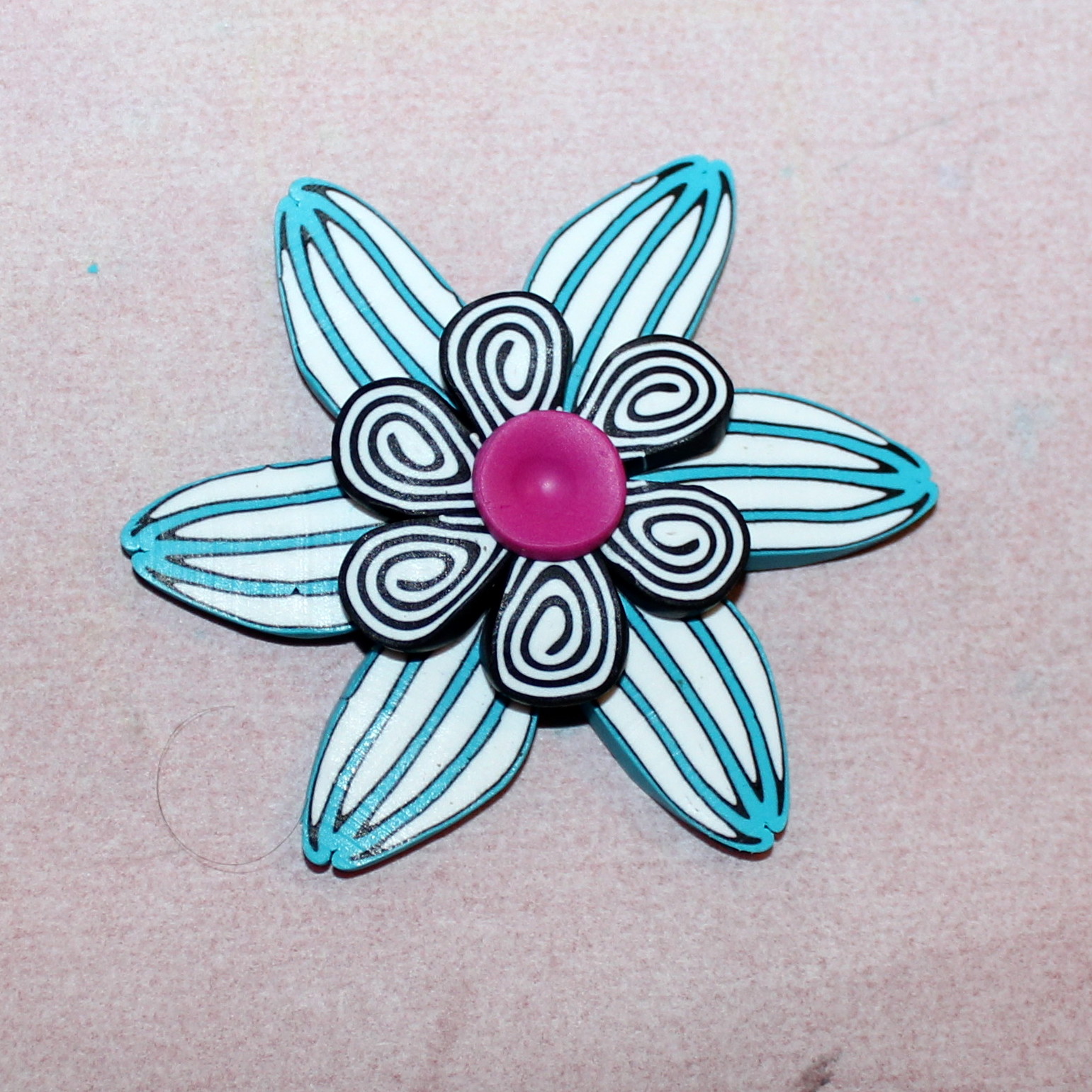 Placez un petit morceau de pâte au centre de votre fleur et venez fixer  délicatement vos jolis pétales à motifs. Terminez en déposant une tranche de cane à spirale. L’idéal est de faire adhérer cette tranche de cœur en lui donnant la forme qui recevra la perle de finition. Servez-vous pour cela d’un outil de modelage « boule » ou de quelque chose qui y ressemble (vous pouvez fabriquer auparavant votre propre outil de modelage en cuisant une petite boule de pâte sur une tige !!!).