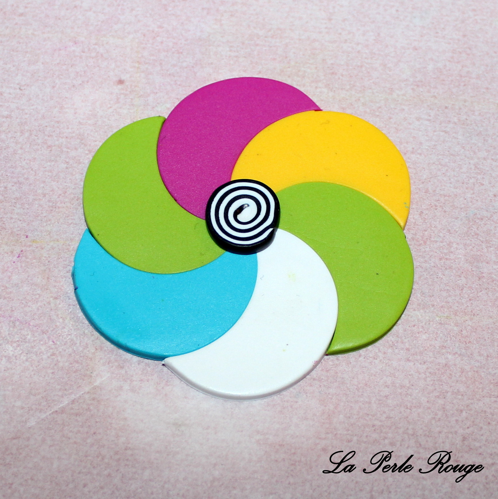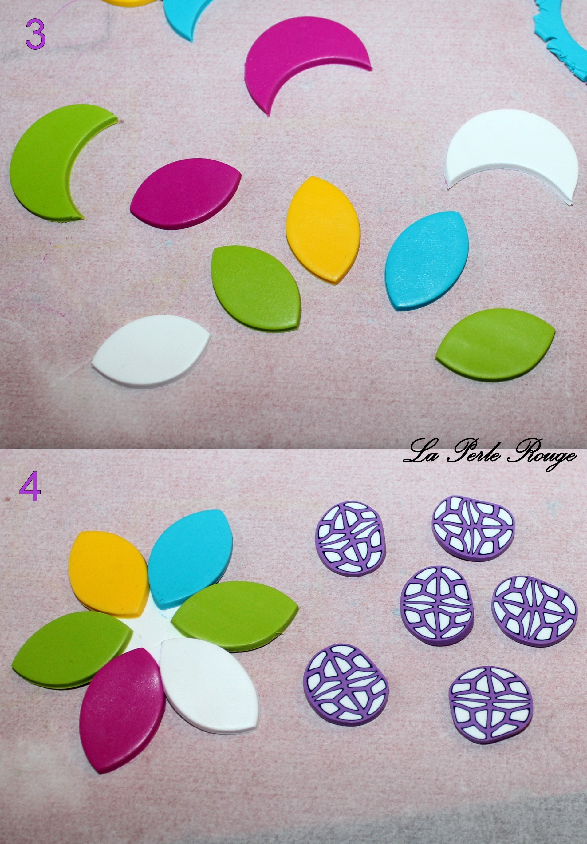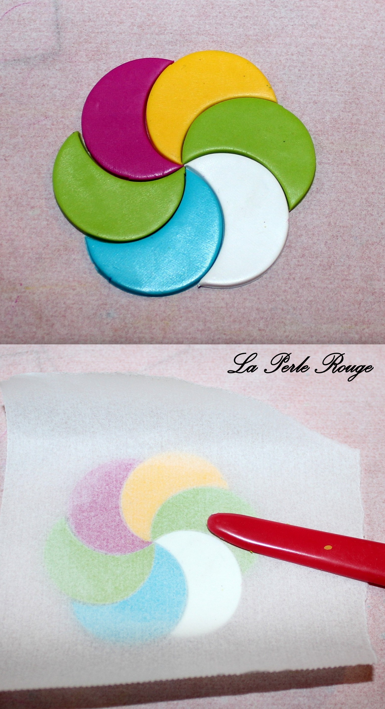 Cette fois, vous n’êtes pas obligés de commencer sur une petite base ronde. Assemblez toutes les chutes des disques de couleurs dans lesquels vous aviez découpé vos pétales en amande comme sur la photo. Lissez doucement le tout à travers une feuille de papier sulfurisé en pensant à décoller régulièrement le papier du dessus et du dessous. (Attention, souvenez-vous qu’il ne faut pas re-déposer sur votre pièce une feuille de papier sulfurisé qui a été décollée, utilisiez un nouveau morceau !). Terminez par un cœur et mettez de côté.