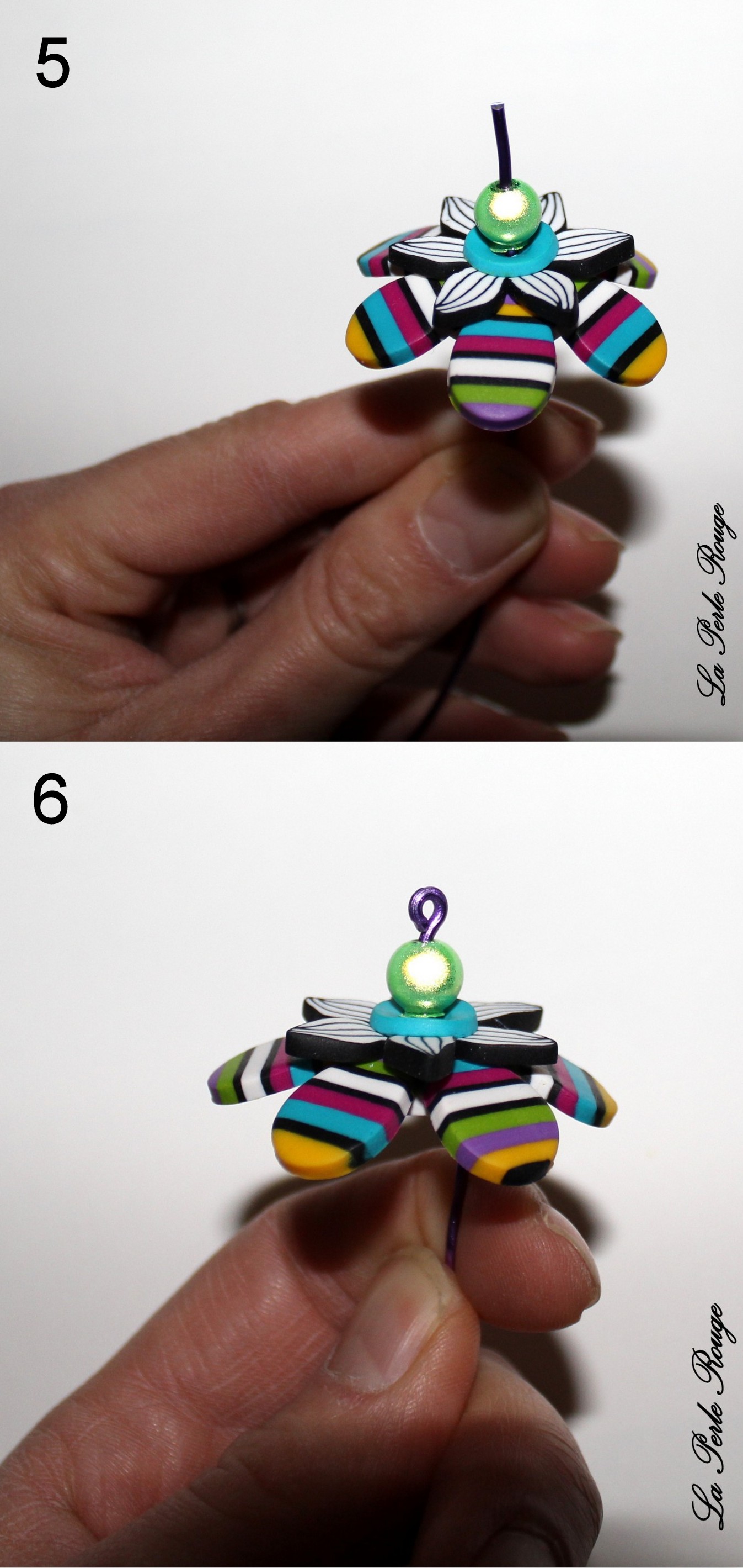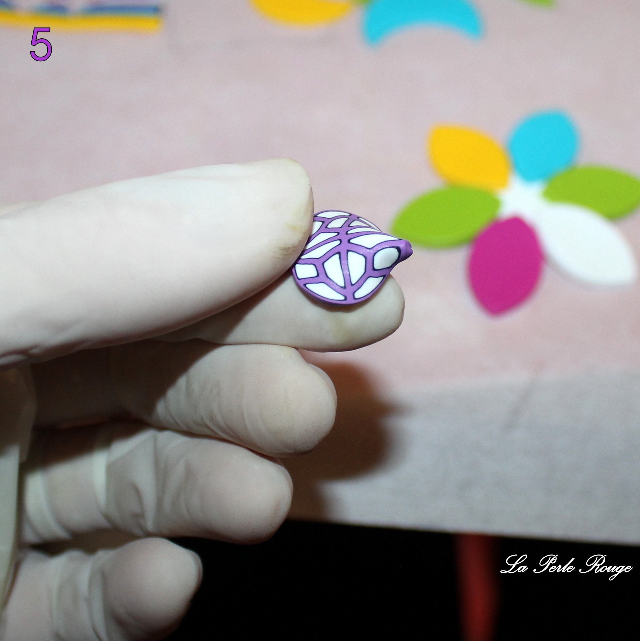 Toujours sur une petite base ronde, positionnez vos pétales en amande. Avec votre lame souple, coupez des tranches de votre cane à motifs et modelez-les comme sur la photo n°5. Pour ce faire, déposez la tranche sur l’extrémité d’un doigt et venez pincer LÉGÈREMENT un côté de la tranche pour la déformer.