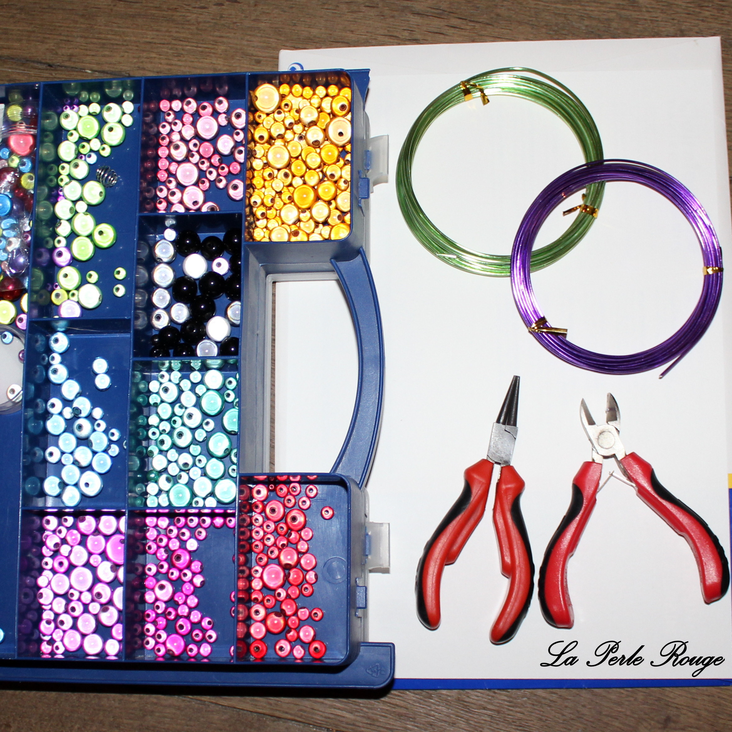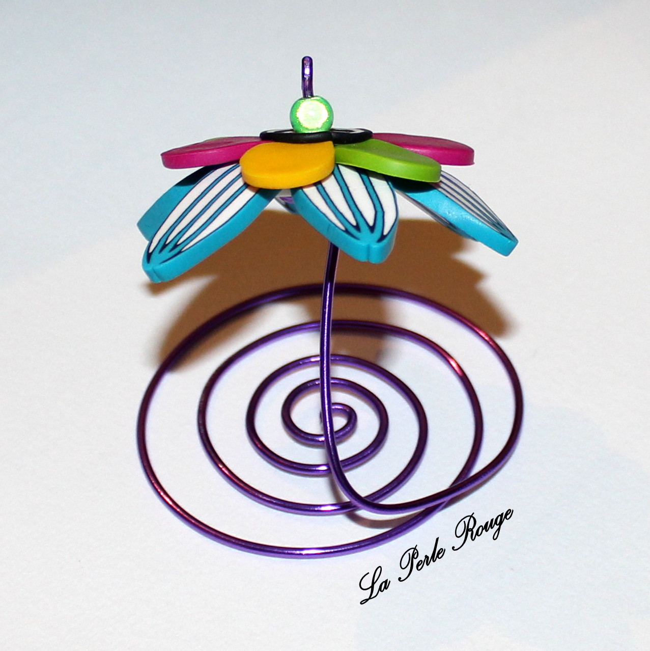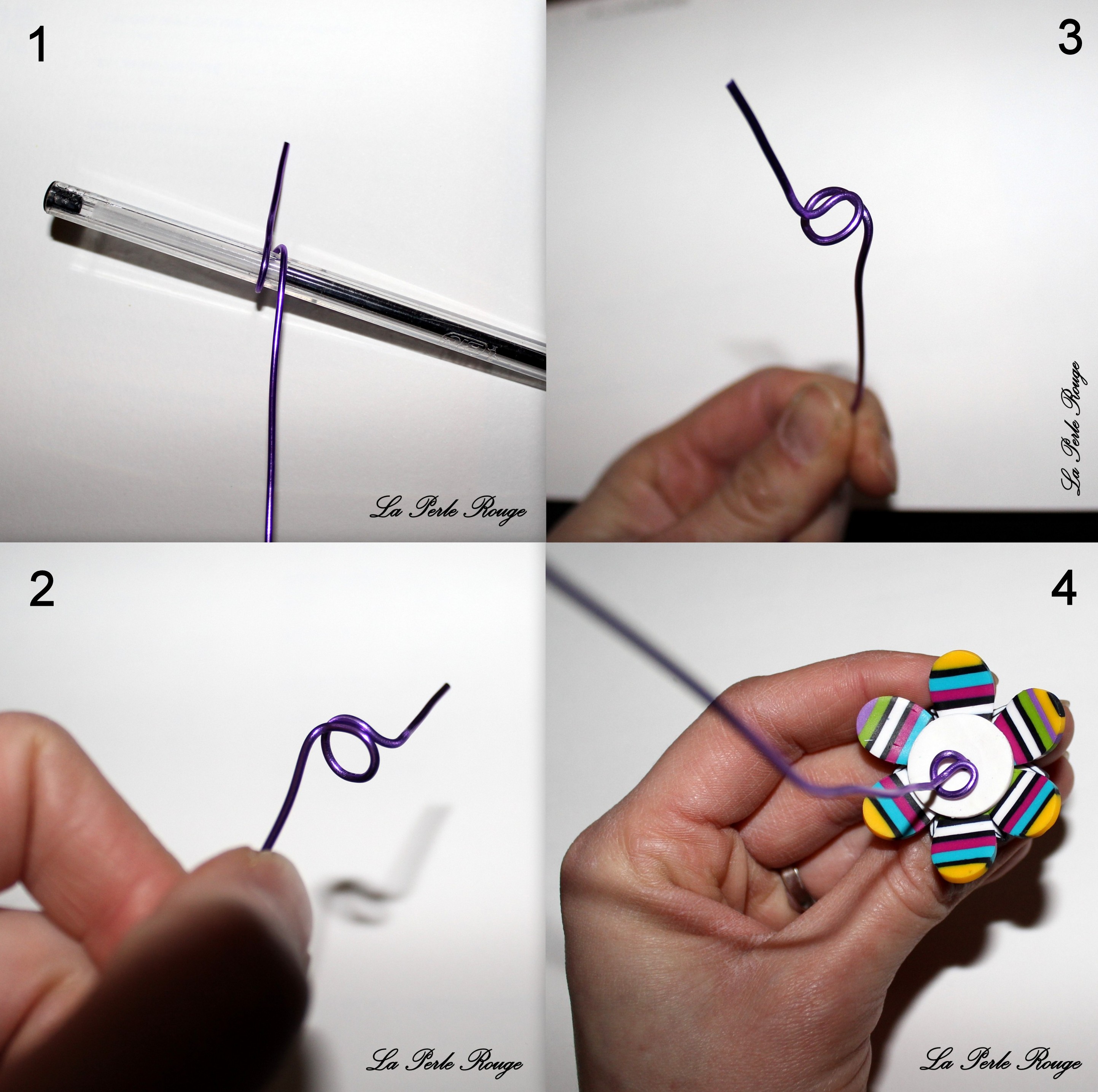 Vos fleurs sont cuites et percées en leur cœur, il est temps de réaliser quelques montages. Vous avez besoin de fil aluminium de couleur, de perles rondes dans lesquelles on peut passer le fil alu, d’une pince ronde, d’une pince coupante, d’un stylo et d’un objet conique comme un petit entonnoir ou une bouteille de vin.