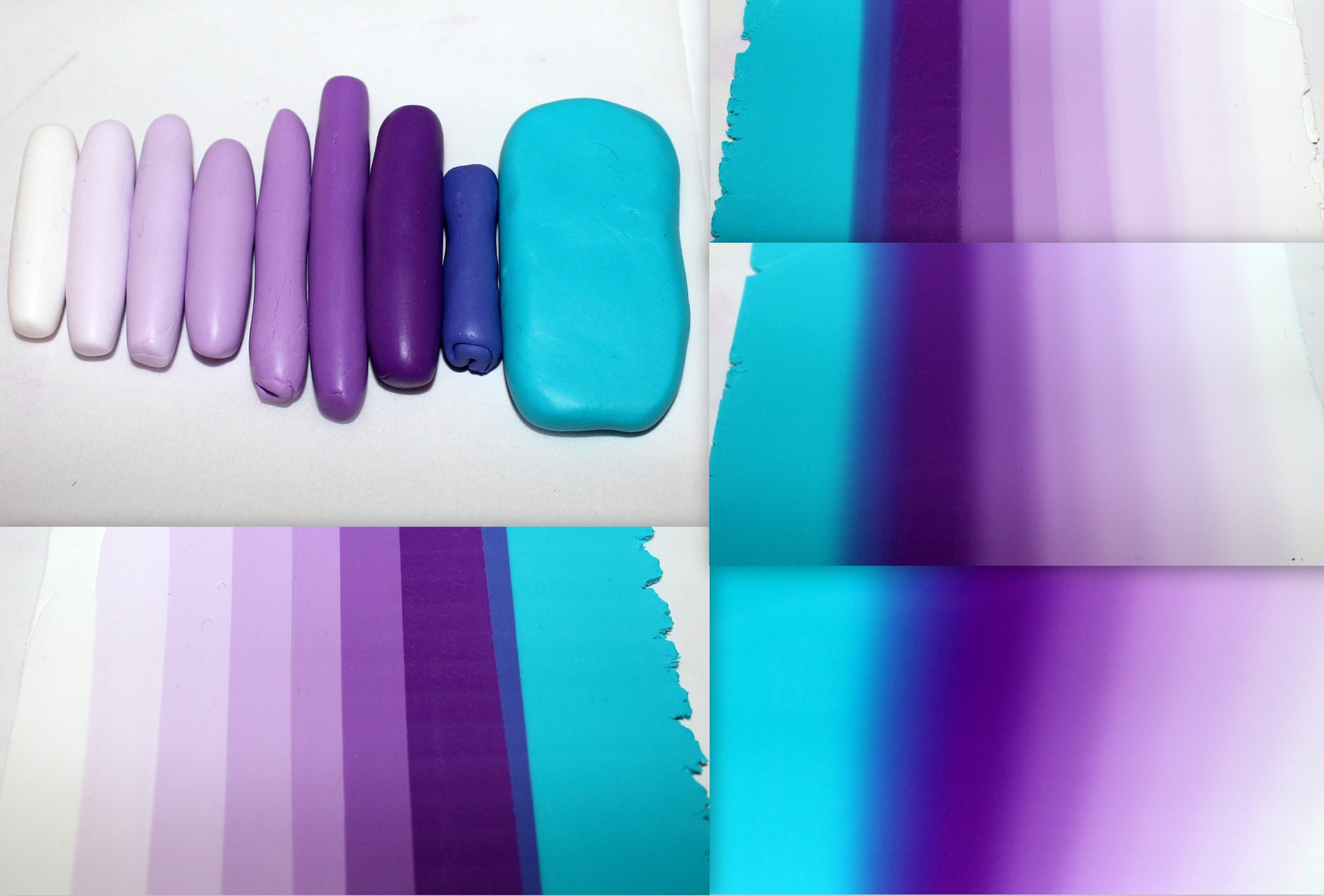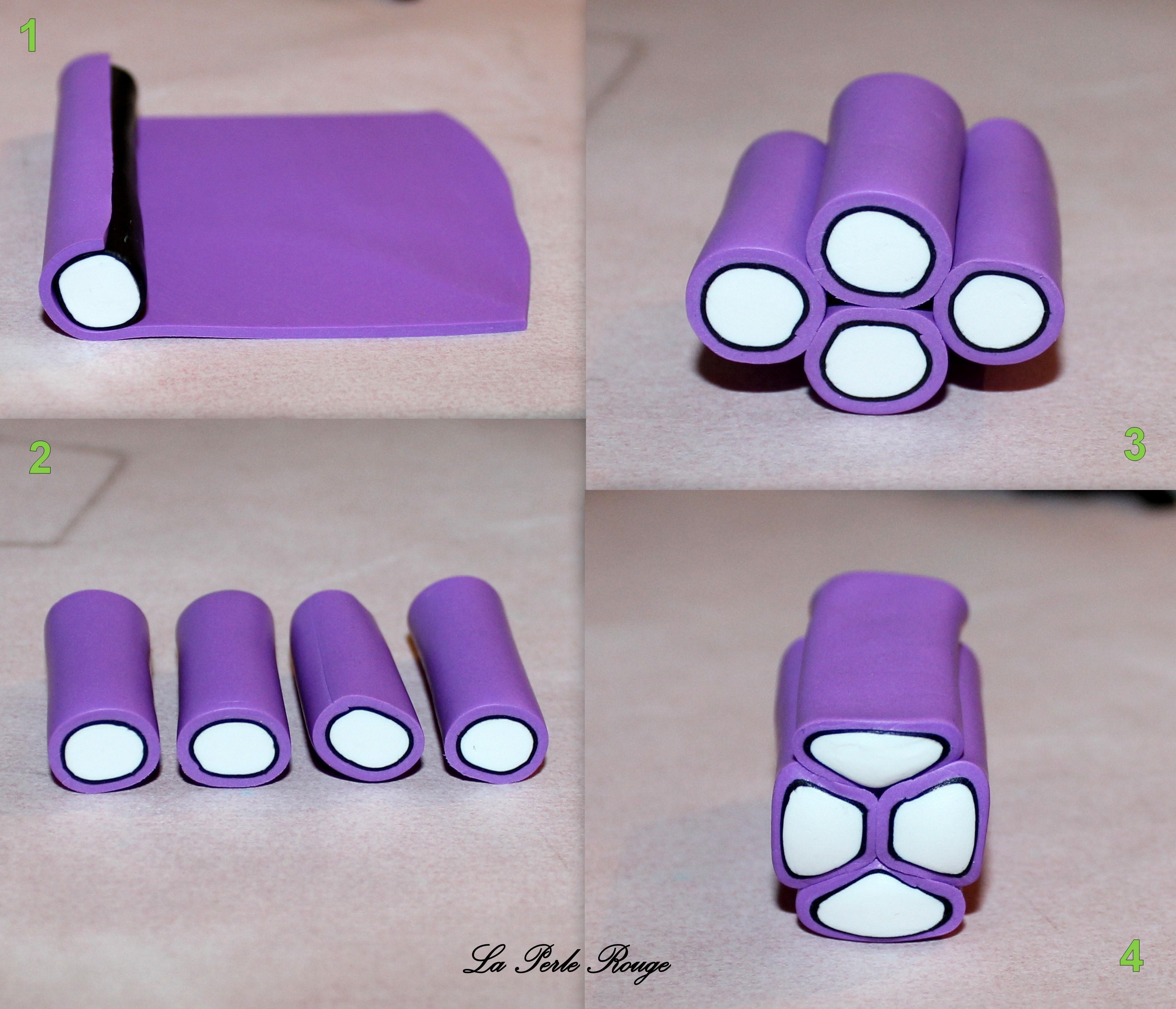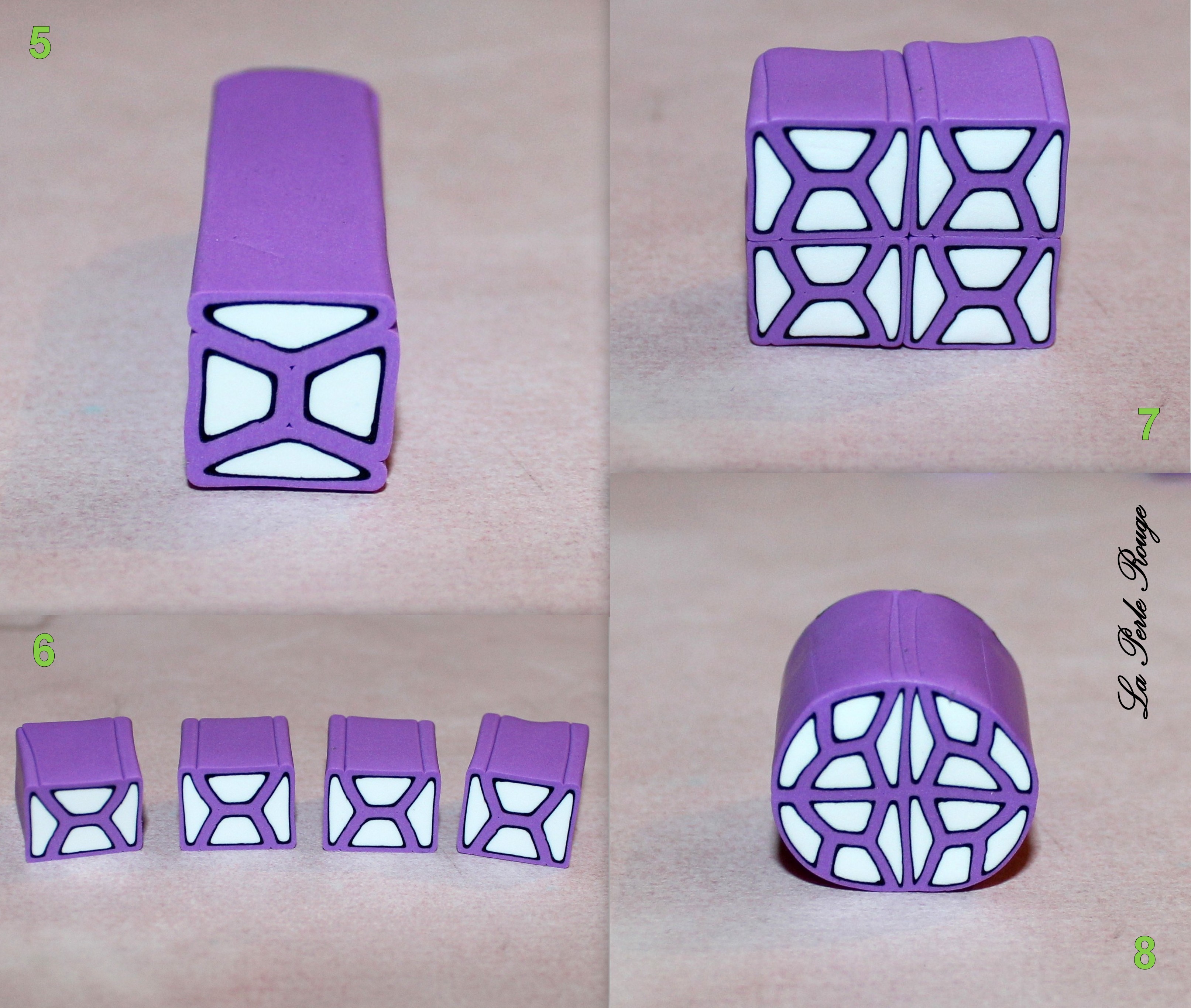 Cerclez votre colombin d’une plaque de couleur (ici violette… ou mauve… ou lilas… je n’ai jamais vraiment su faire la différence, j’avoue…) passée au cran n°5 ou 4 de votre machine à pâte. Étirez la cane cible obtenue et coupez-la en 4 tronçons que vous allez associer comme sur la photo n°3. Modelez le tout afin de donner à votre cane une section carrée. Étirez-la et recommencer l’opération en coupant de nouveau 4 morceaux et en les assemblant comme sur la photo n°7. Écrasez légèrement les angles de votre cane afin de la transformer de nouveau en une cane ronde. Mettez-la de côté.