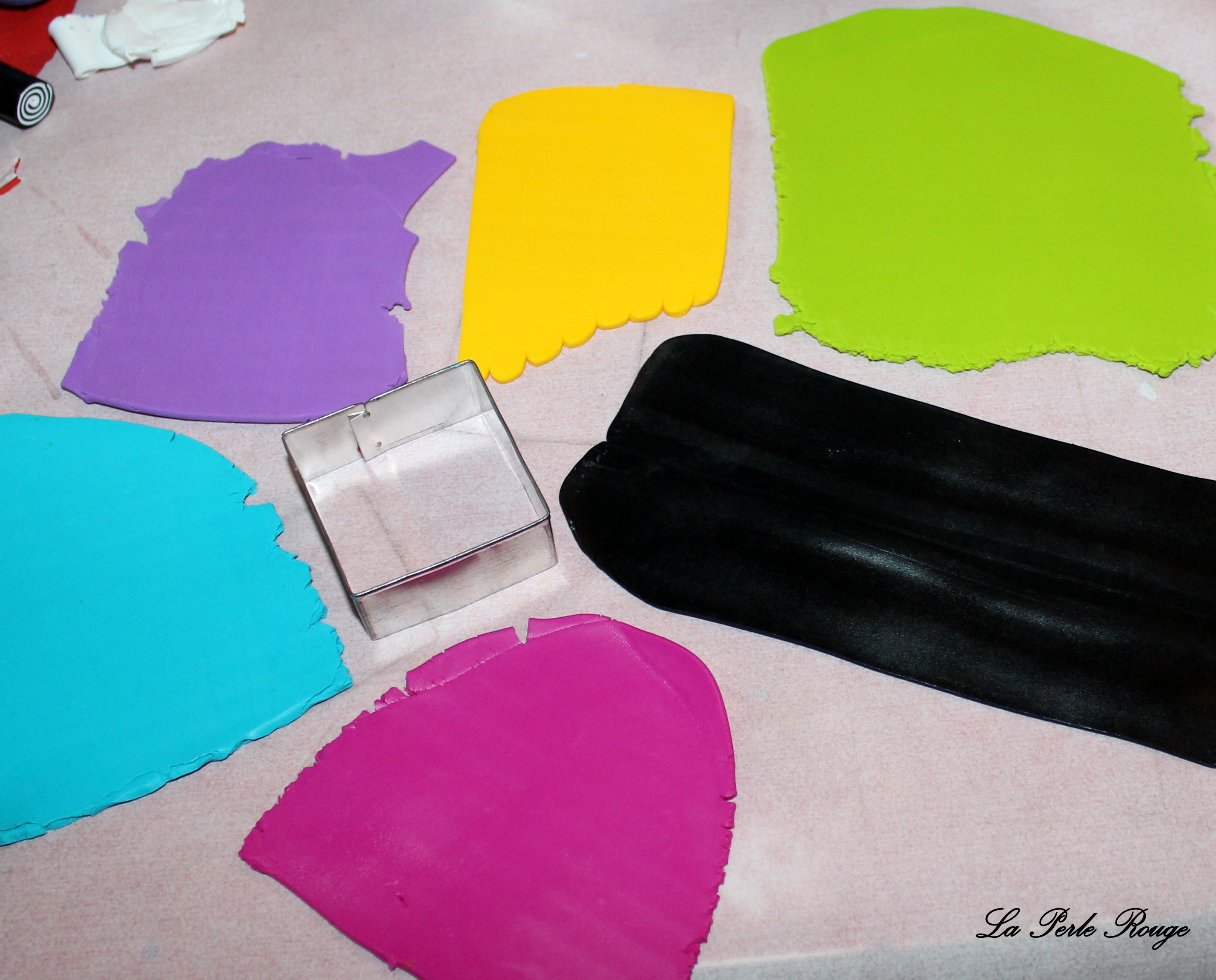 Préparez un bloc rayé en découpant à l’emporte-pièce des carrés de chaque couleur de l’épaisseur la plus large de votre machine à pâte (soit le réglage n°6 pour moi) à l’exception de la plaque noire que vous ferez plus fine (réglage n°3) et dont vous tirerez 3 carrés.