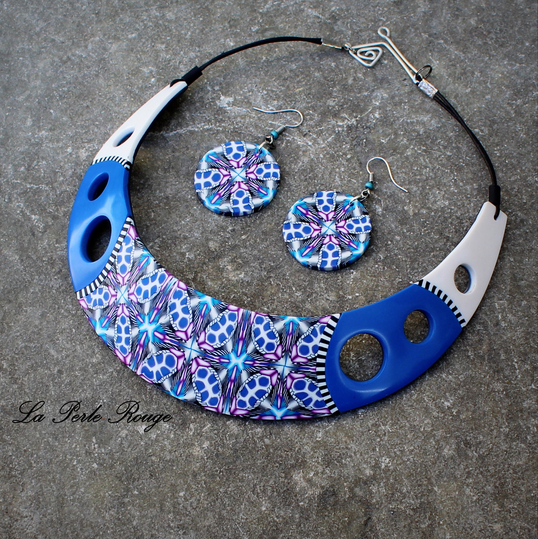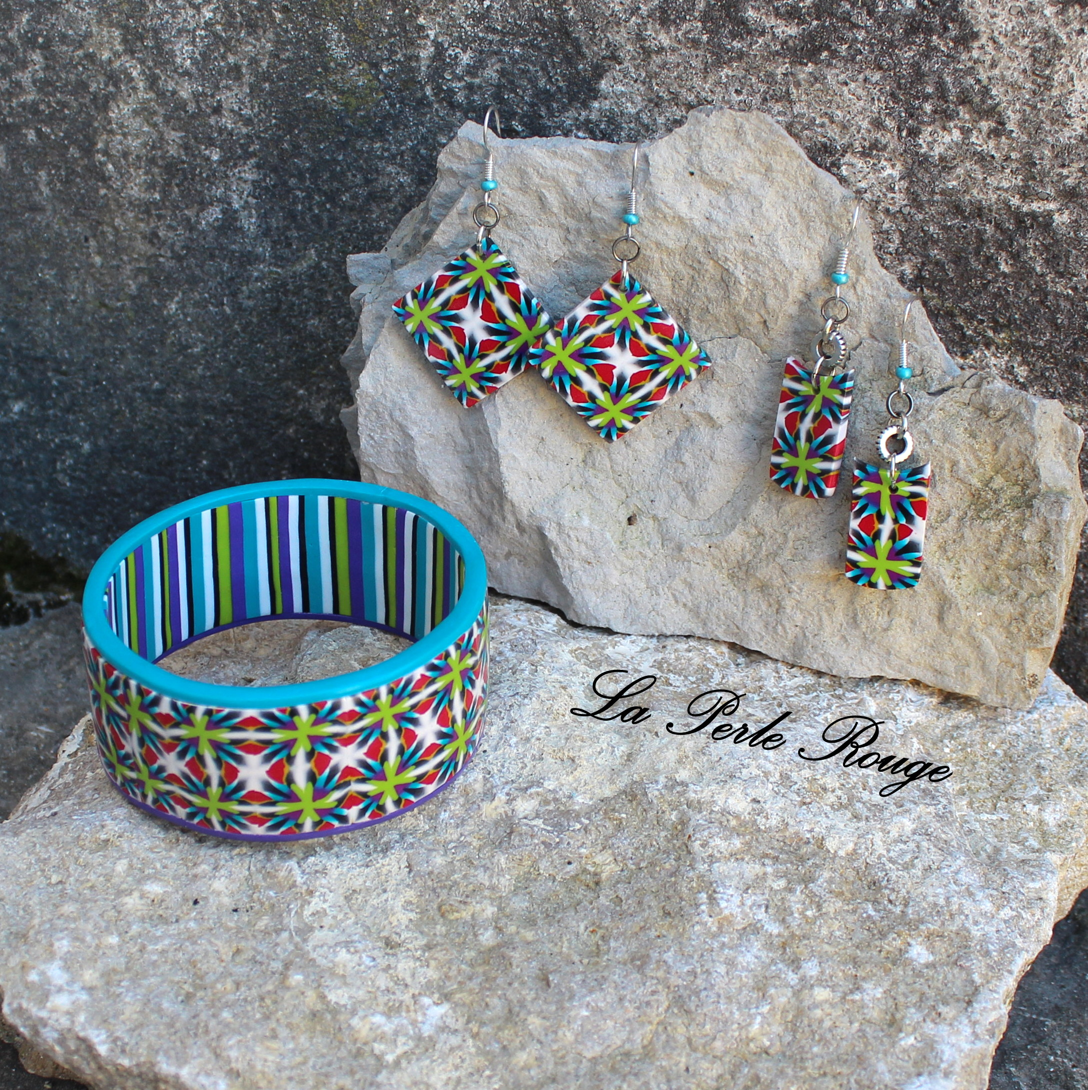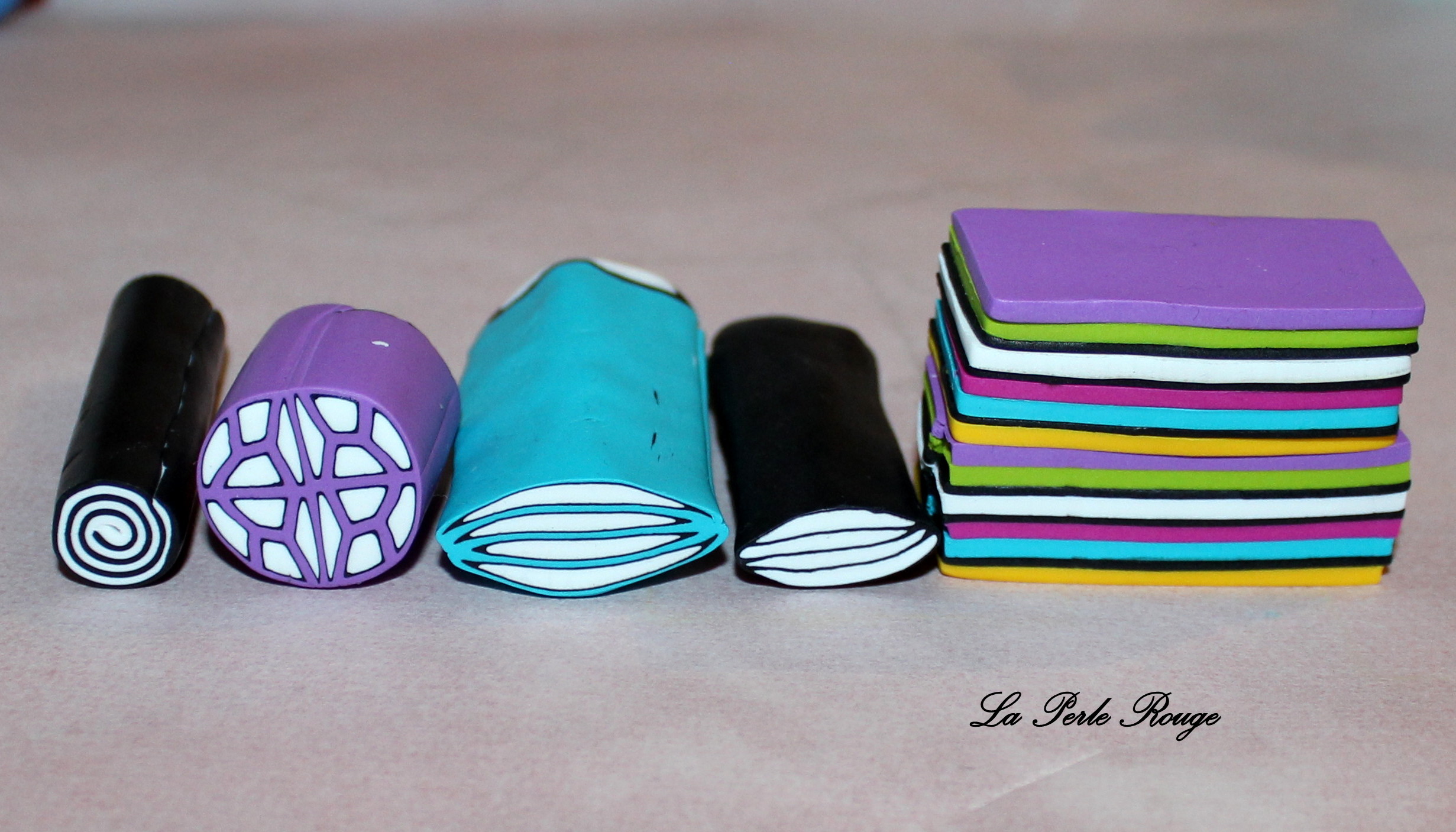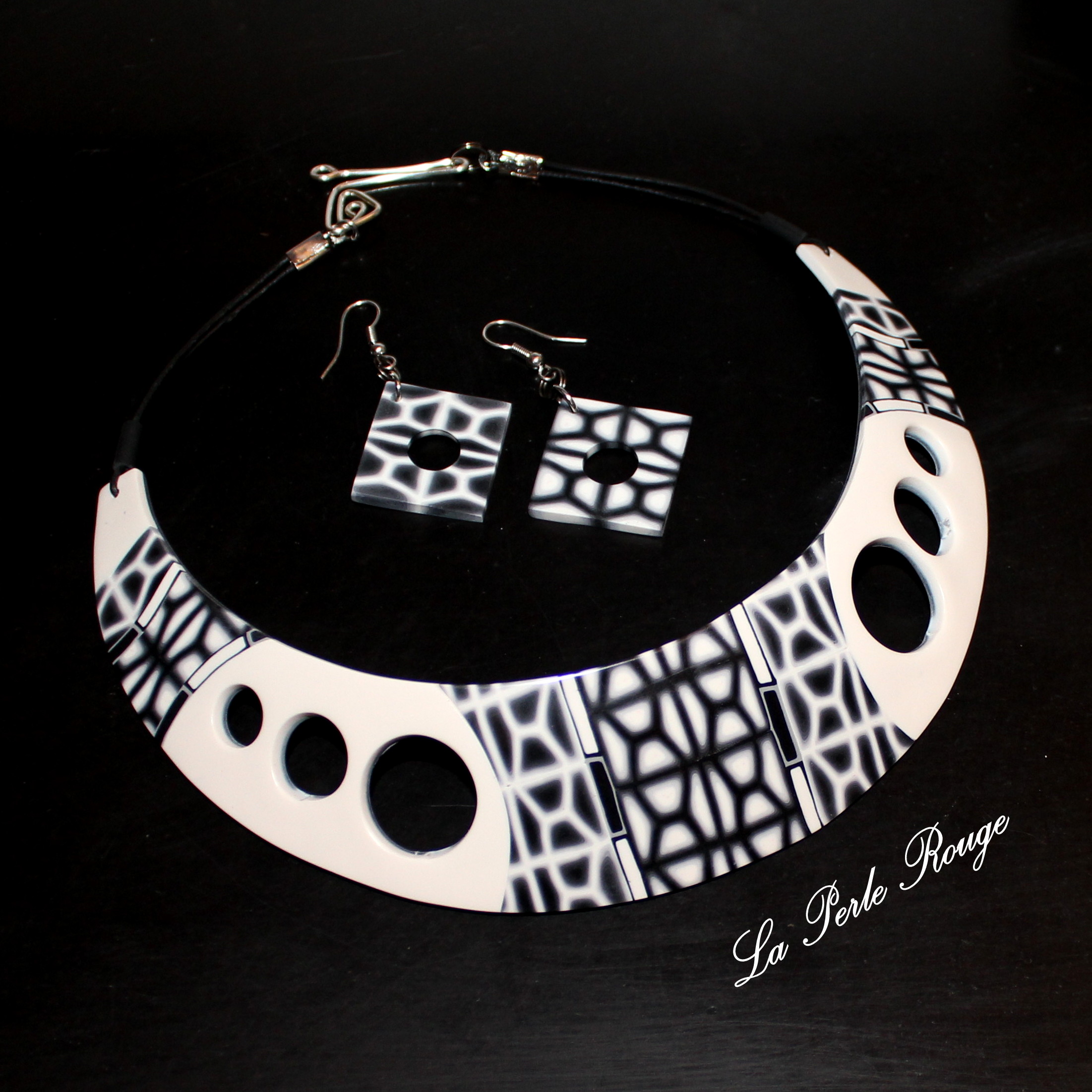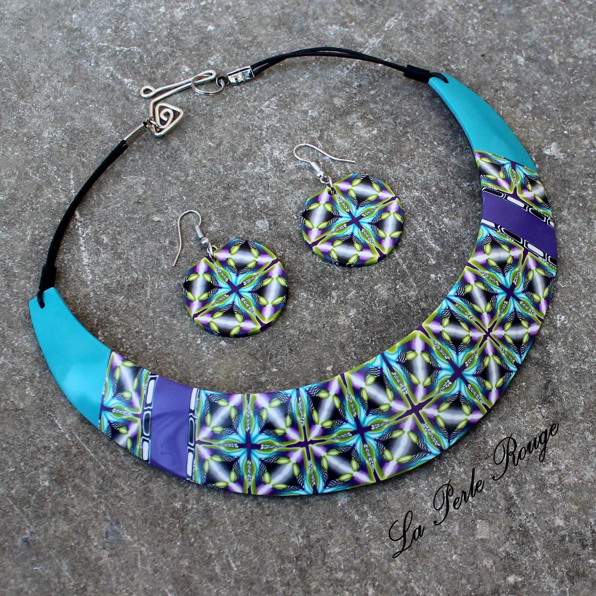 Et pour terminer, j’ai fait quelque chose qui ne m’arrive jamais, et je trouve que ça n’est pas très normal, JE ME SUIS FAIT UNE PARURE !!! pour moi, rien que pour moi, je me sens comblée ! Les motifs noir et blanc sont l’application de la cane géométrique noire et blanche du tuto de la semaine passée mais avec des canes dégradées à la place du colombin blanc cerclé de noir.