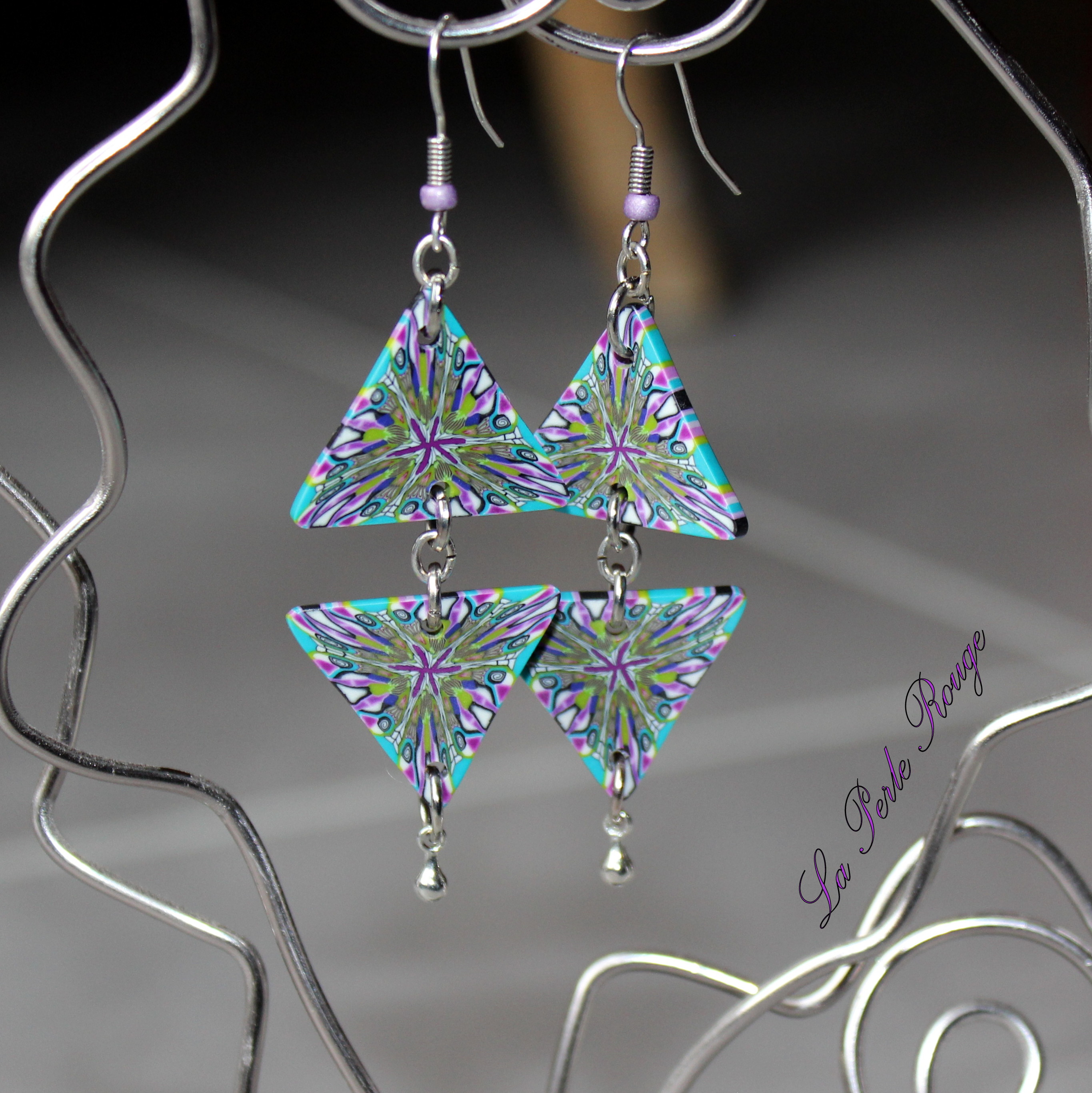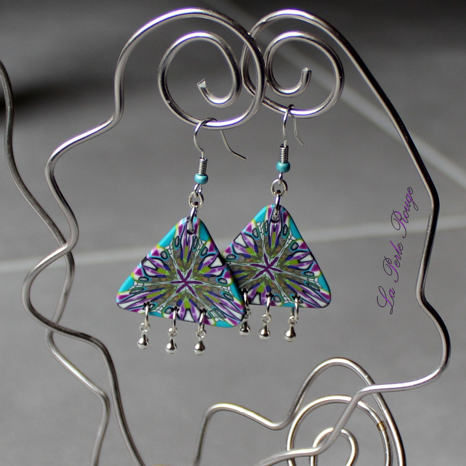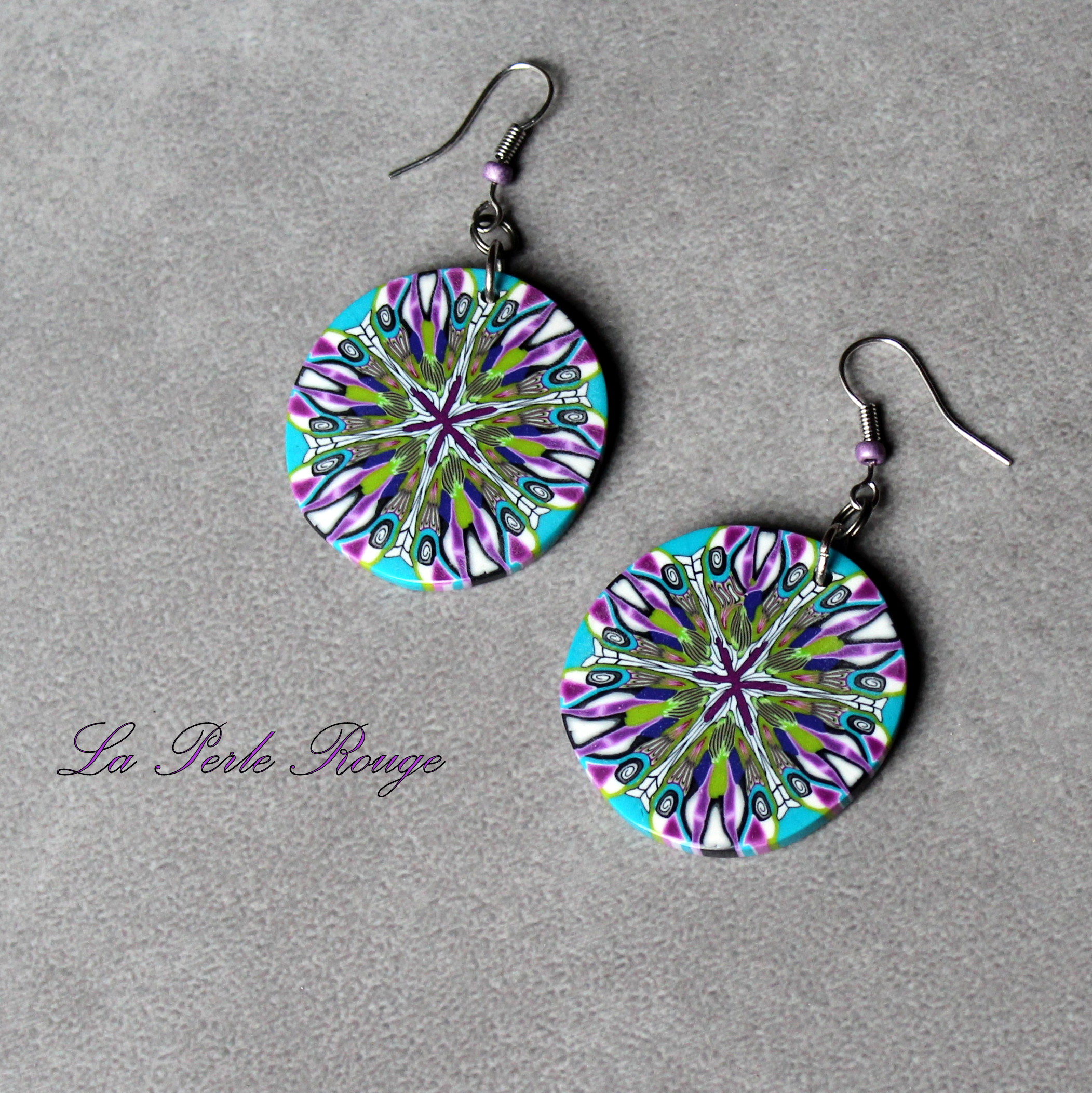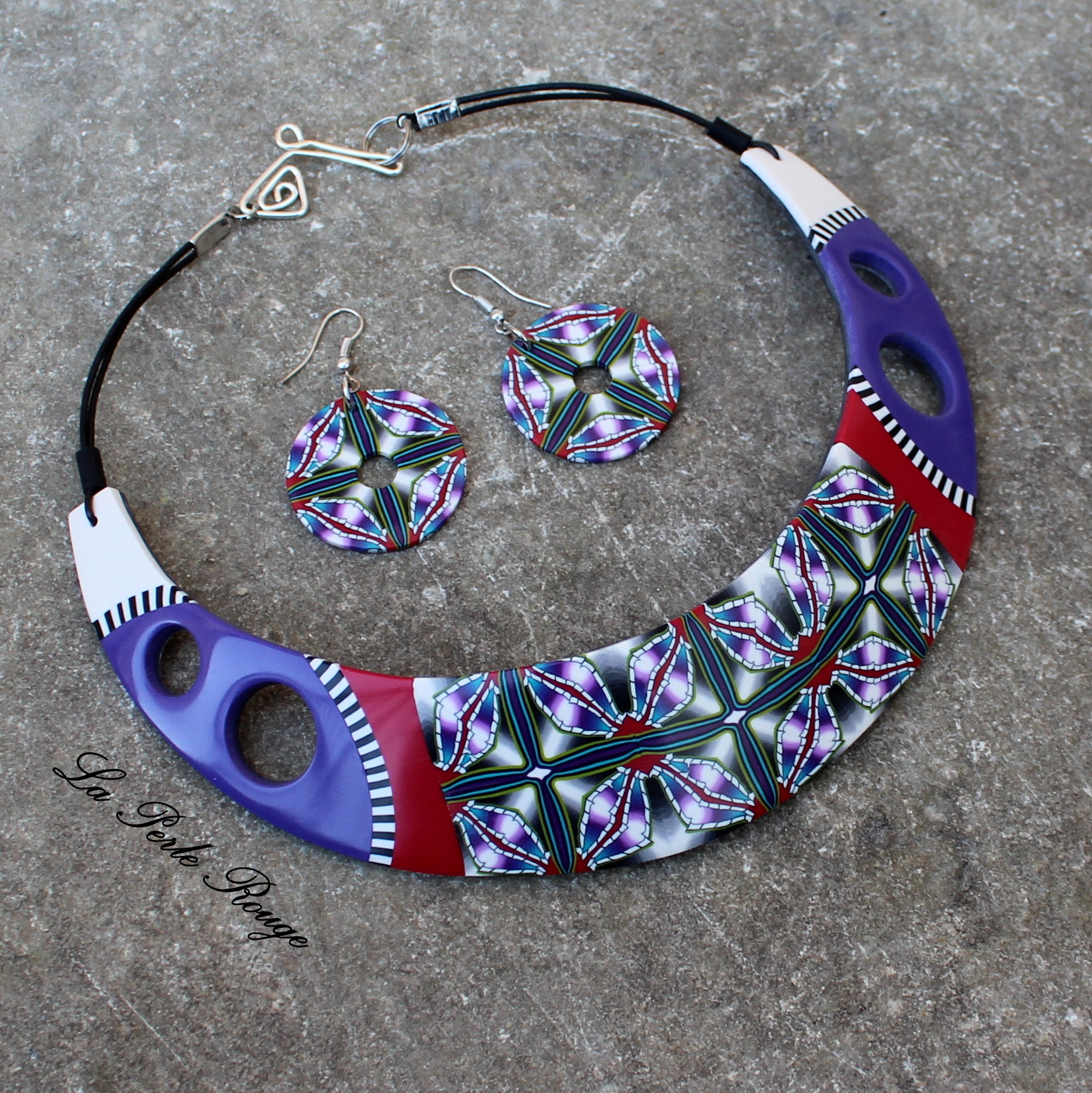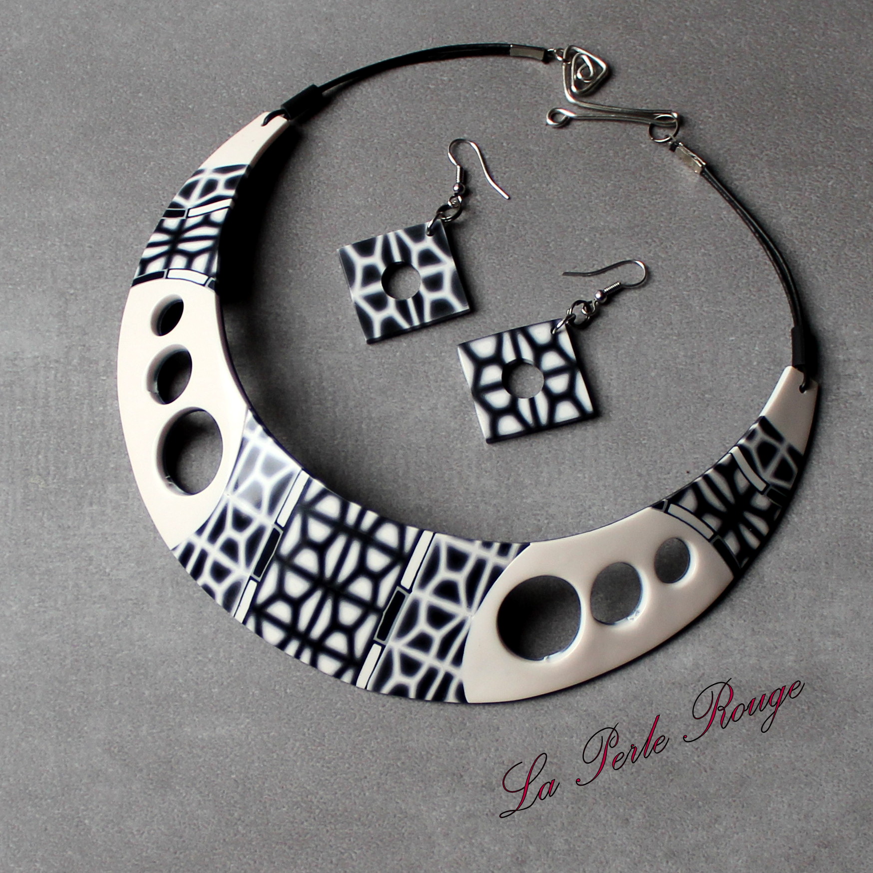 Et pour terminer, j’ai fait quelque chose qui ne m’arrive jamais, et je trouve que ça n’est pas très normal, JE ME SUIS FAIT UNE PARURE !!! pour moi, rien que pour moi, je me sens comblée ! Les motifs noir et blanc sont l’application de la cane géométrique noire et blanche du tuto de la semaine passée mais avec des canes dégradées à la place du colombin blanc cerclé de noir.