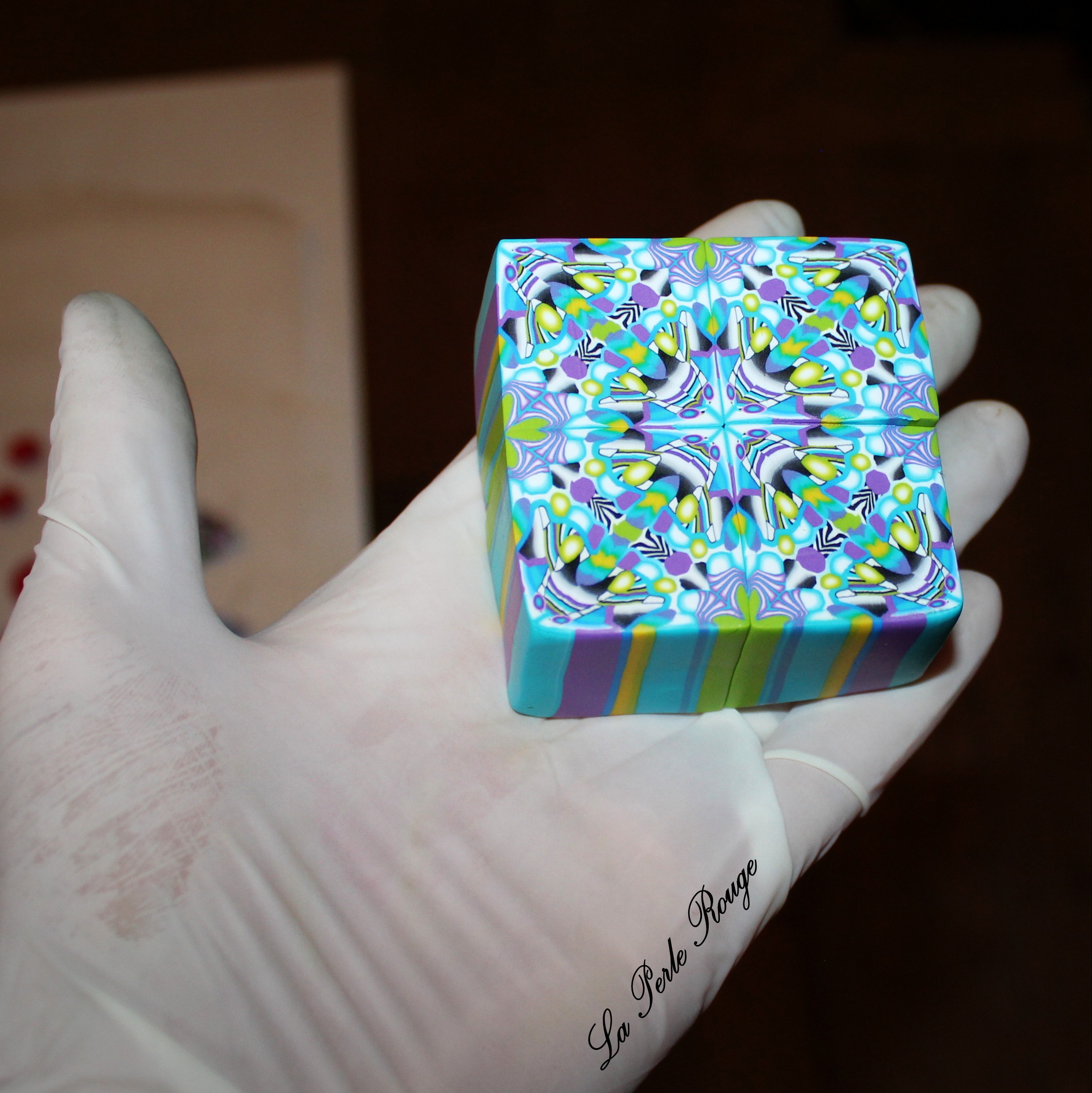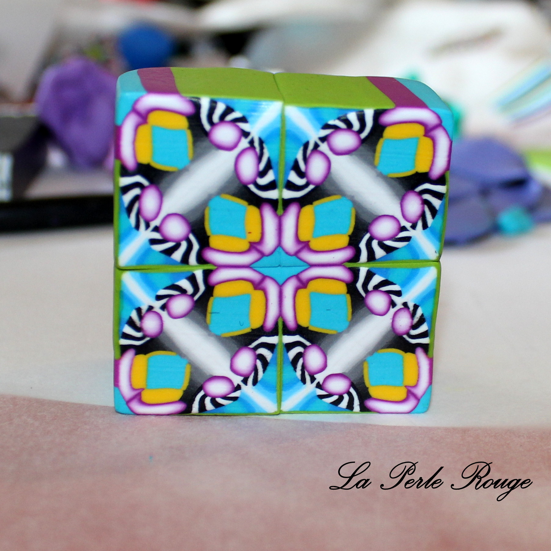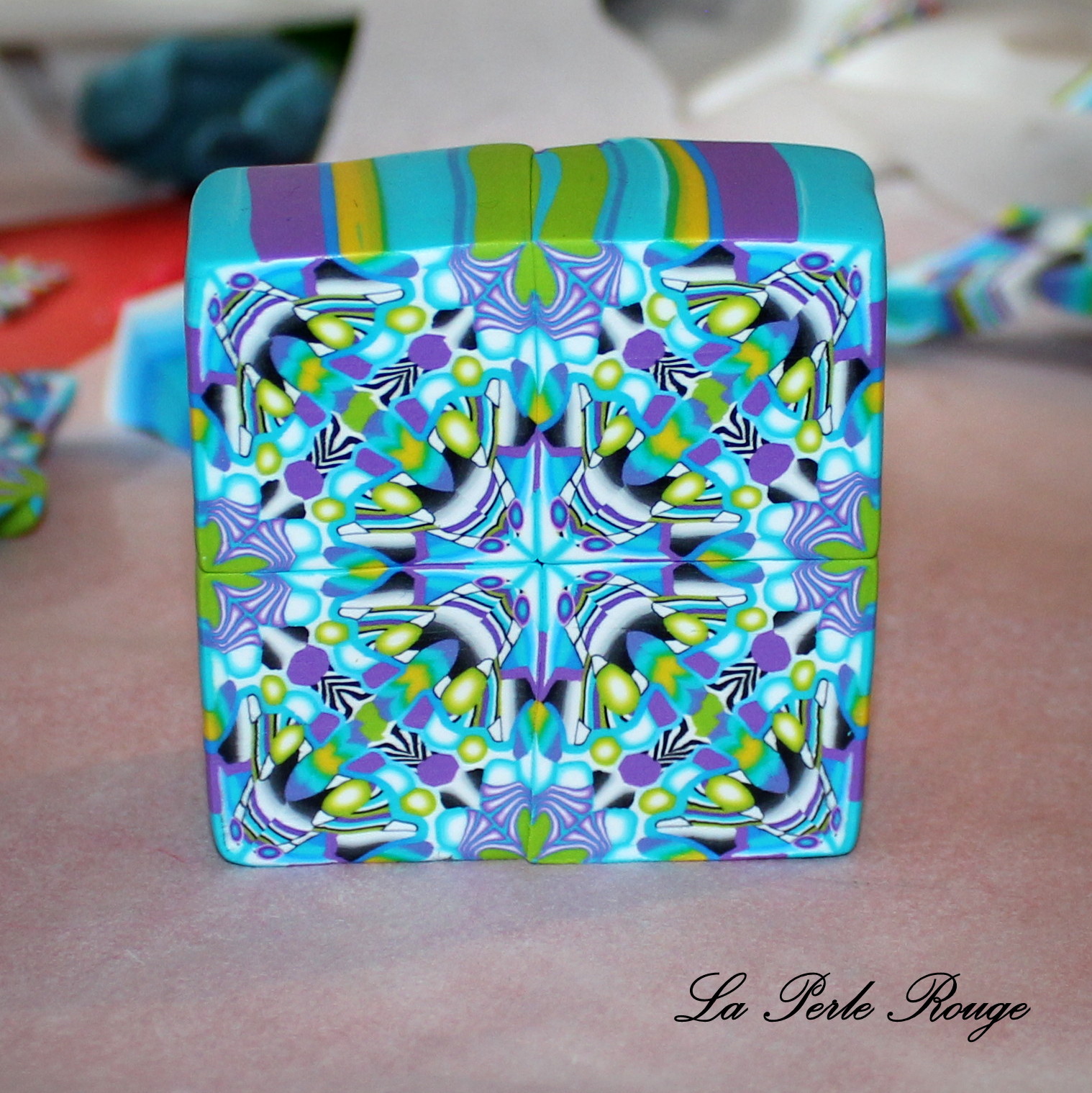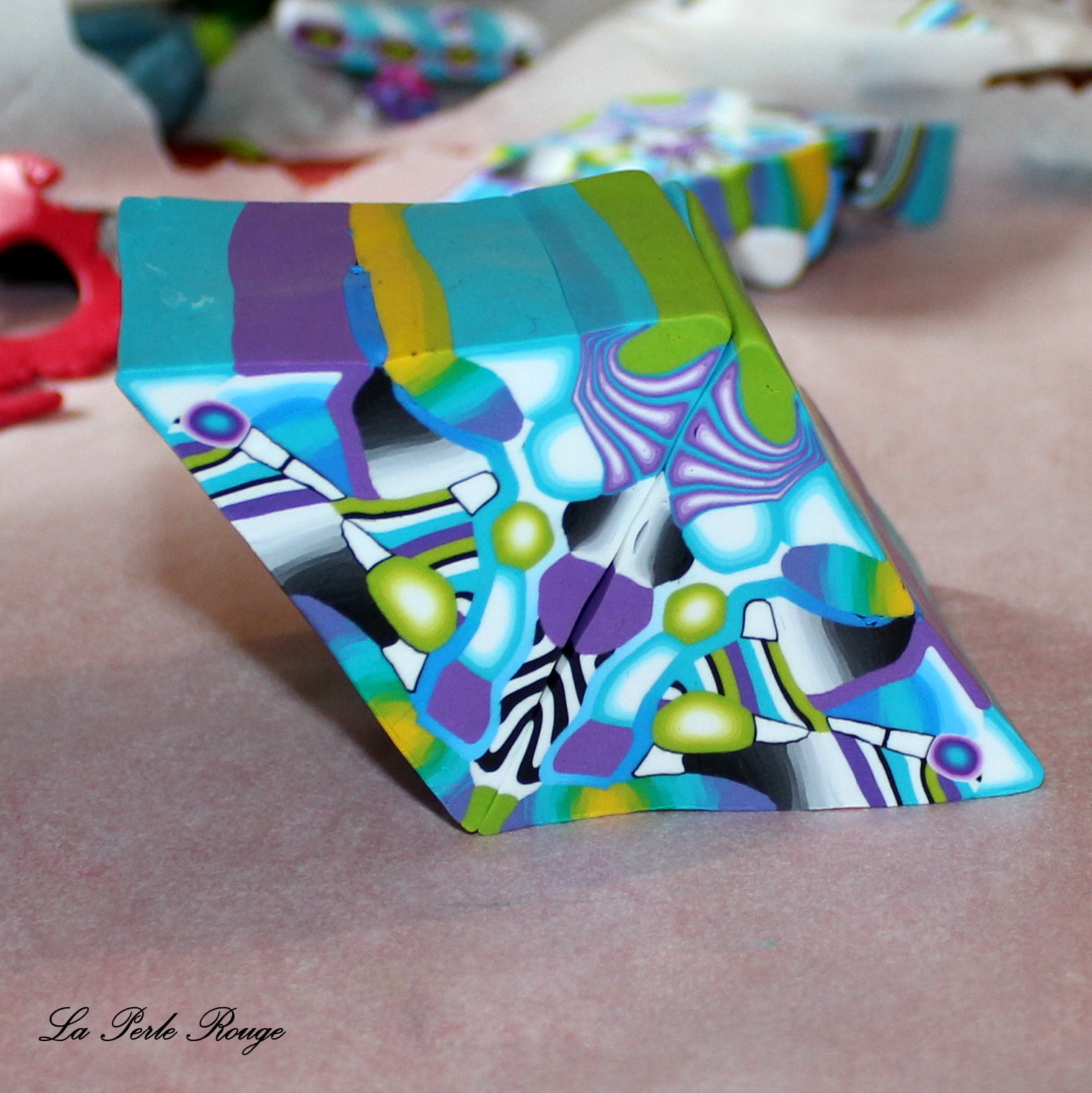 Je tenais à réaliser une pièce qui serait une sorte de témoin de ma créativité en polymère. J’ai donc pensé mon petit carré comme un tableau qui contiendrait les éléments qui ont le mieux défini ma production de l’année qui s’est écoulée. Il fallait donc qu’il y ait un joli dégradé, des morceaux de hidden magic, un peu de fraisage (mais pas trop parce que c’est juste l’angoisse de se dire qu’on peut éclater une pièce une fois qu’elle quasiment achevée !…) et surtout, un peu de cane kaléidoscope ! (ça y est, on y vient !)