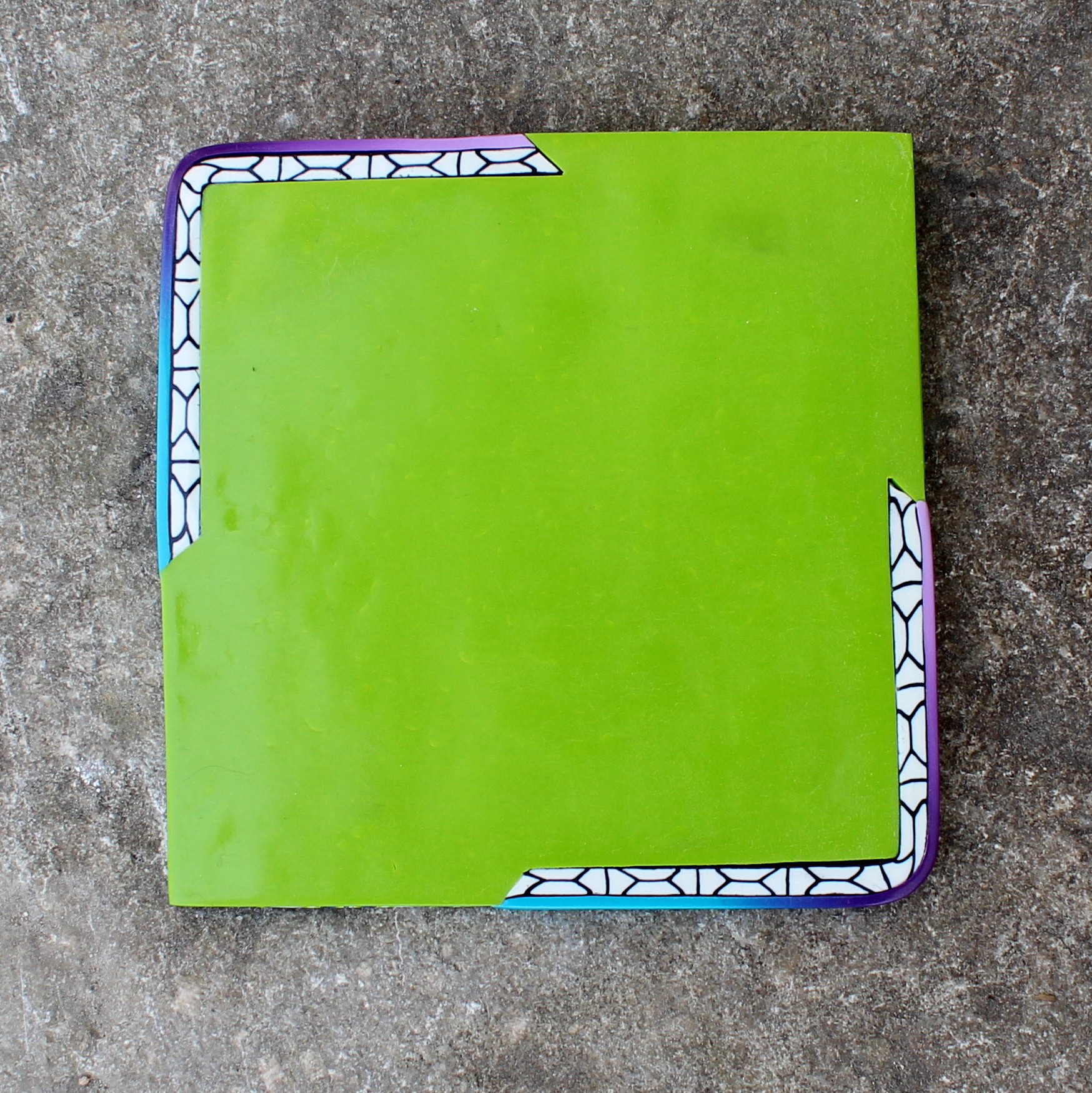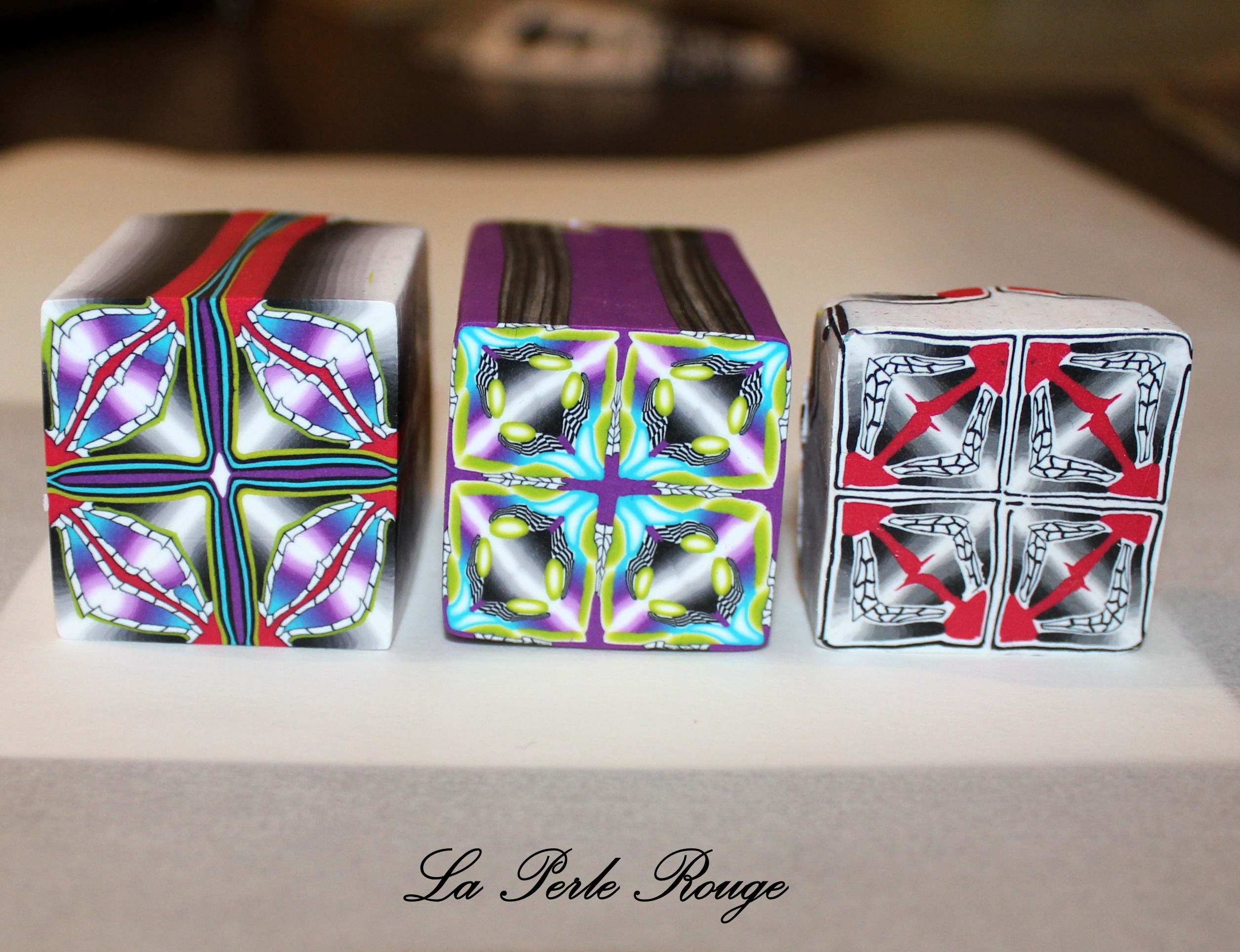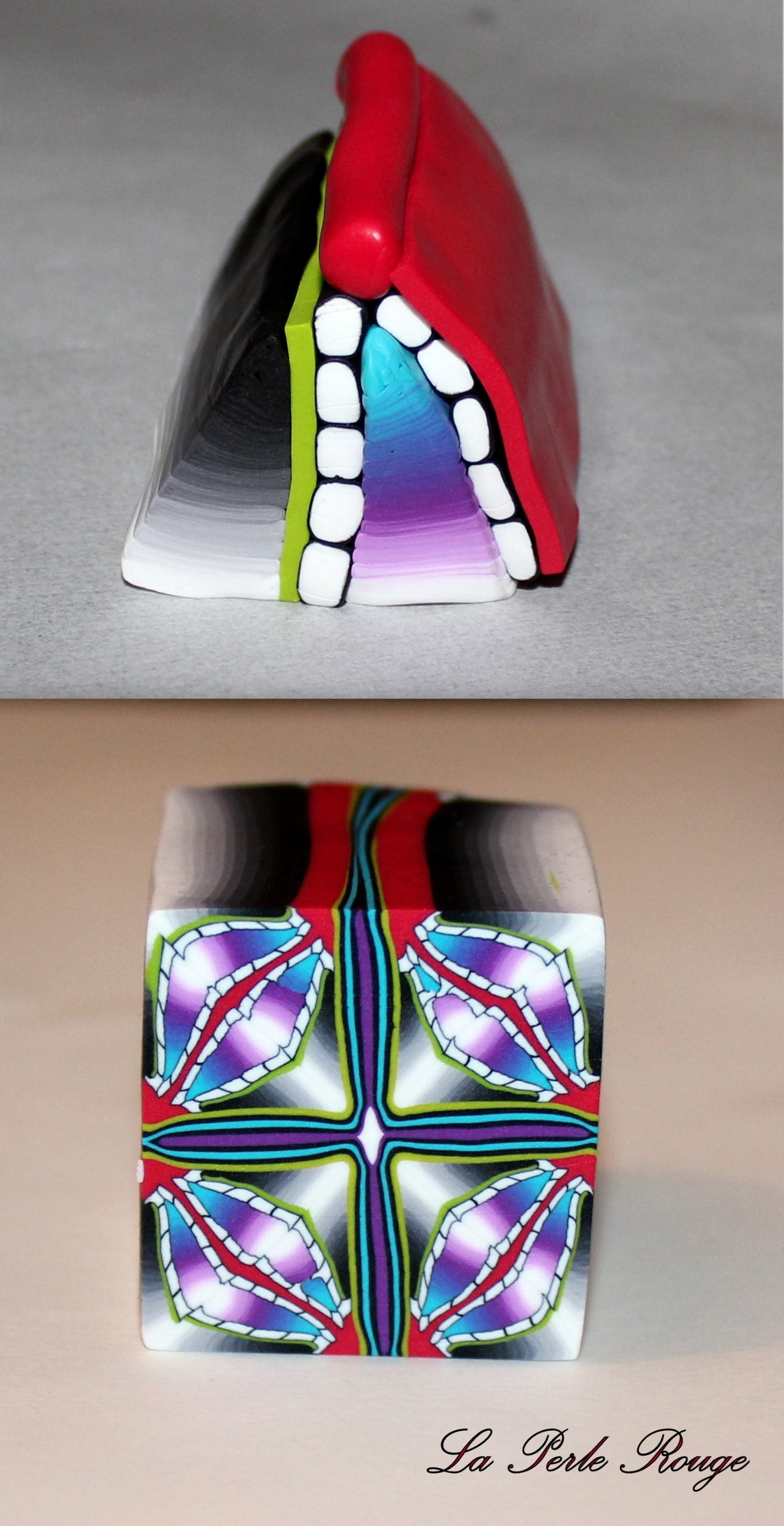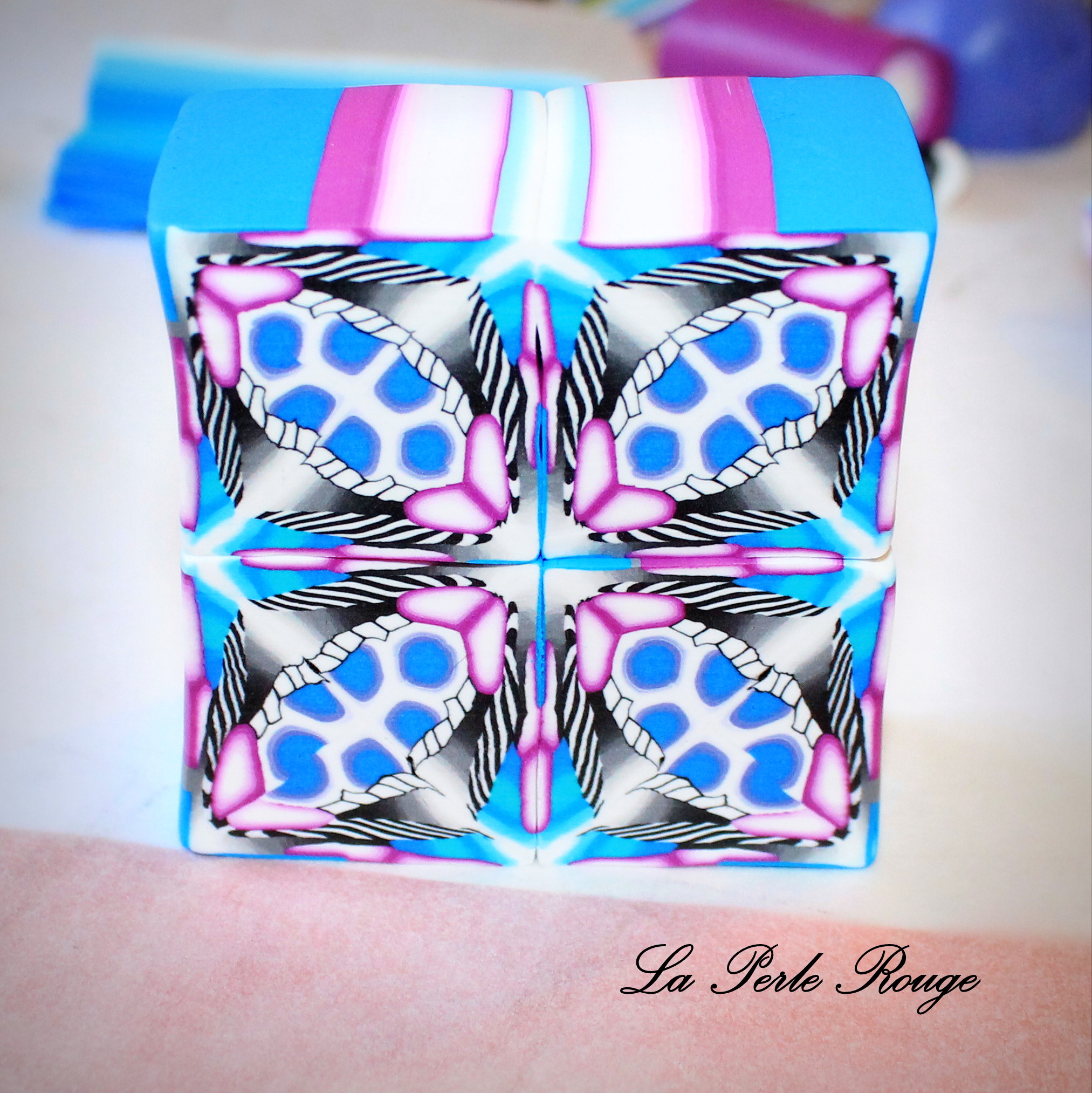 Je tenais à réaliser une pièce qui serait une sorte de témoin de ma créativité en polymère. J’ai donc pensé mon petit carré comme un tableau qui contiendrait les éléments qui ont le mieux défini ma production de l’année qui s’est écoulée. Il fallait donc qu’il y ait un joli dégradé, des morceaux de hidden magic, un peu de fraisage (mais pas trop parce que c’est juste l’angoisse de se dire qu’on peut éclater une pièce une fois qu’elle quasiment achevée !…) et surtout, un peu de cane kaléidoscope ! (ça y est, on y vient !)