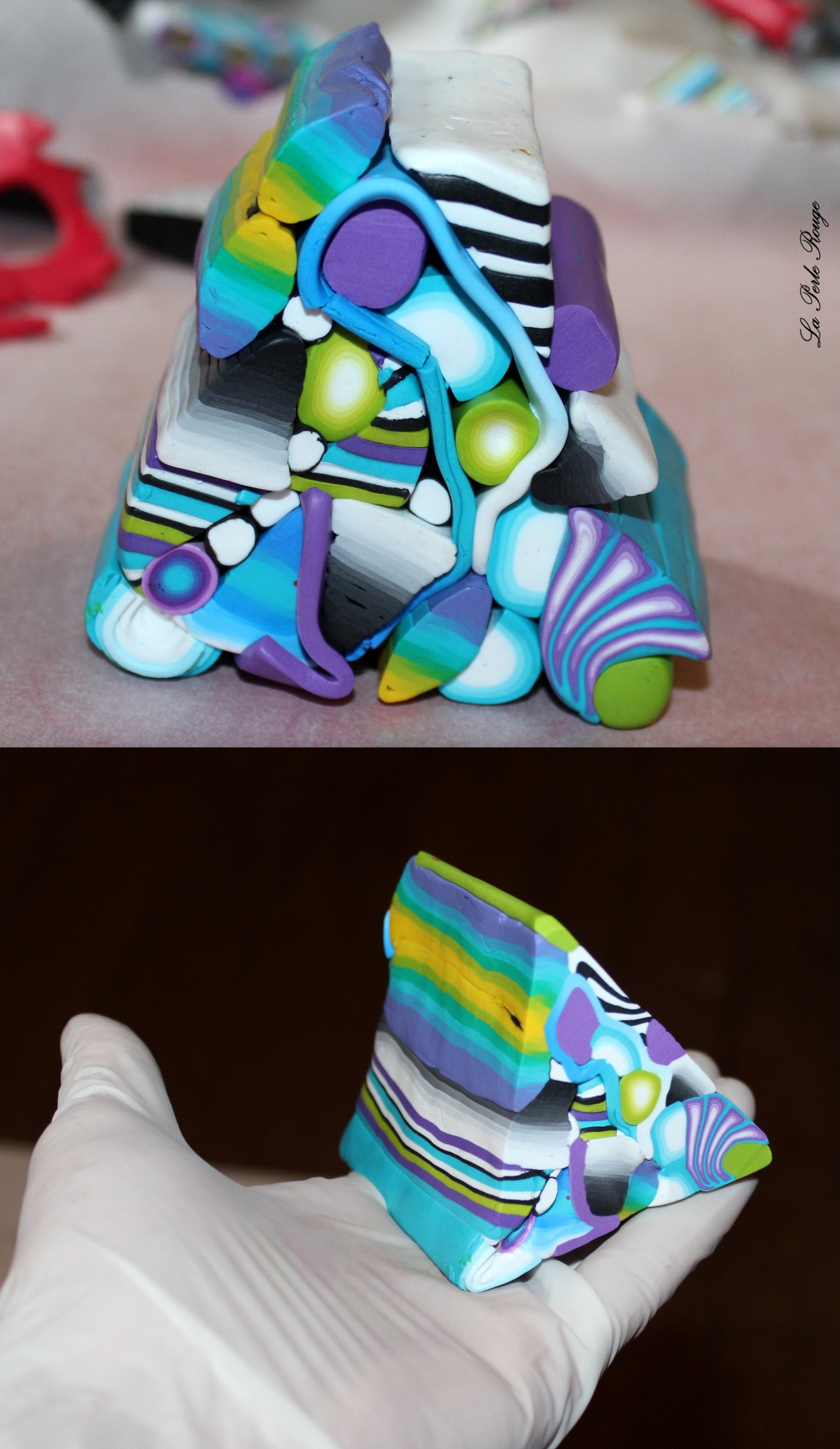 J’ai donc décidé de réunir les restes de toutes les mini-canes qui avaient servi aux canes kaléidoscopes des semaines passées et j’ai tout regroupé en un gros tas vaguement triangulaire :