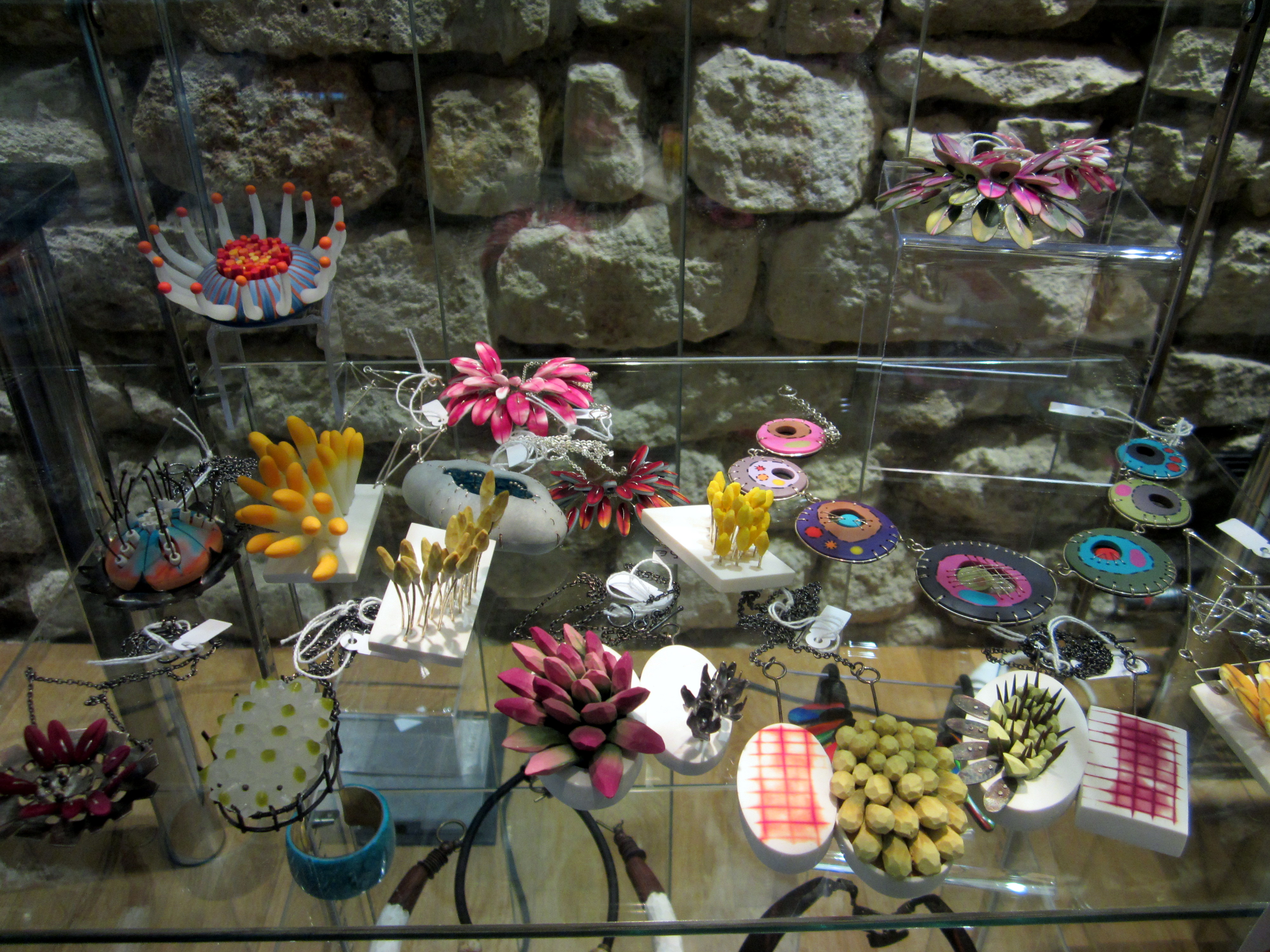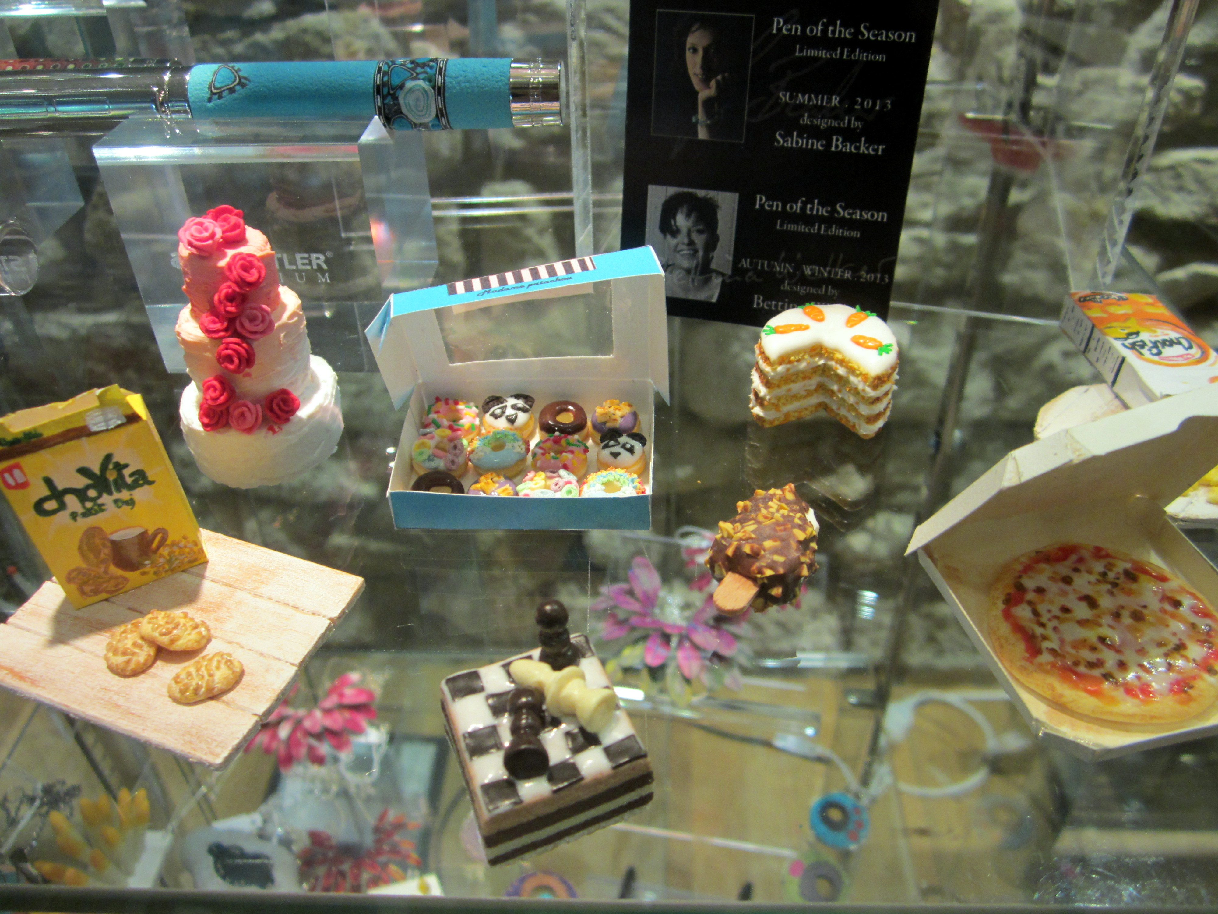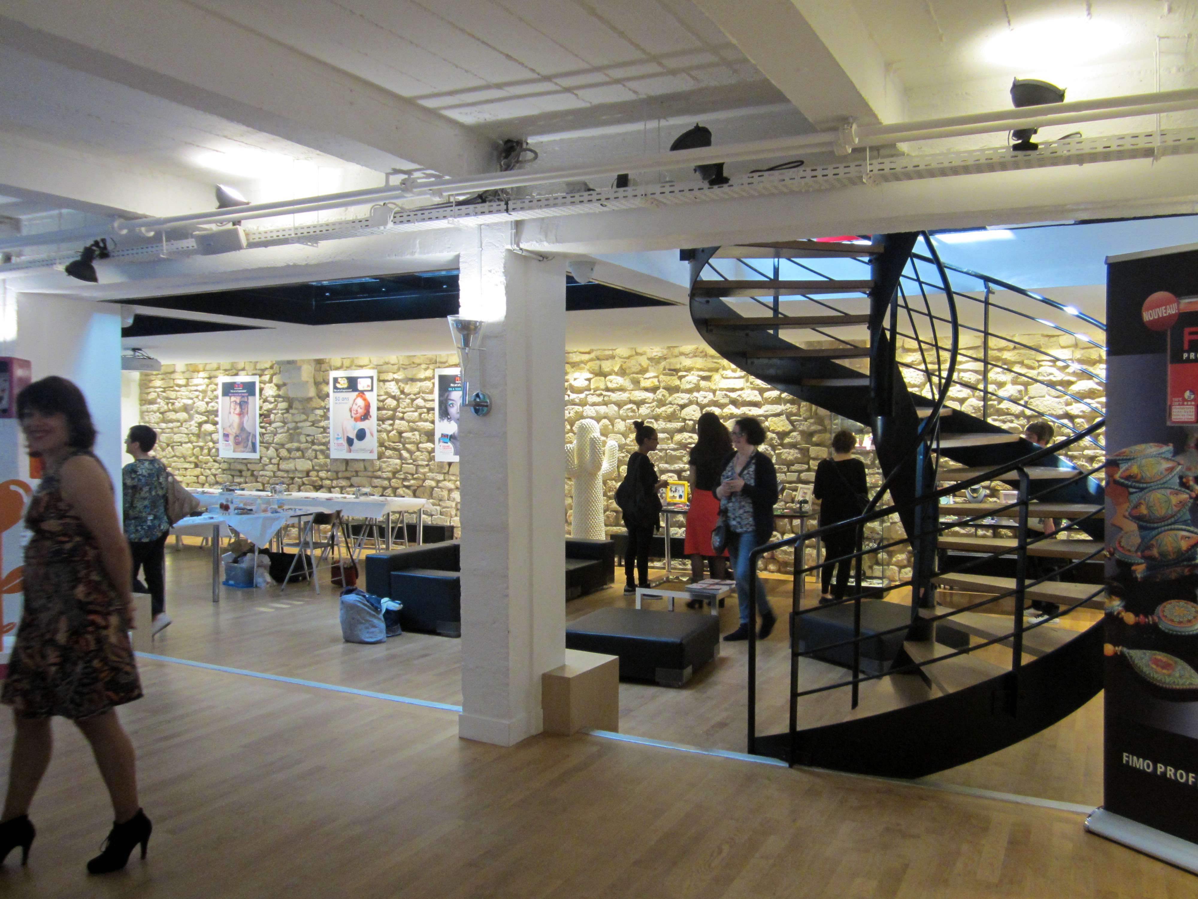 Au rez-de-chaussée se trouve une grande salle avec tout au fond, un bar garni de mignardises et de mini-viennoiseries qu’on pouvait accompagner d’un café très agréablement servi par un mossieur en costume impeccable. (Je crois que c’est à ce moment-là que j’ai commencé à regretter de ne pas m’être coiffée…). Je saisis l’occasion de me caféïner un peu les neurones et je déambule lentement dans l’espace tandis que beaucoup de gens semblent se reconnaître et se retrouver autour de moi. Devant moi une zone dédiée à un atelier est en place avec plus de machines à pâte, de pains de fimo, de lames et d’emporte-pièces que je n’avais vu rassemblés jusque-là et un peu plus loin, derrière le canapé design se trouve une vitrine entre deux tables.