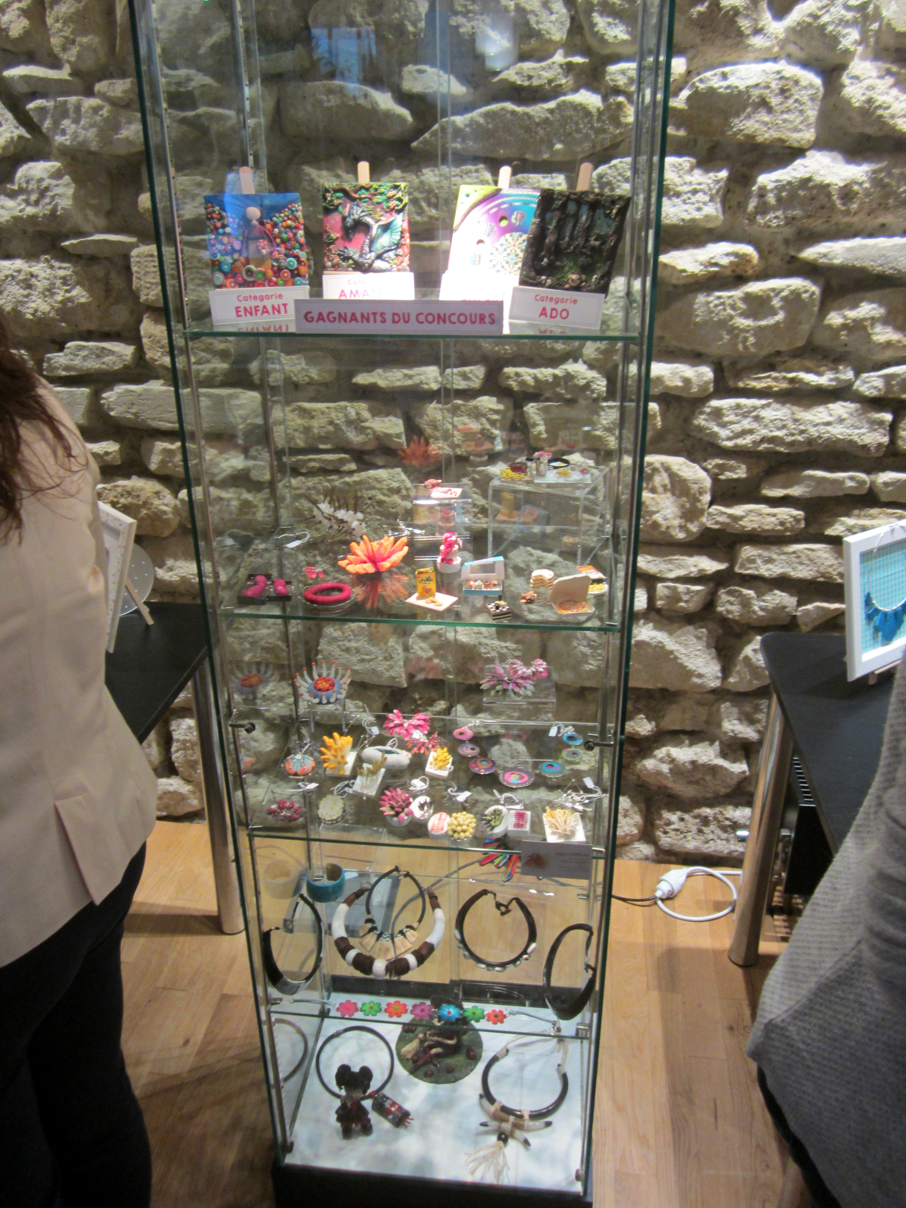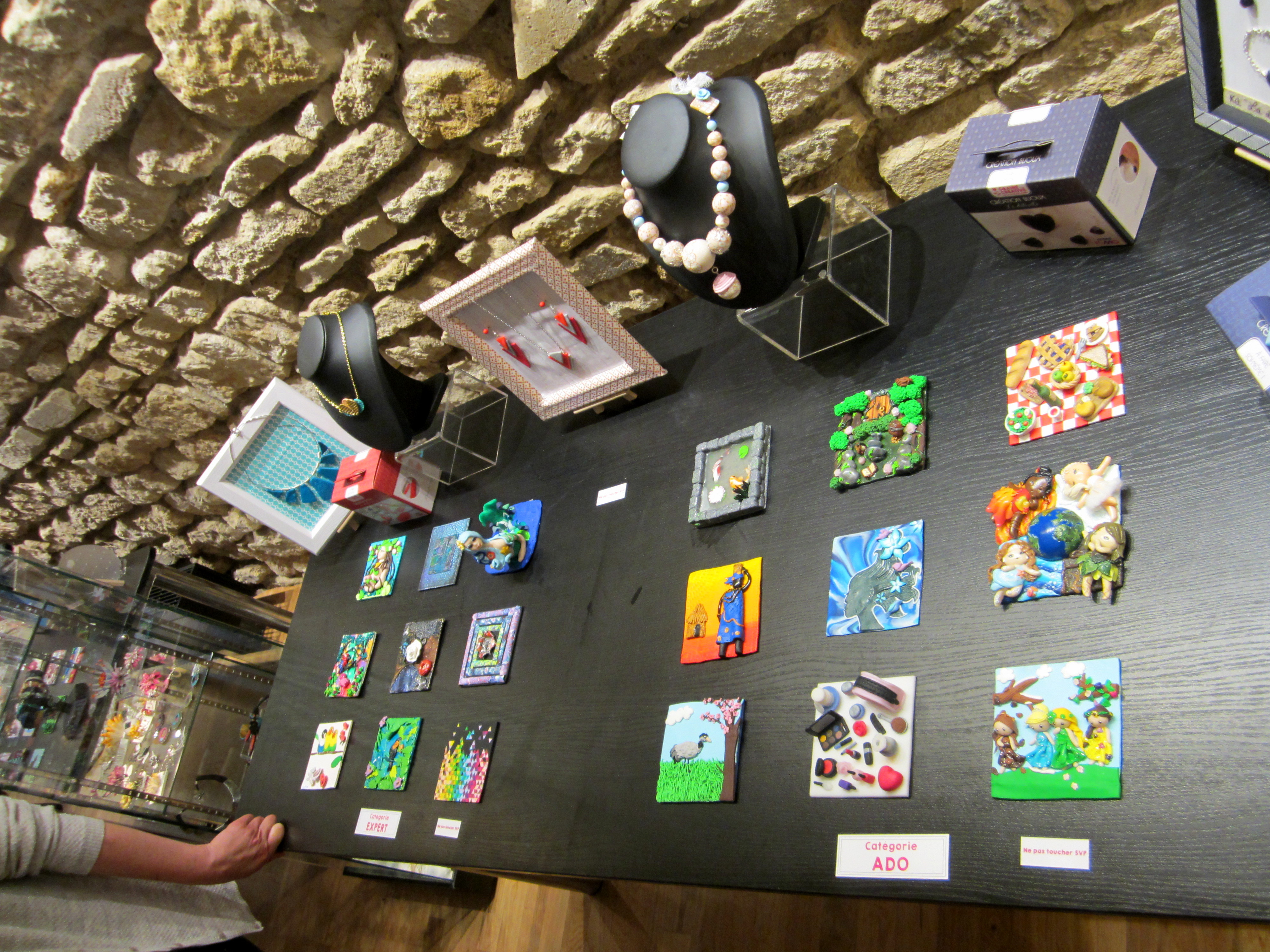 Les tables présentent quelques carrés 10×10 de participants au concours mais ce qui m’intrigue c’est la vitrine, donc, terminant doucement mon café en me demandant dans quel endroit je suis tombée, je m’approche.