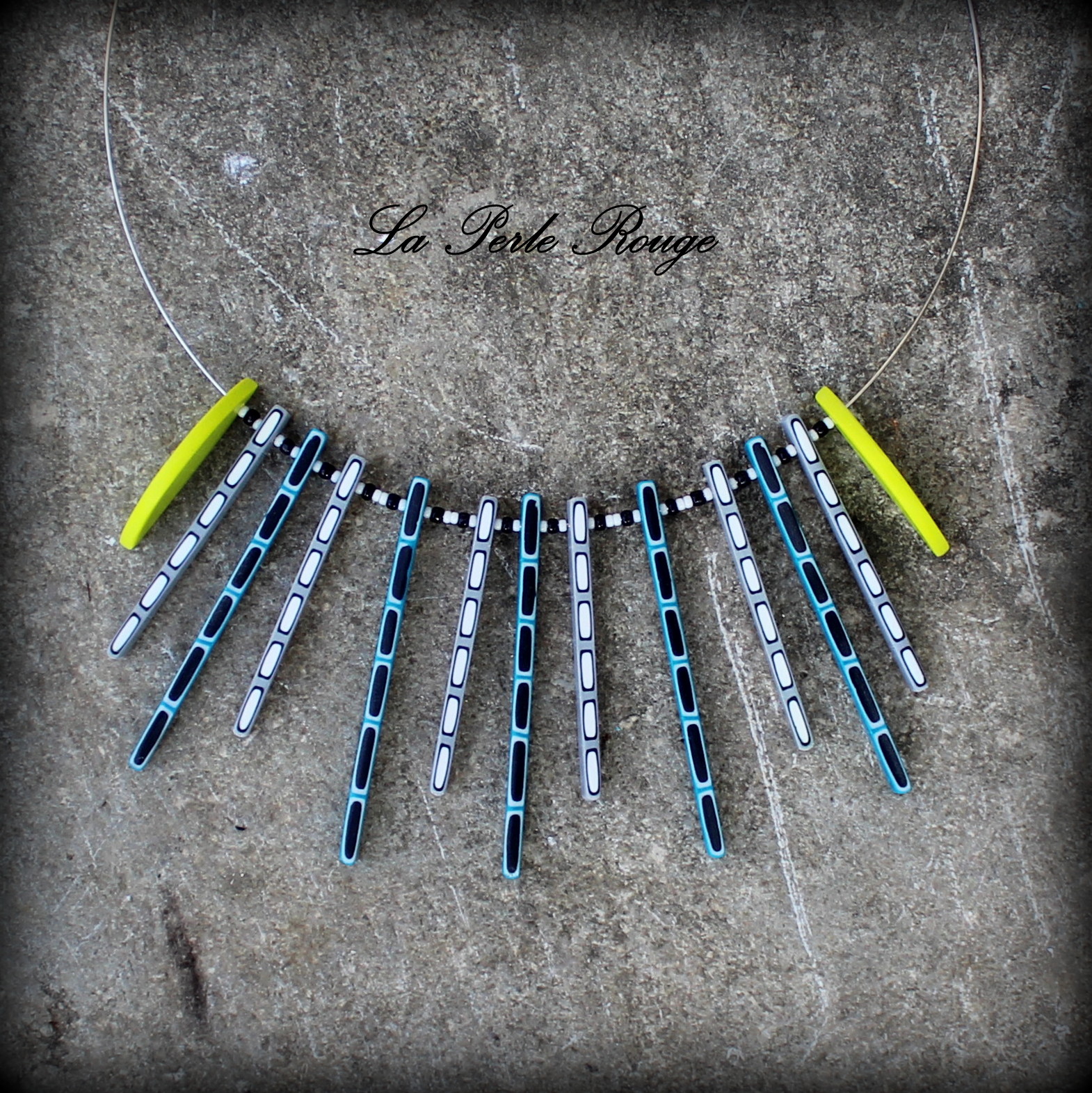 Photo 8 : Préparez un colombin blanc cerclé d’une fine plaque noire et étirez-la jusqu’à pouvoir en couper 6 tronçons. (oui, je sais, sur la photo 8, il n’y en a que 5 mais je m’en sers d’un autre par la suite.)