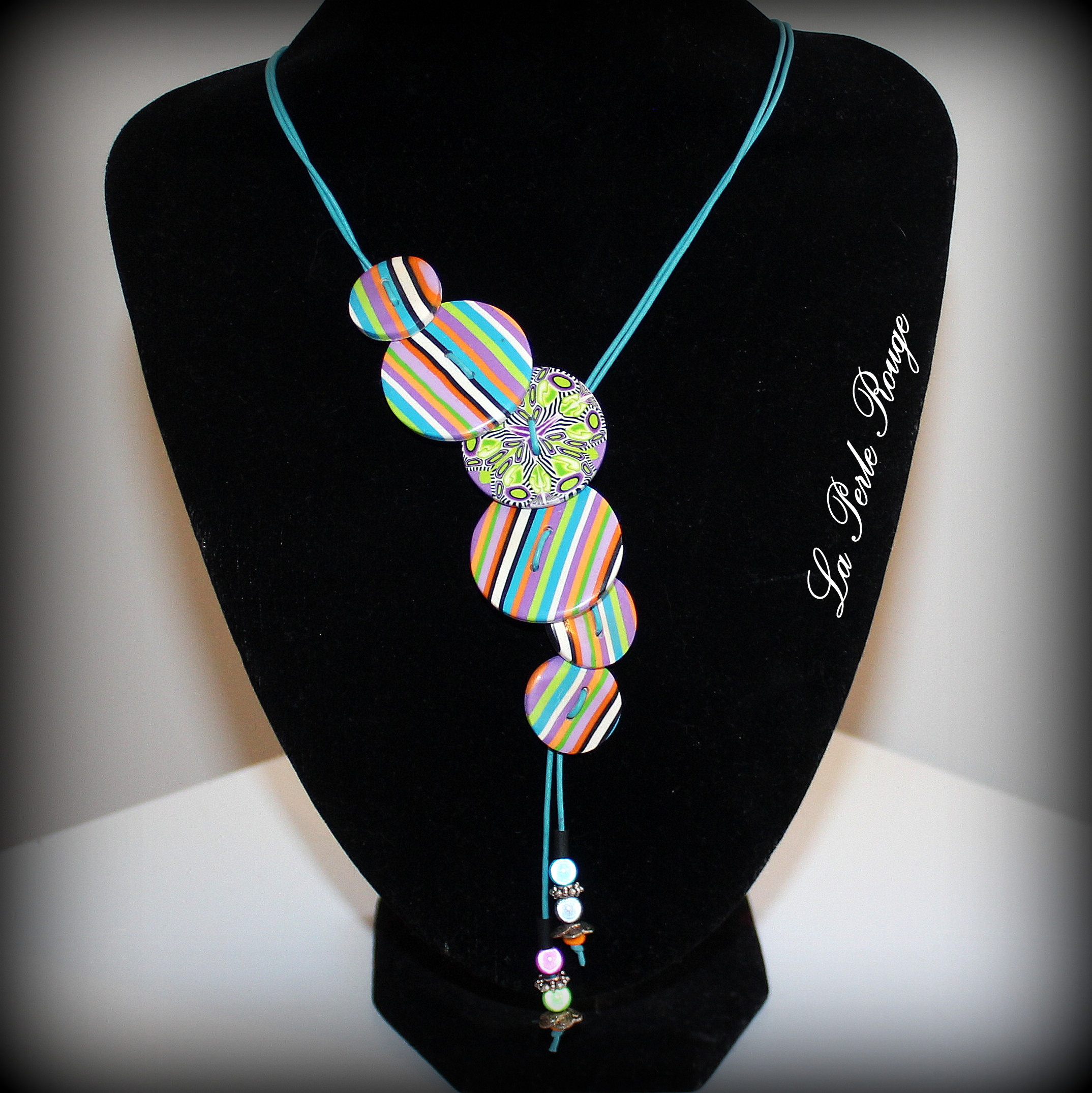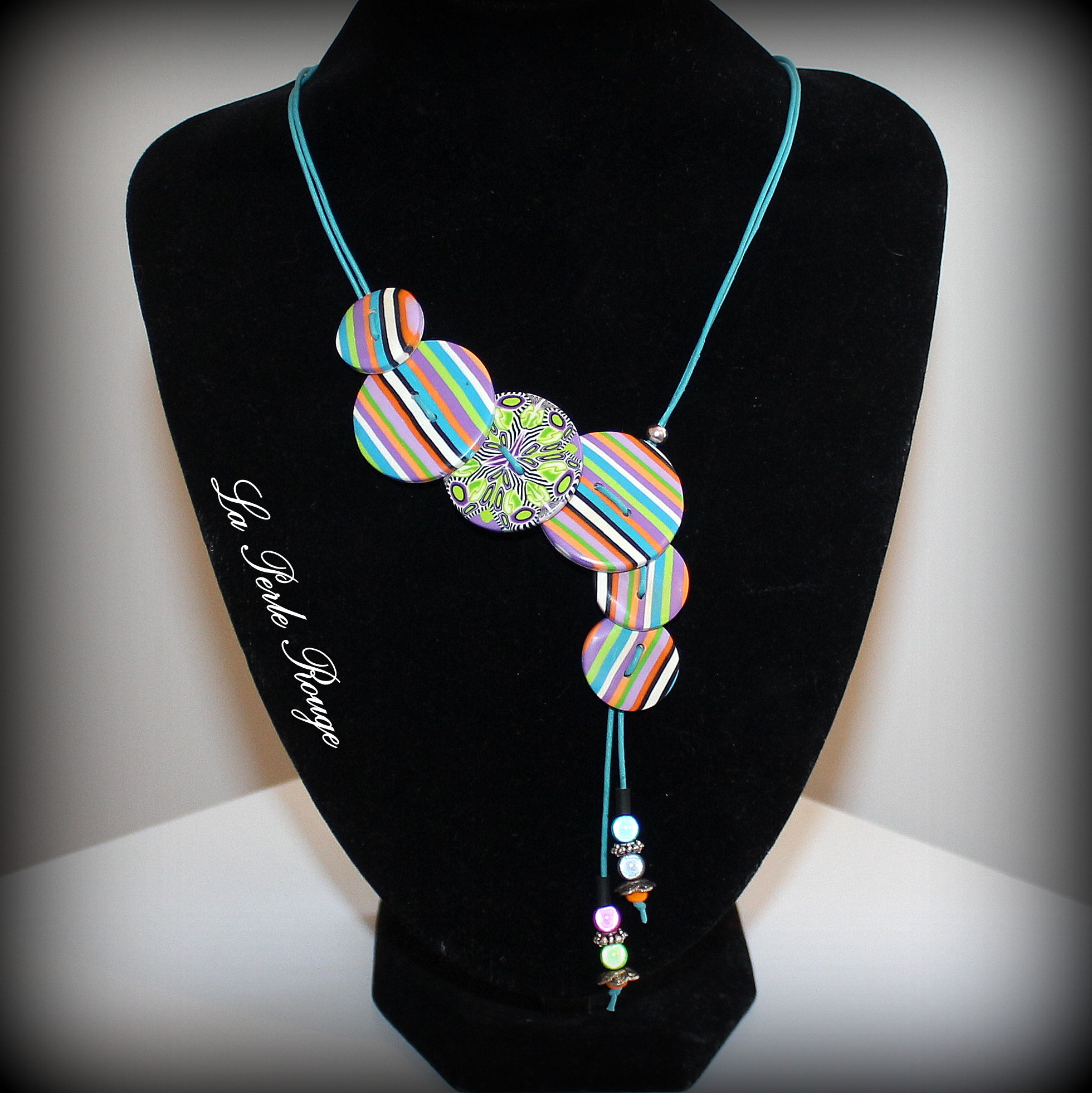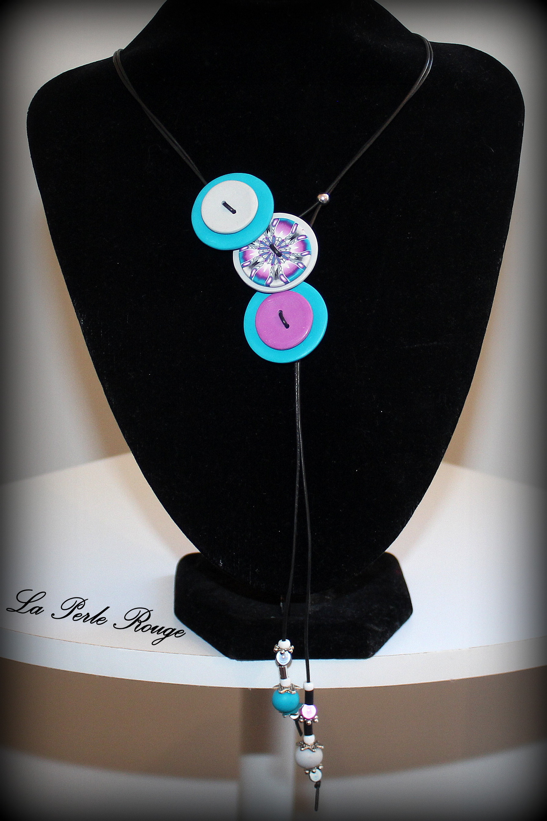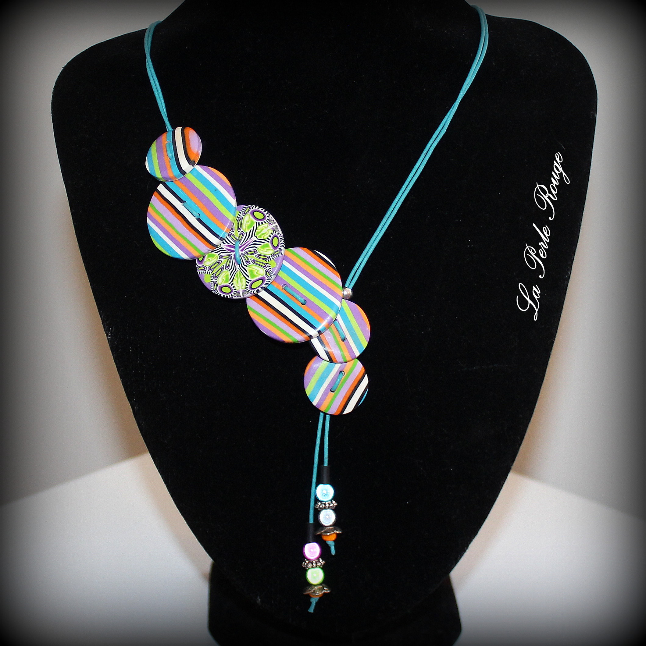 J’ai poursuivi mes essais de colliers ajustables avec les montages de boutons polymère. J’ai varié les diamètres, les formes et je crois que je commence à tenir quelque chose qui me plait réellement beaucoup.