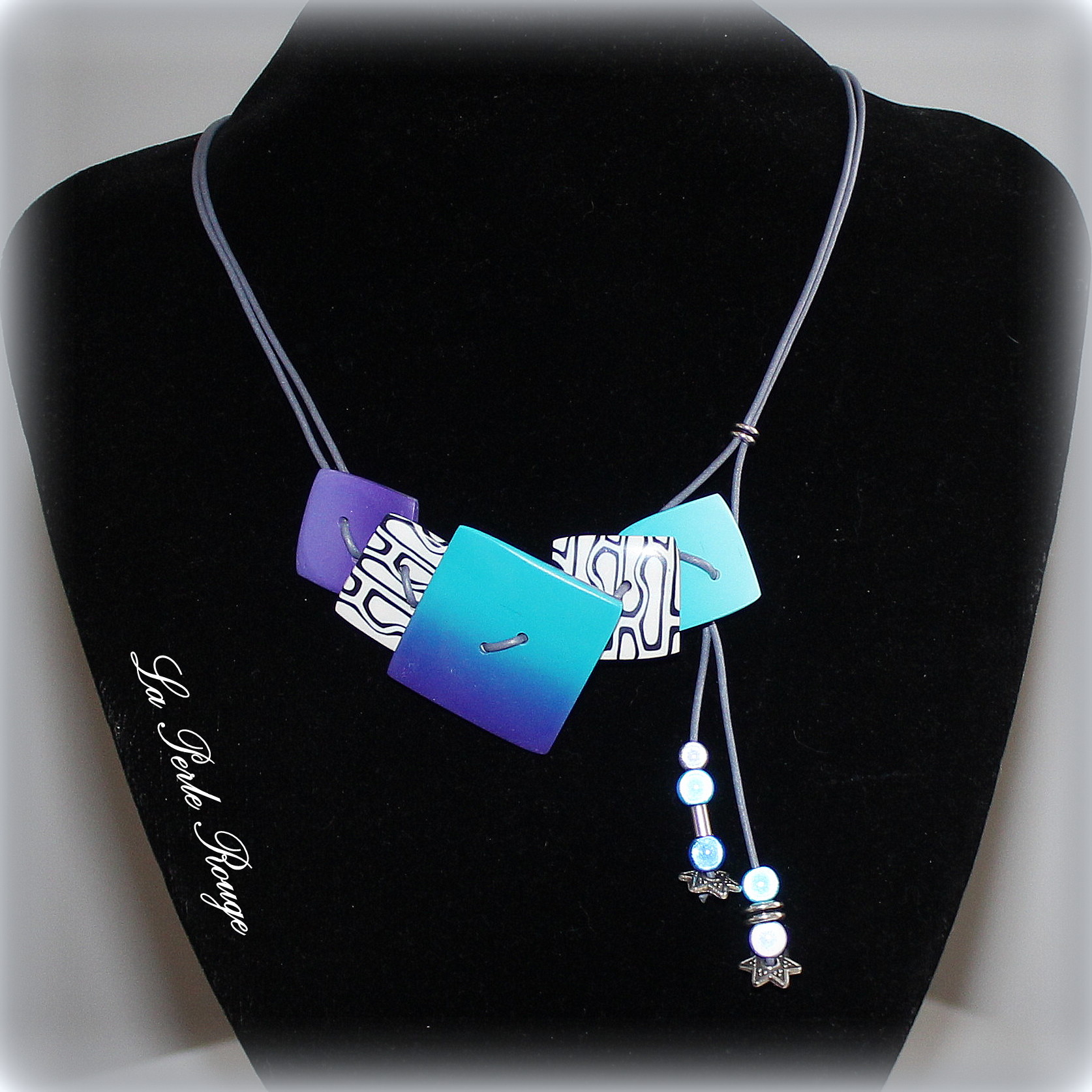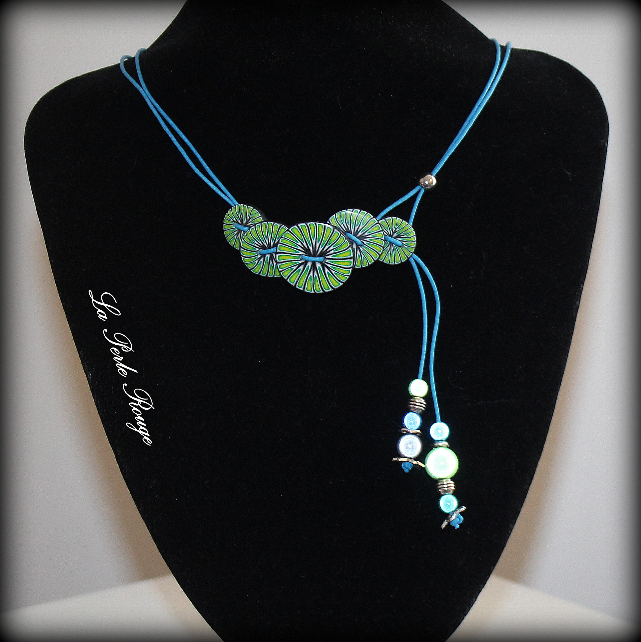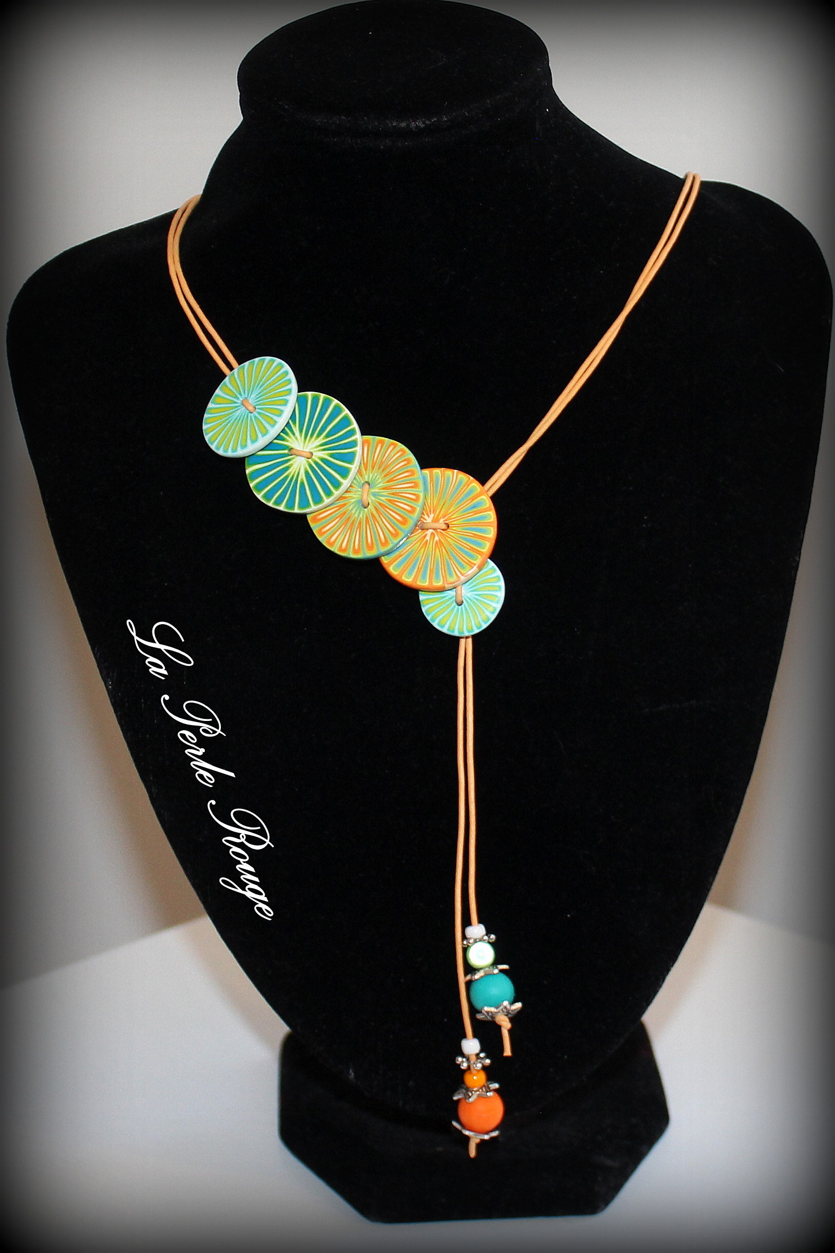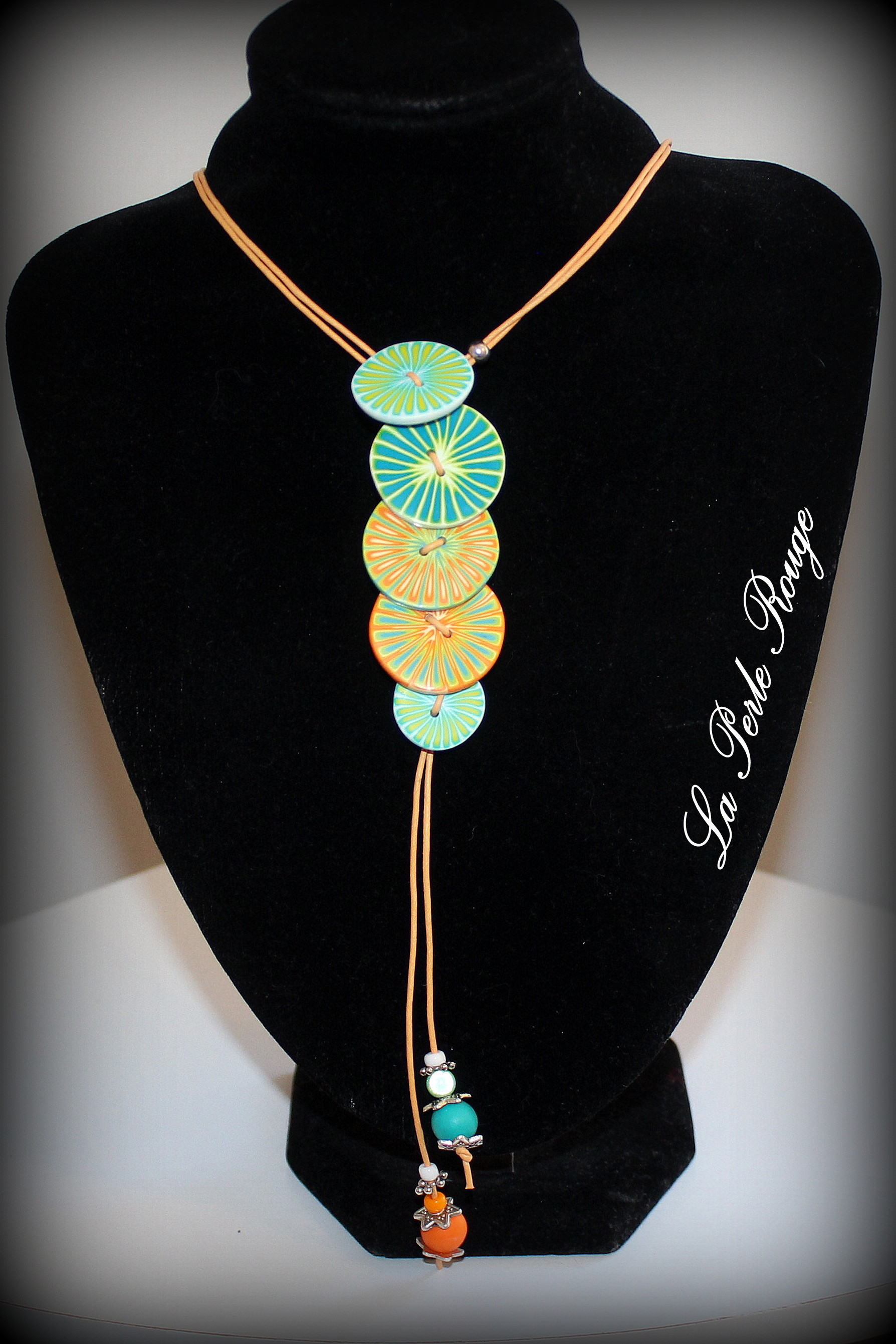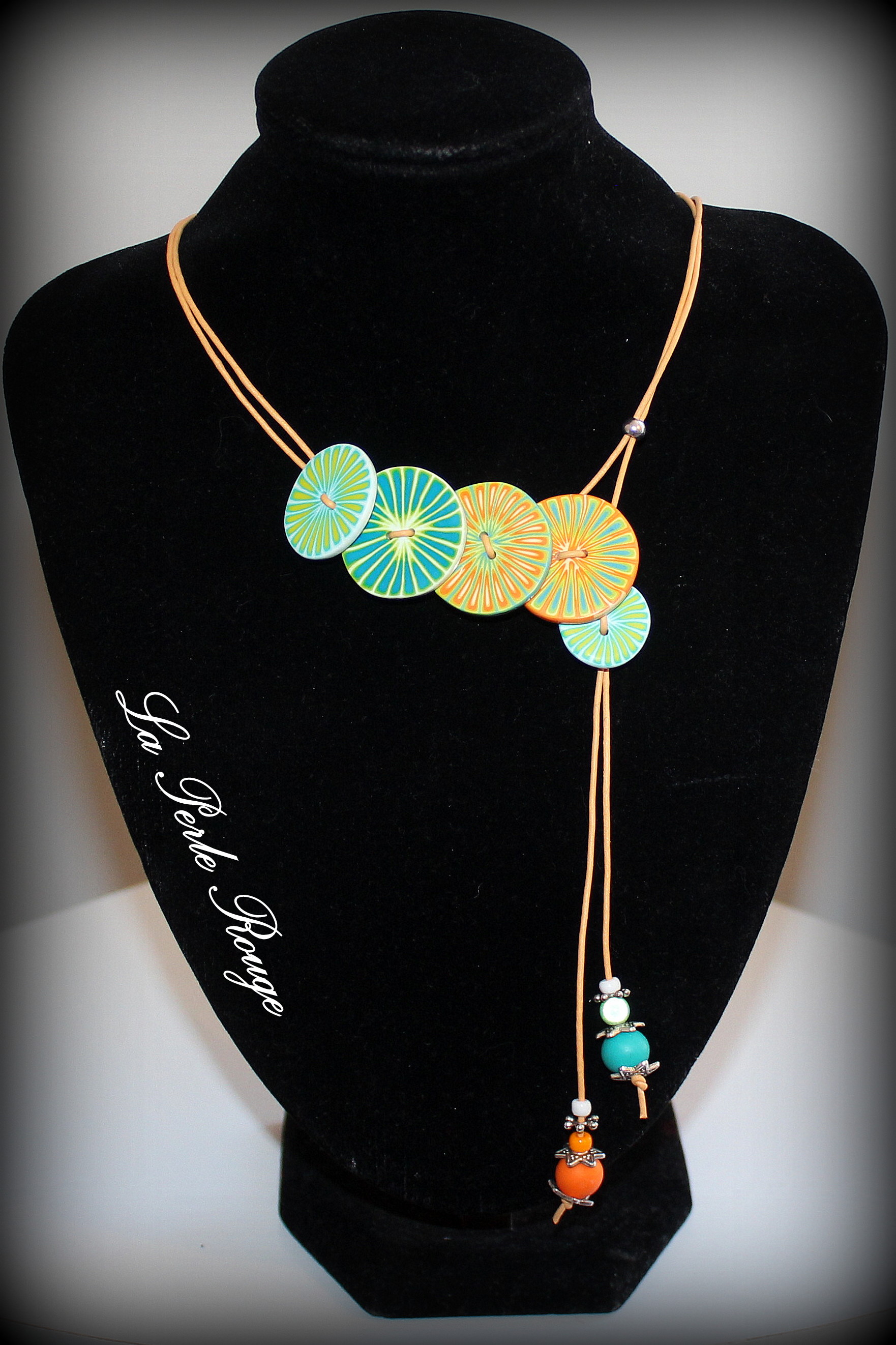 J’ai poursuivi mes essais de colliers ajustables avec les montages de boutons polymère. J’ai varié les diamètres, les formes et je crois que je commence à tenir quelque chose qui me plait réellement beaucoup.