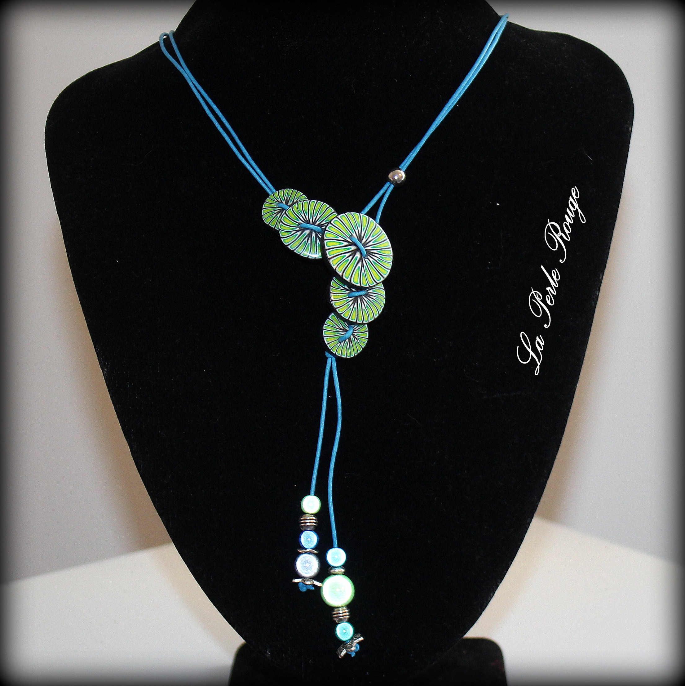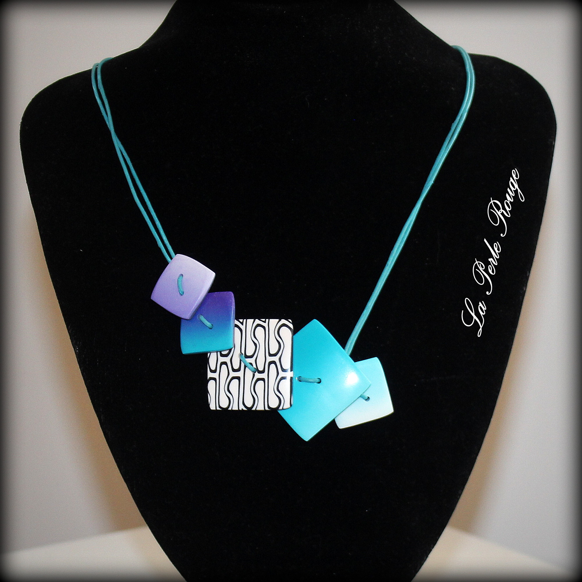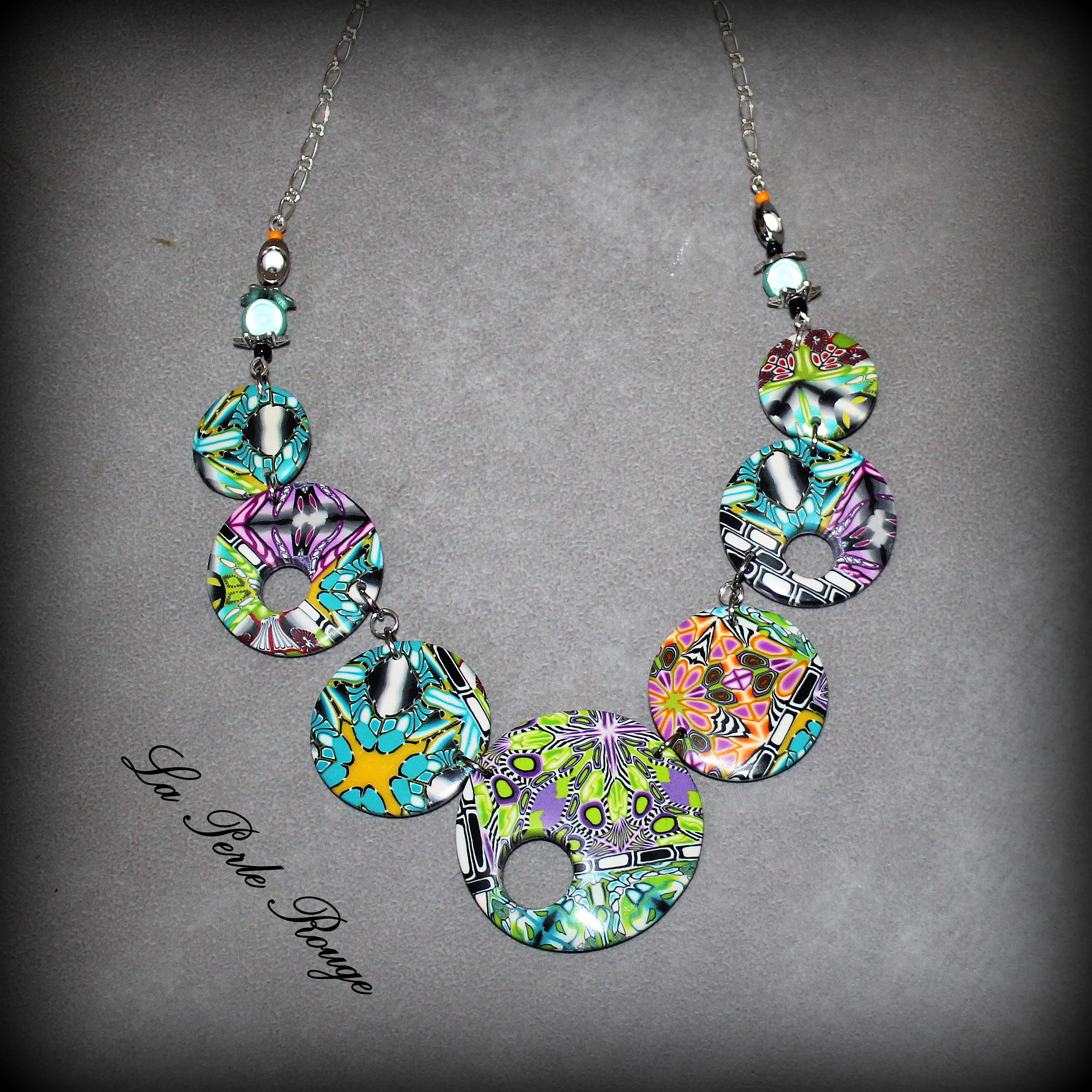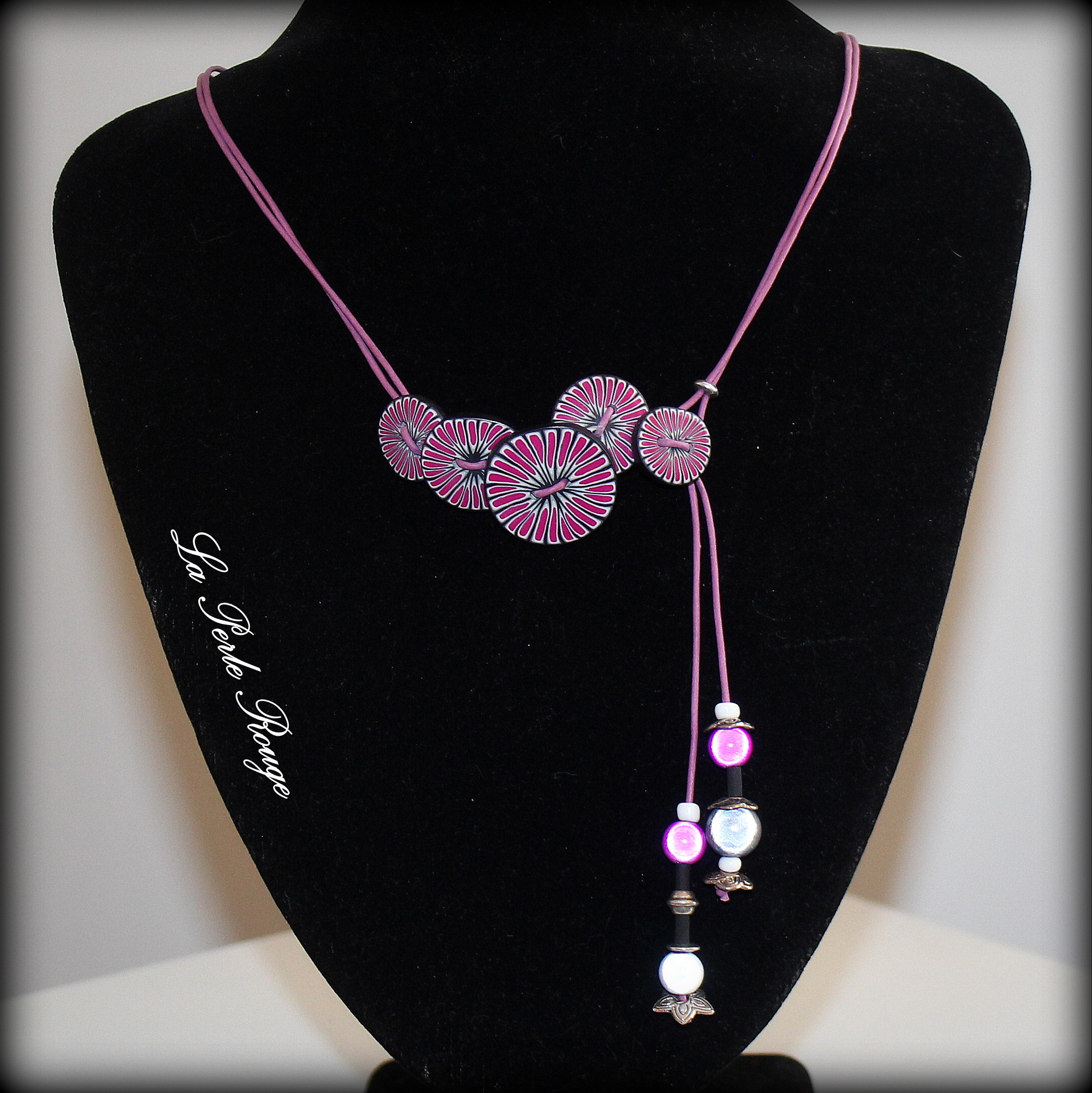 J’ai poursuivi mes essais de colliers ajustables avec les montages de boutons polymère. J’ai varié les diamètres, les formes et je crois que je commence à tenir quelque chose qui me plait réellement beaucoup.