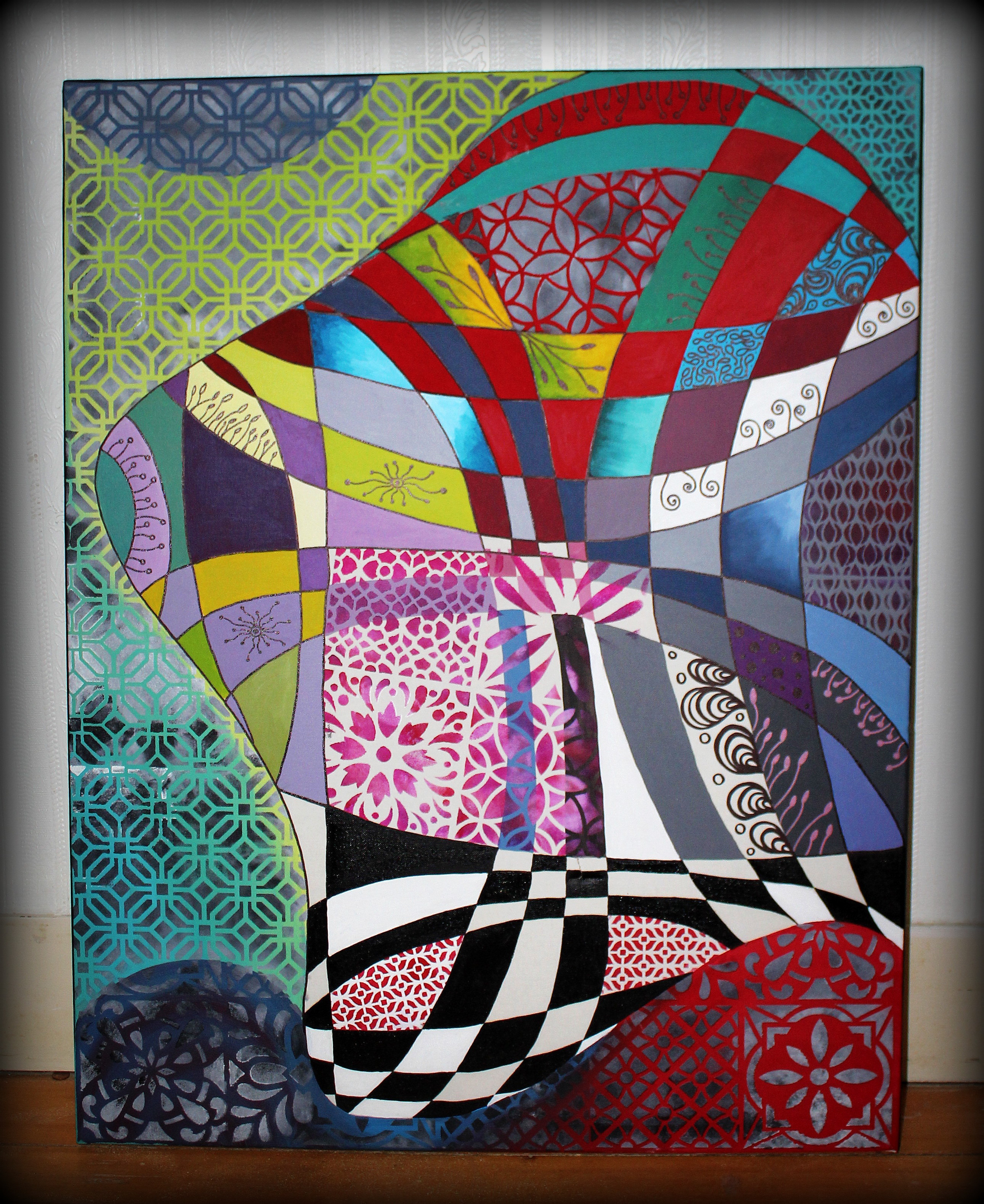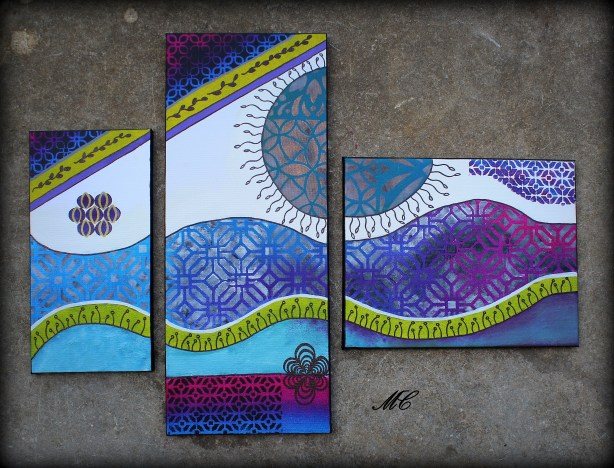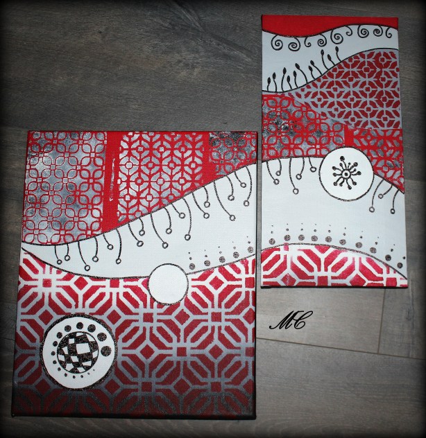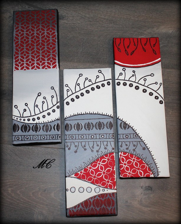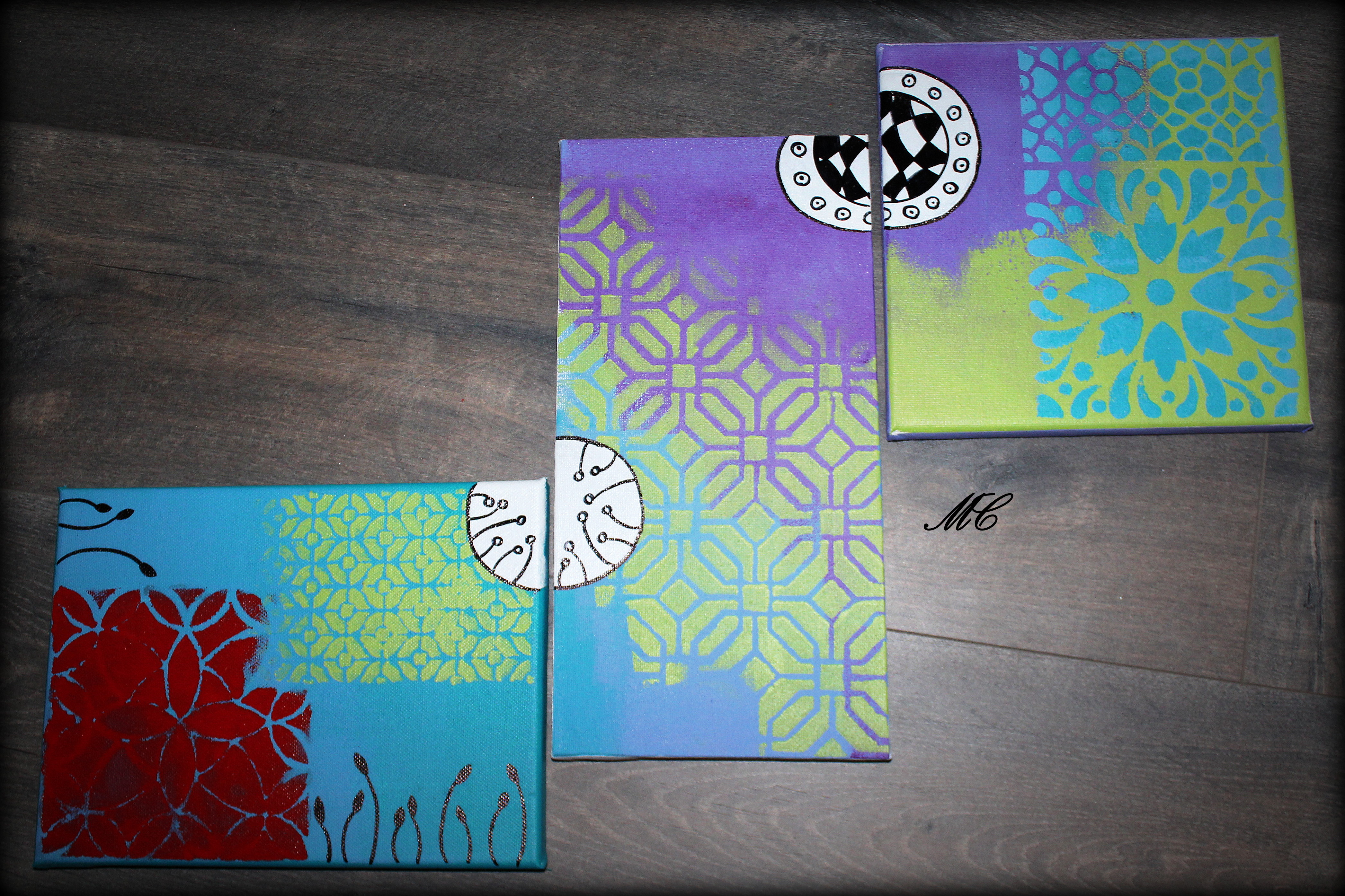 Quoiqu’il en soit, la première création qui est en est née m’a beaucoup plu. Oui, vous avez bien lu, ma « première » car une fois la journée peinture achevée, je n’ai évidemment pas pu m’en tenir là. Mais laissez-moi déjà vous montrer les premières toiles de décoration réalisées avec peinture acrylique, feutre et pochoirs :
