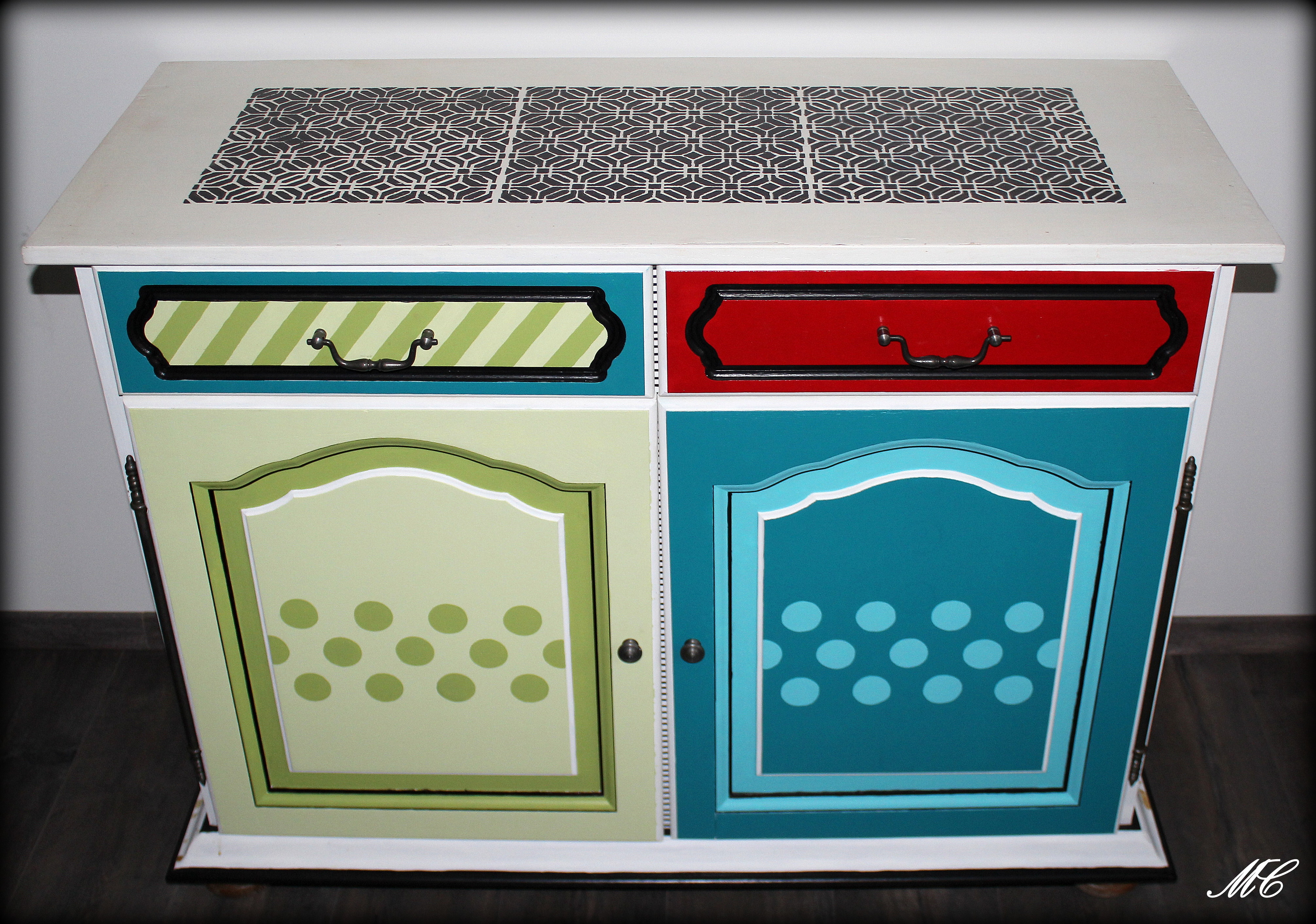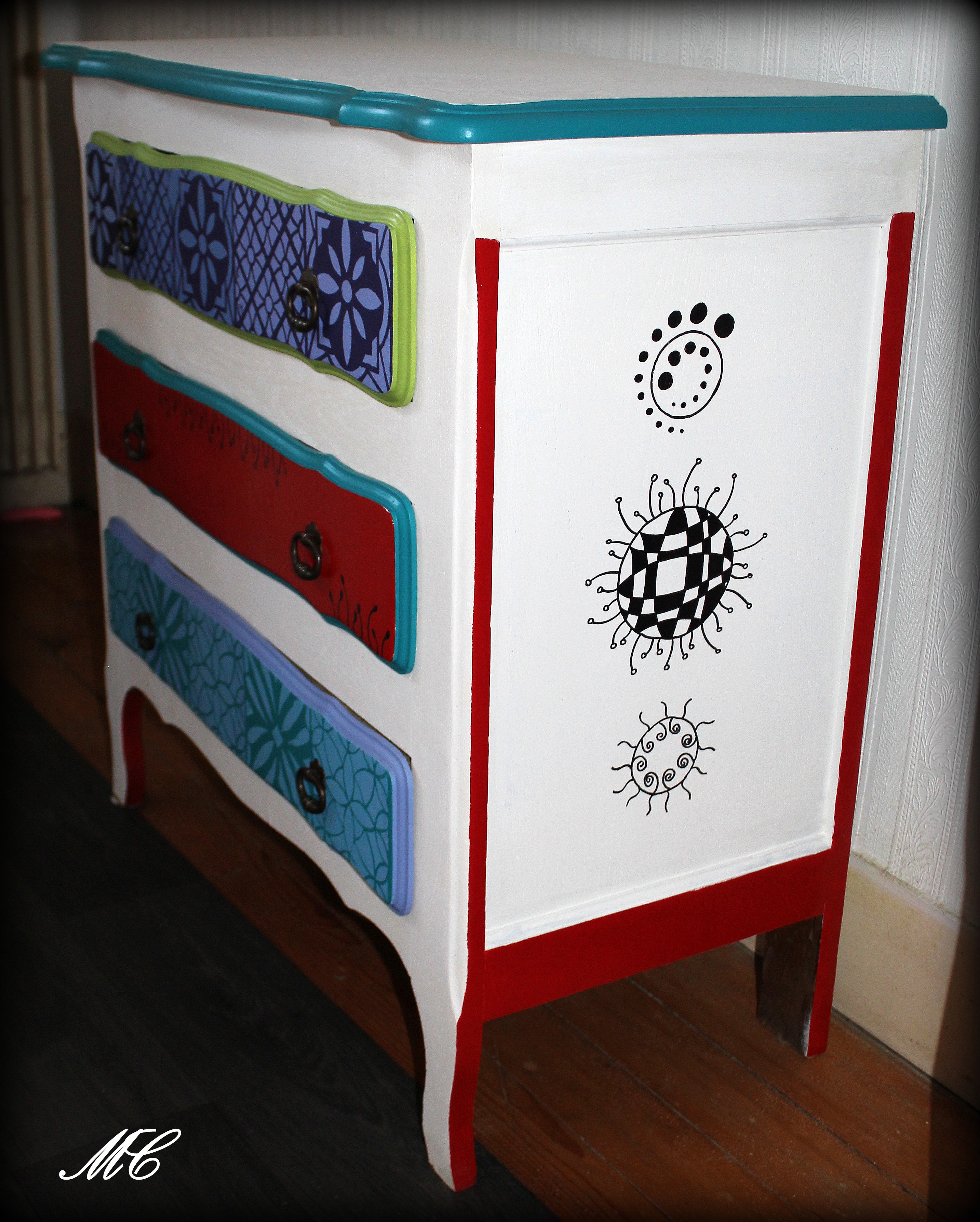 Lorsque j’ai finalement reçu l’autorisation de commencer à me lever un peu, j’ai poursuivi mon travail de couleur mais en volume cette fois et j’ai travaillé à la petite commode récupérée au bric-à-brac :
