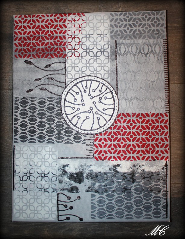 Mon alitement forcé qui suivit ne me permis pas de réaliser les meubles aussi rapidement que je l’aurais voulu pour préparer la venue de bébé mais les pochoirs ne sont pas restés pour autant inutilisés. Au bout de la cinquième semaine allongée et après avoir réaliser pas moins de 6 albums photos en ligne (j’ai ENFIN des books de La Perle Rouge à présenter pour les expos, c’est toujours ça !) il a fallu que je trouve une autre activité à mes mains qui se tournaient nerveusement les pouces et j’ai jeté mon dévolu sur les plus petites toiles que j’avais encore en stock dans mon atelier. Je me suis armée d’un grand calendrier en carton, (histoire de ne pas repeindre l’intégralité des draps de mon lit), d’une boîte de tubes de peintures acryliques (tubes qui, depuis 3 ans n’avaient vu que les pinceaux et les doigts de mon petit garçon) de mes mini-toiles, de mes pinceaux, de mes rouleaux de mousse et enfin, de mes pochoirs.