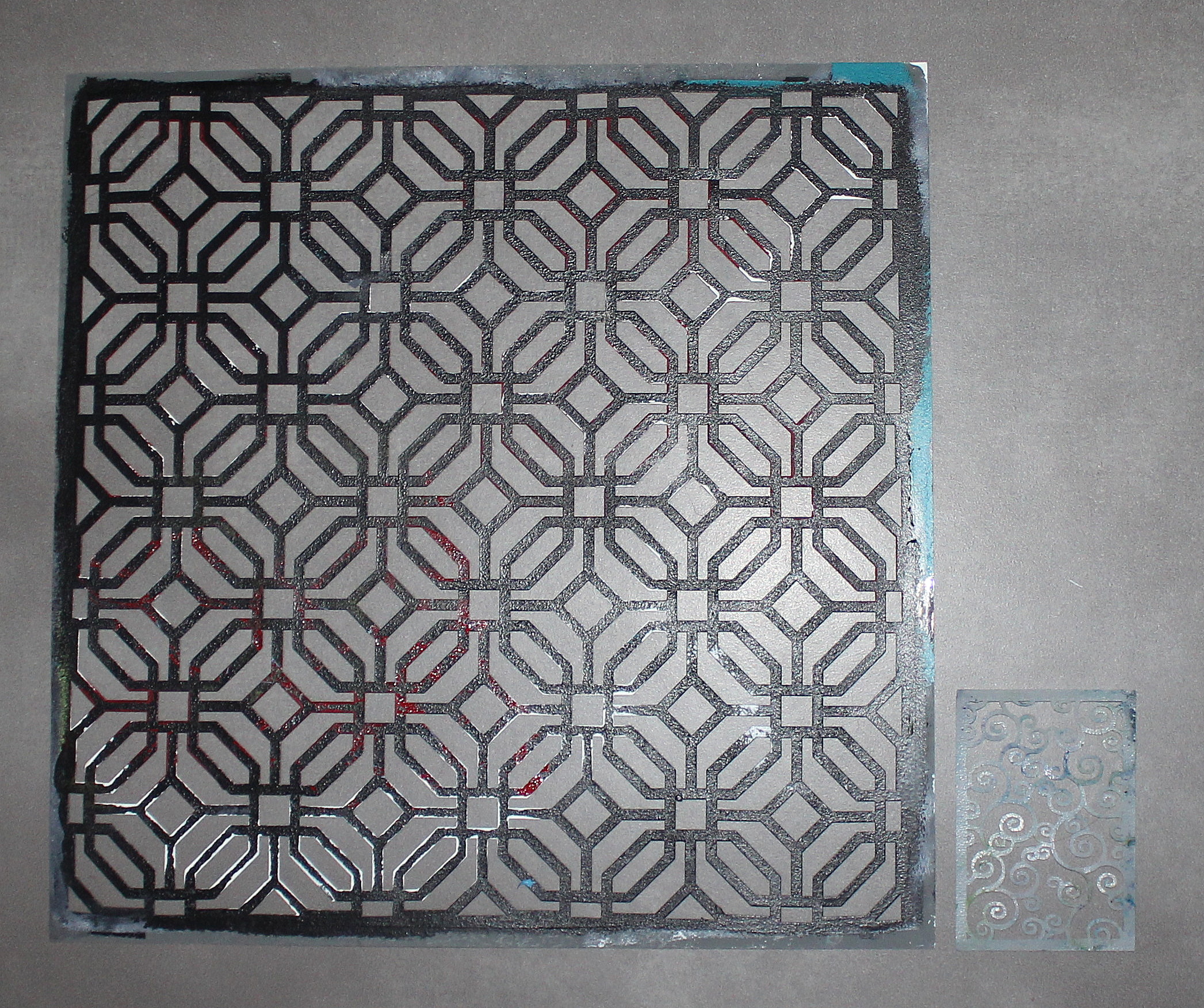 Au tout début du mois d’avril, j’avais participé, rappelez-vous, à un weekend de stage animé par Olga Nicolas. À cette occasion, nous devions apporter dans notre valise de matériel requis, un ou plusieurs pochoirs. Ne possédant rien de semblable, j’ai donc effectué une commande en ligne en omettant bien de prêter attention aux informations relatives au produit du genre… les dimensions. Vous voyez où je veux en venir, hein ? Heureusement pour moi, Olga possédait encore quelques exemplaires à vendre des pochoirs fabriqués par ses soins et j’ai pu me munir d’un motif ajouré de taille utilisable !