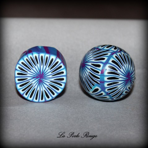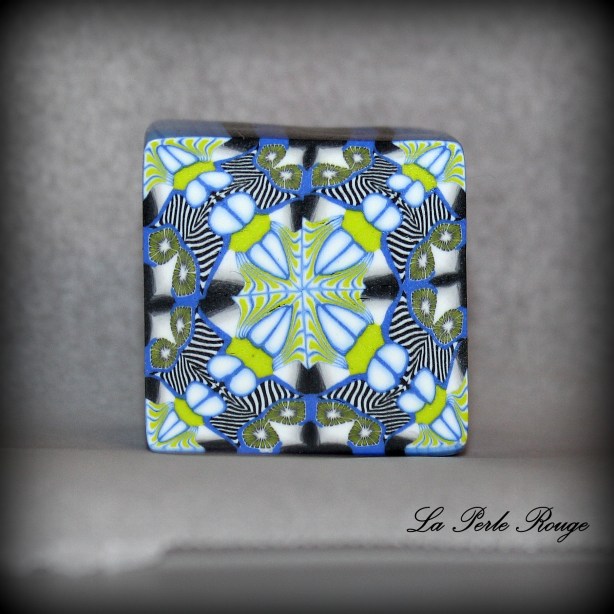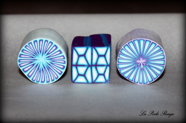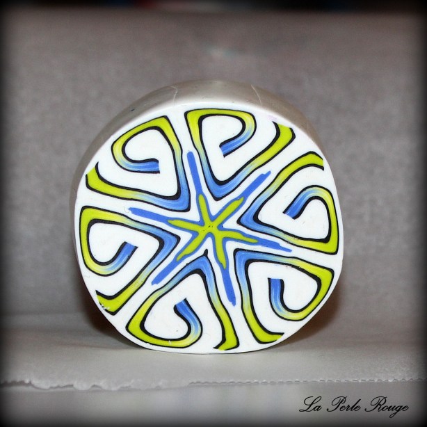 Après une bonne séance de réchauffage de ma pâte dimanche matin et de moi aussi, par la même occasion, (oui parce que prévoyante et organisée comme je suis, j’avais tranquillement laissé dormir ma pâte dans le coffre de ma voiture… et il semblerait, je dis bien il « semblerait » qu’elle a eu un peu froid.) j’ai lancé ma séance de démo pour la journée. Mon programme classique : présentation de la plaque dégradée, base de tous mes motifs, puis exploitations simples et diverses de cette plaque. Préparation de différents éléments afin d’improviser une cane kaléidoscope complexe sous les yeux extrêmement intrigués de tous ceux qui « connaissent cette pâte parce que leur fille en fait mais… pas comme ça, en fait. »