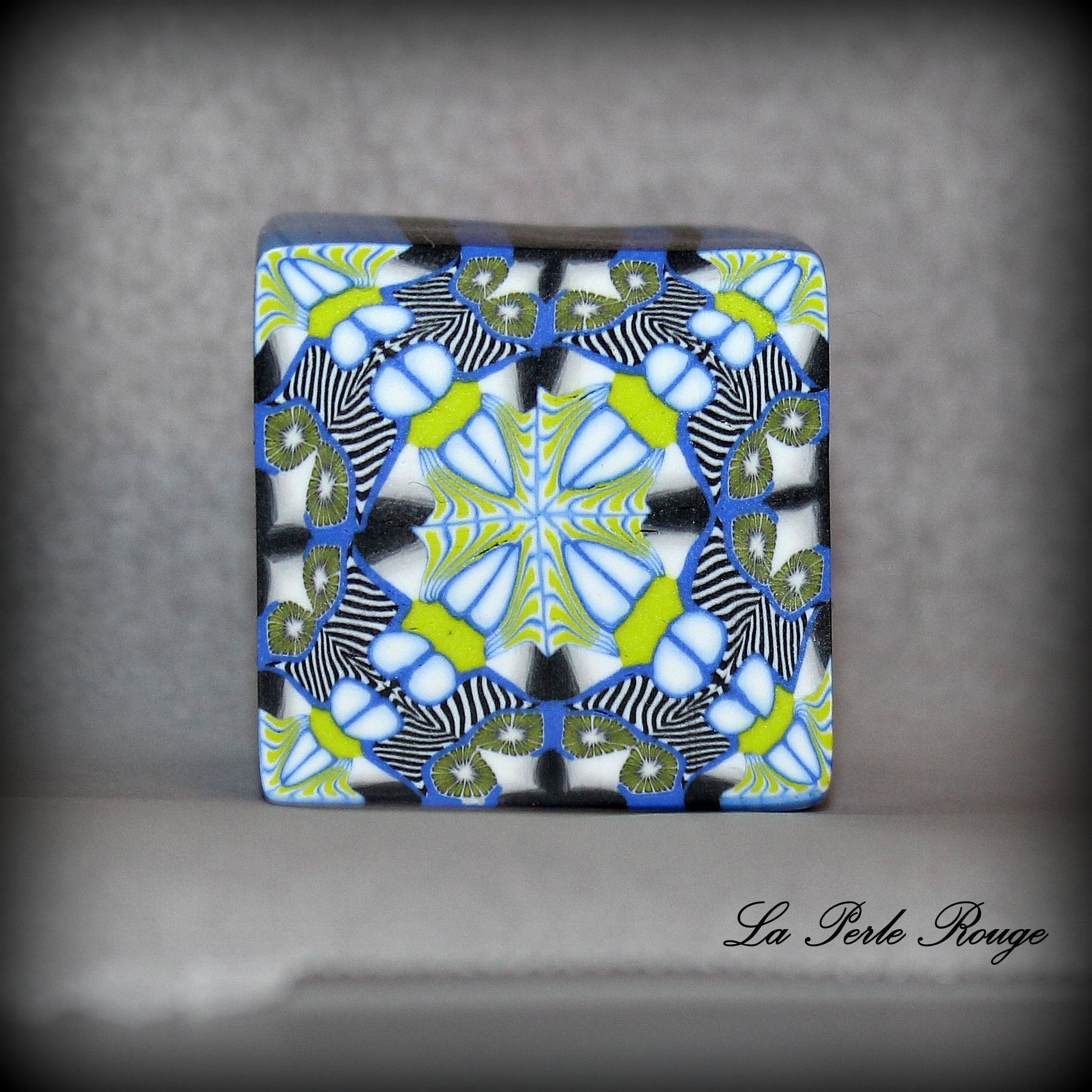Après une bonne séance de réchauffage de ma pâte dimanche matin et de moi aussi, par la même occasion, (oui parce que prévoyante et organisée comme je suis, j’avais tranquillement laissé dormir ma pâte dans le coffre de ma voiture… et il semblerait, je dis bien il « semblerait » qu’elle a eu un peu froid.) j’ai lancé ma séance de démo pour la journée. Mon programme classique : présentation de la plaque dégradée, base de tous mes motifs, puis exploitations simples et diverses de cette plaque. Préparation de différents éléments afin d’improviser une cane kaléidoscope complexe sous les yeux extrêmement intrigués de tous ceux qui « connaissent cette pâte parce que leur fille en fait mais… pas comme ça, en fait. »