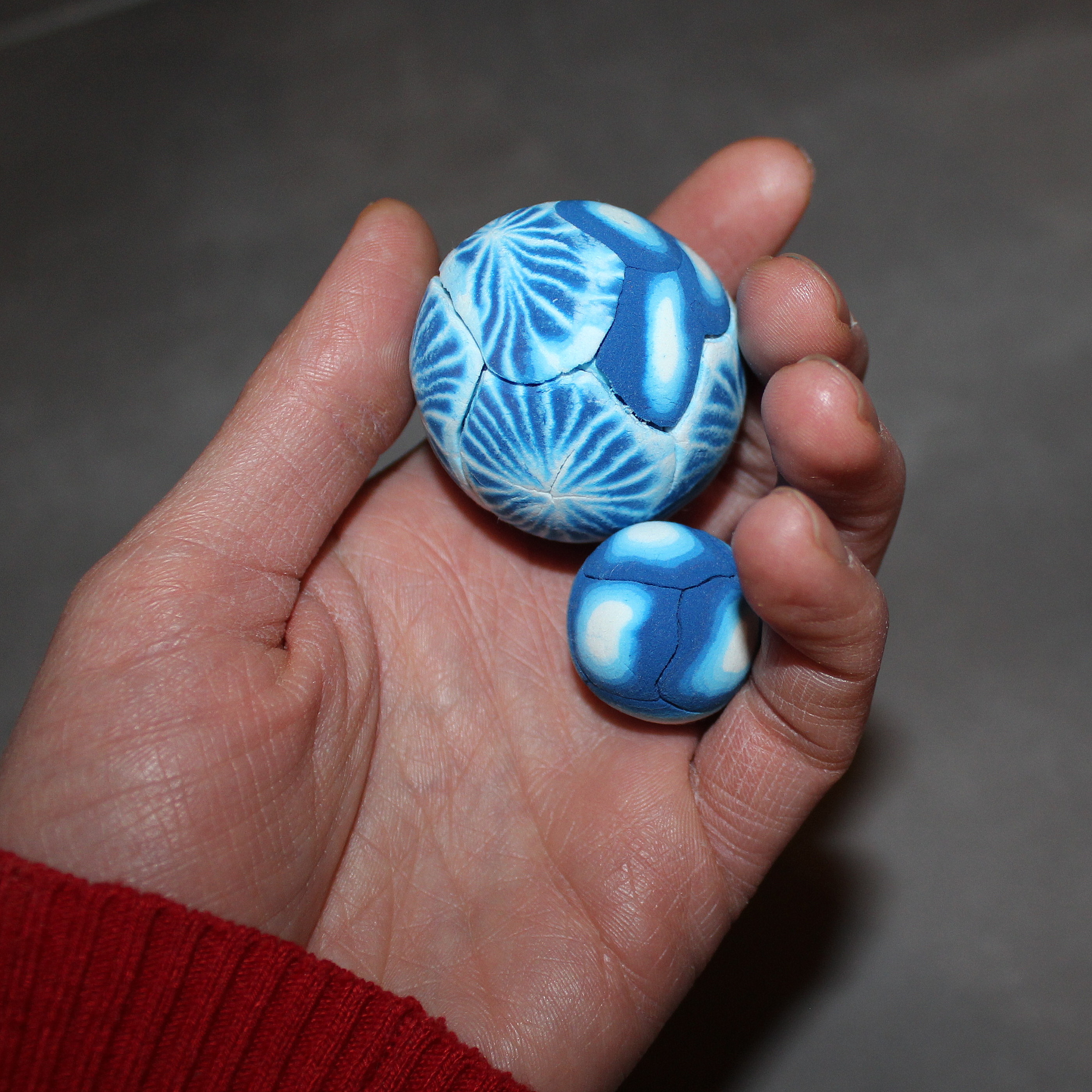 Outre le naturel de sa composition et sa légèreté, sa plus grande qualité réside dans son temps de séchage. 15 minutes à l’extérieur et 24 h au cœur. Et 15 minutes… et BEN C’EST FICHTREMENT RAPIDE !!!!! Trop rapide pour espérer faire adhérer les tranches de canes les unes aux autres sur une boule ou une plaque. De toute façon, la matière est bien trop molle pour parvenir à obtenir des tranches de cane correctes.
