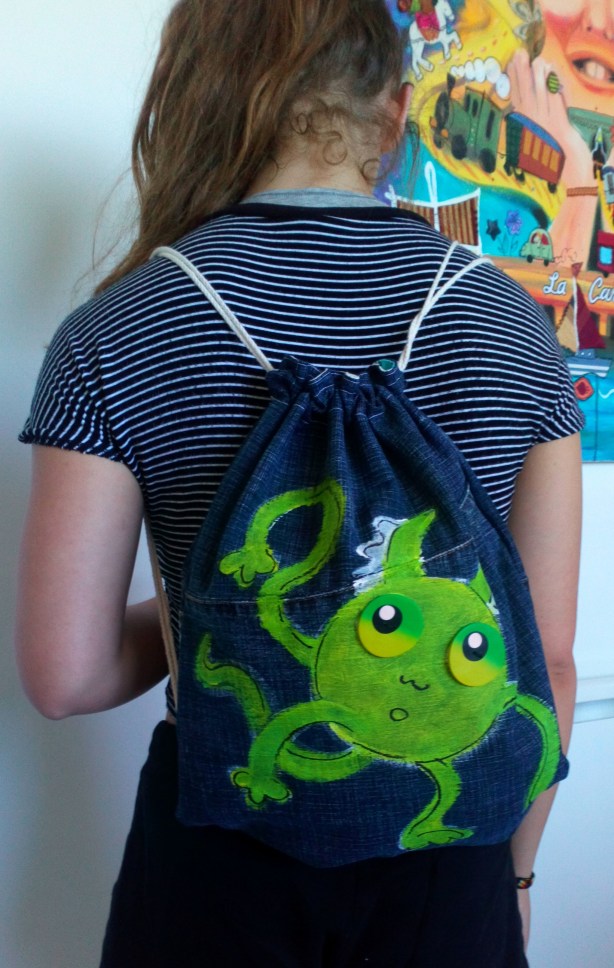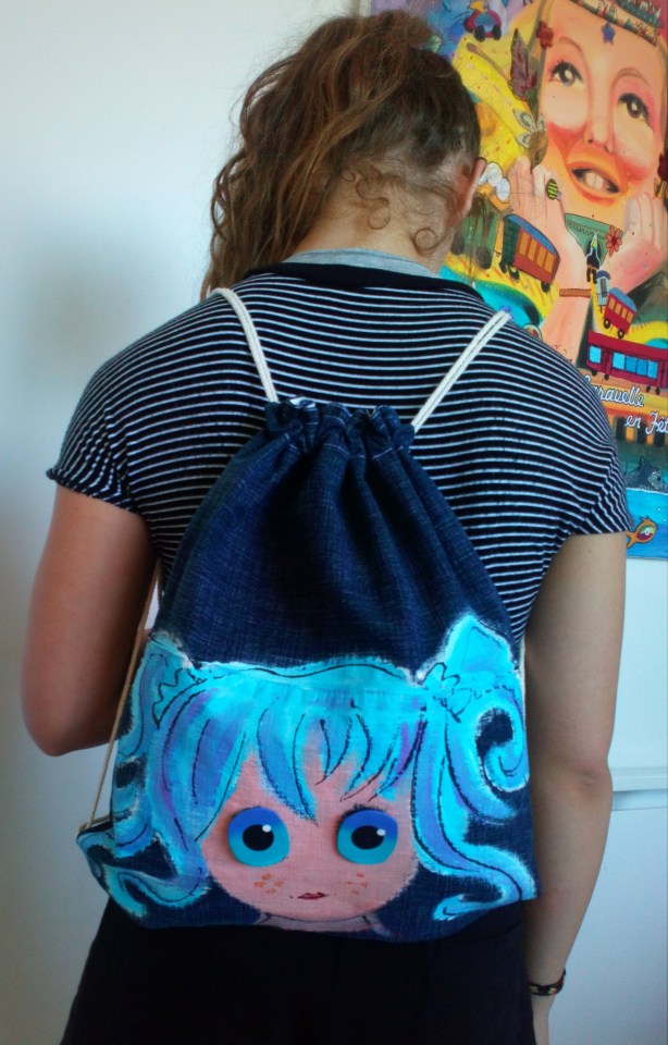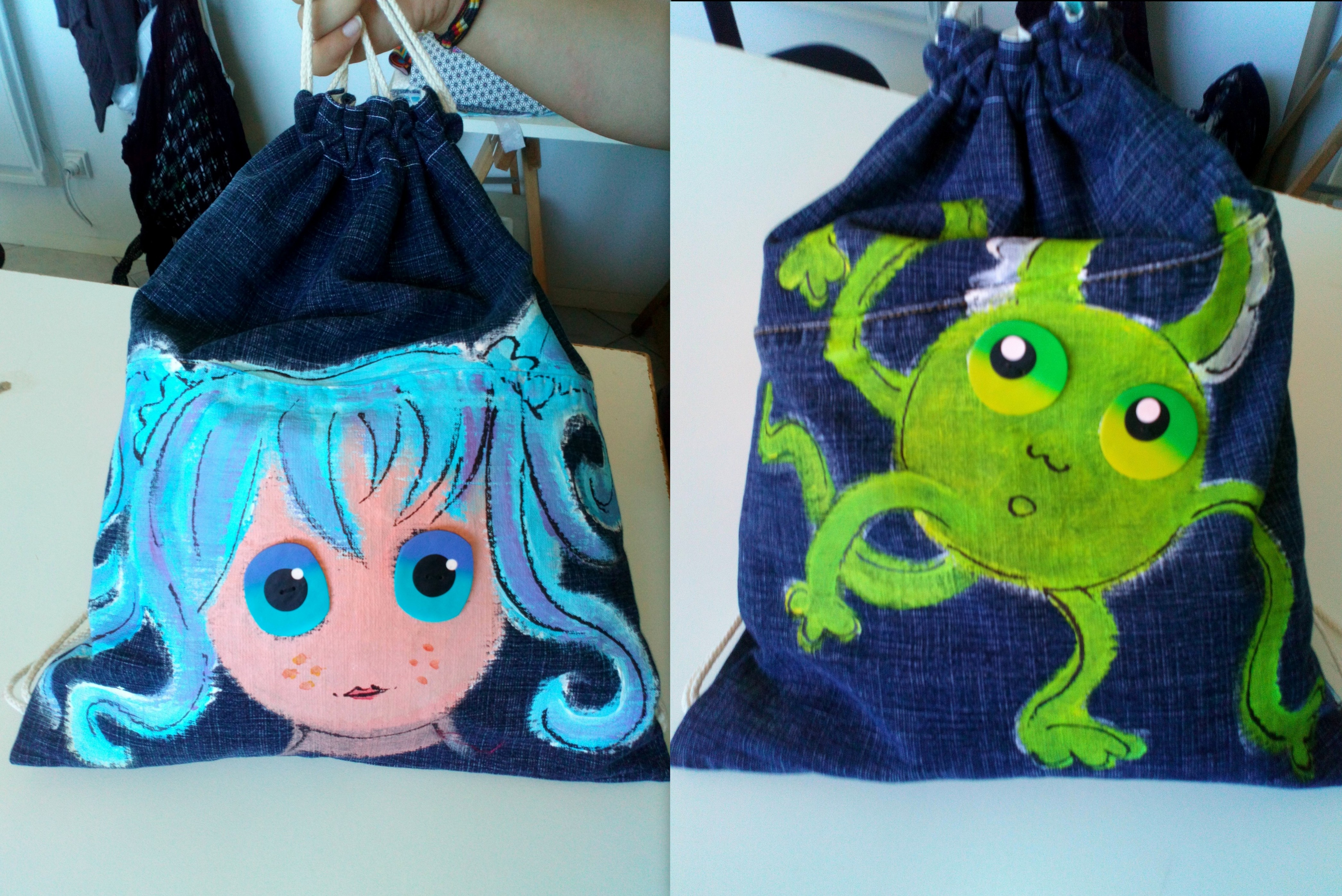 Le principe reste le même, peinture sur jean denim, puis réalisation des yeux en pâte polymère et enfin montage couture.