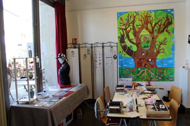 L’espace consacré à la pâte polymère (oui, parce que c’était tout de même bien pour cela aussi que j’étais présente et que je vous parle de tout ça !) était idéalement situé à gauche de l’entrée, derrière la vitrine passante mais surtout, juste à côté de l’arbre des enfants et ça… c’était trop beau. Durant ces deux jours, je ne me suis pas lassée de contempler ce mouvement et ces couleurs mis en forme par tant de petites mains différentes pour être ensuite assemblés les uns avec les autres et permettre la naissance de cet arbre plein de vie :