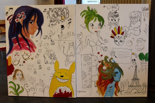 C’est dans ce contexte passant qu’une fresque manga a commencé à voir le jour sous les feutres, crayons et pinceaux de ceux qui avaient envie de se prêter à l’exercice :