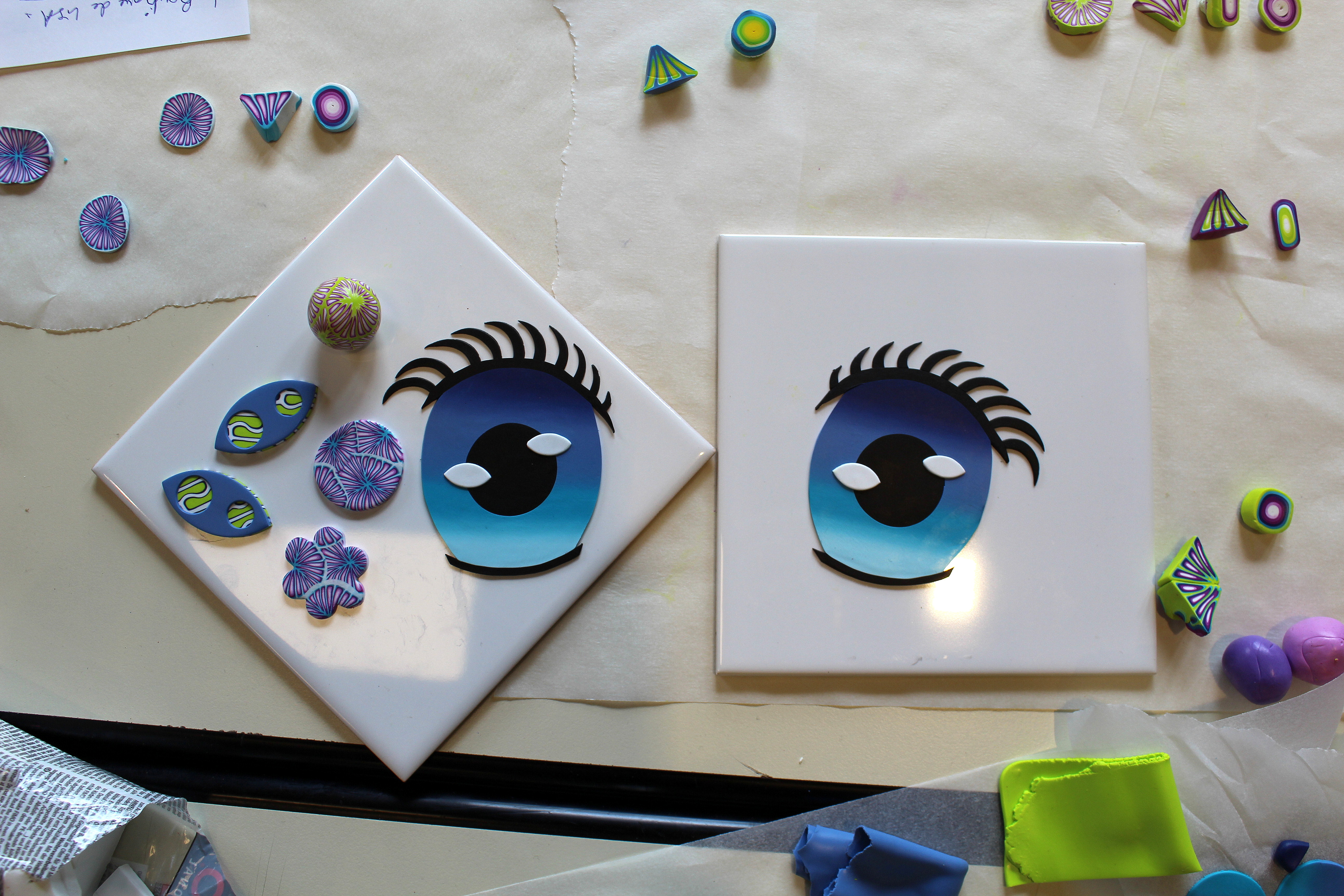 J’ai choisi trois regards qui me plaisaient et je les ai combiné entre eux à l’aide de nombreux allers-retours entre ma table de travail et ce mur coloré afin de créer les miens :