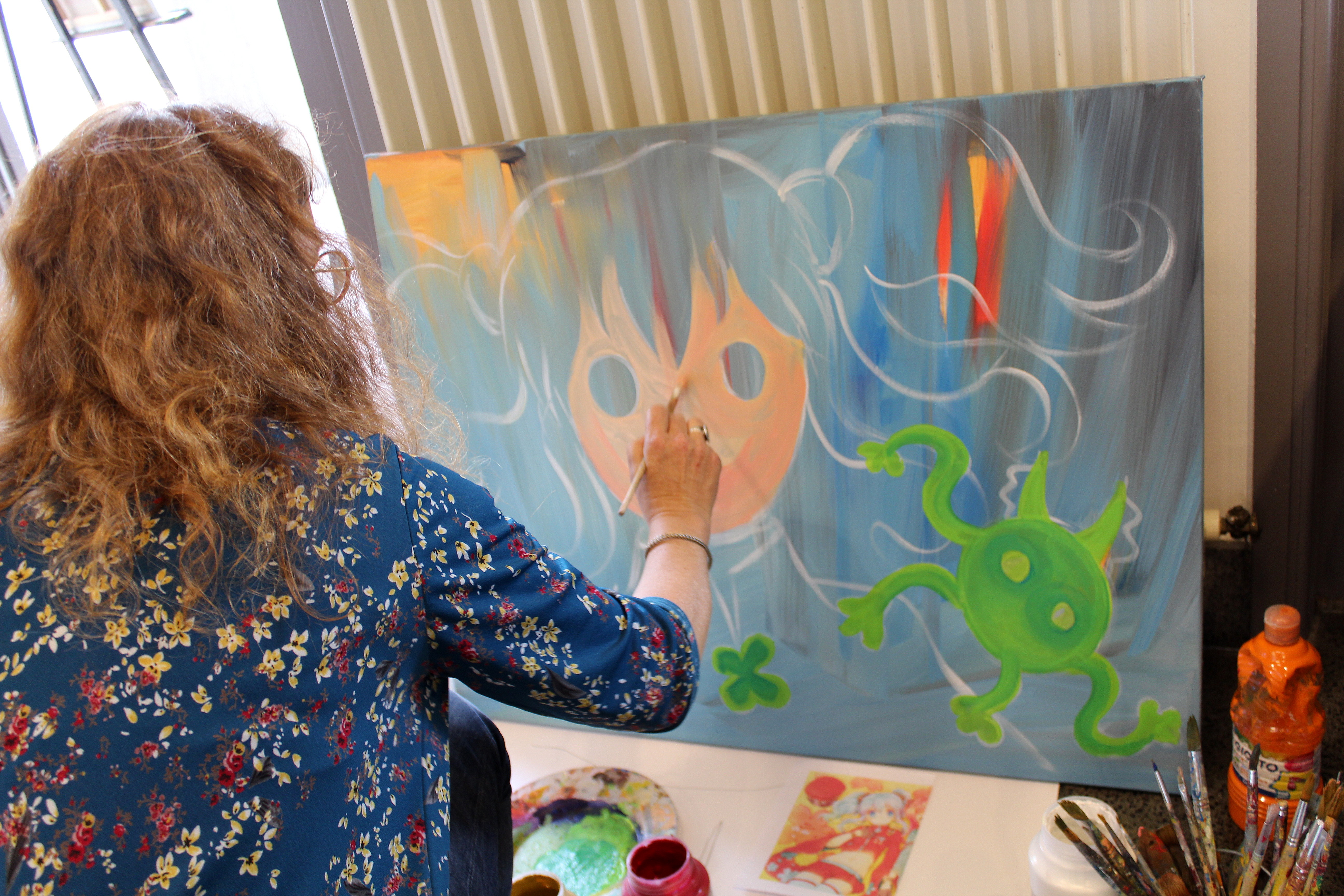 J’adore l’air perplexe de la femme de gauche coincée dans son cadre… derrière son apparente incertitude semble se dissimuler une jalousie face aux couleurs des personnages exposés devant elle.