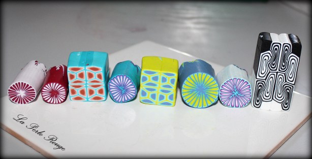 Durant le mois de juillet, j’ai été également présente sur une journée de marché artisanal et comme je ne manque jamais d’effectuer quelques démonstrations sur mon stand, je vous montre à présent les canes qu’ont découvert les néophytes du jour, bien étonnés qu’ils étaient (comme d’habitude) de constater qu’on pouvait faire autre choses que des petites boules ou des macarons en pâte polymère et que cela pouvait aussi passionner des gens âgés de plus de 8 ans.