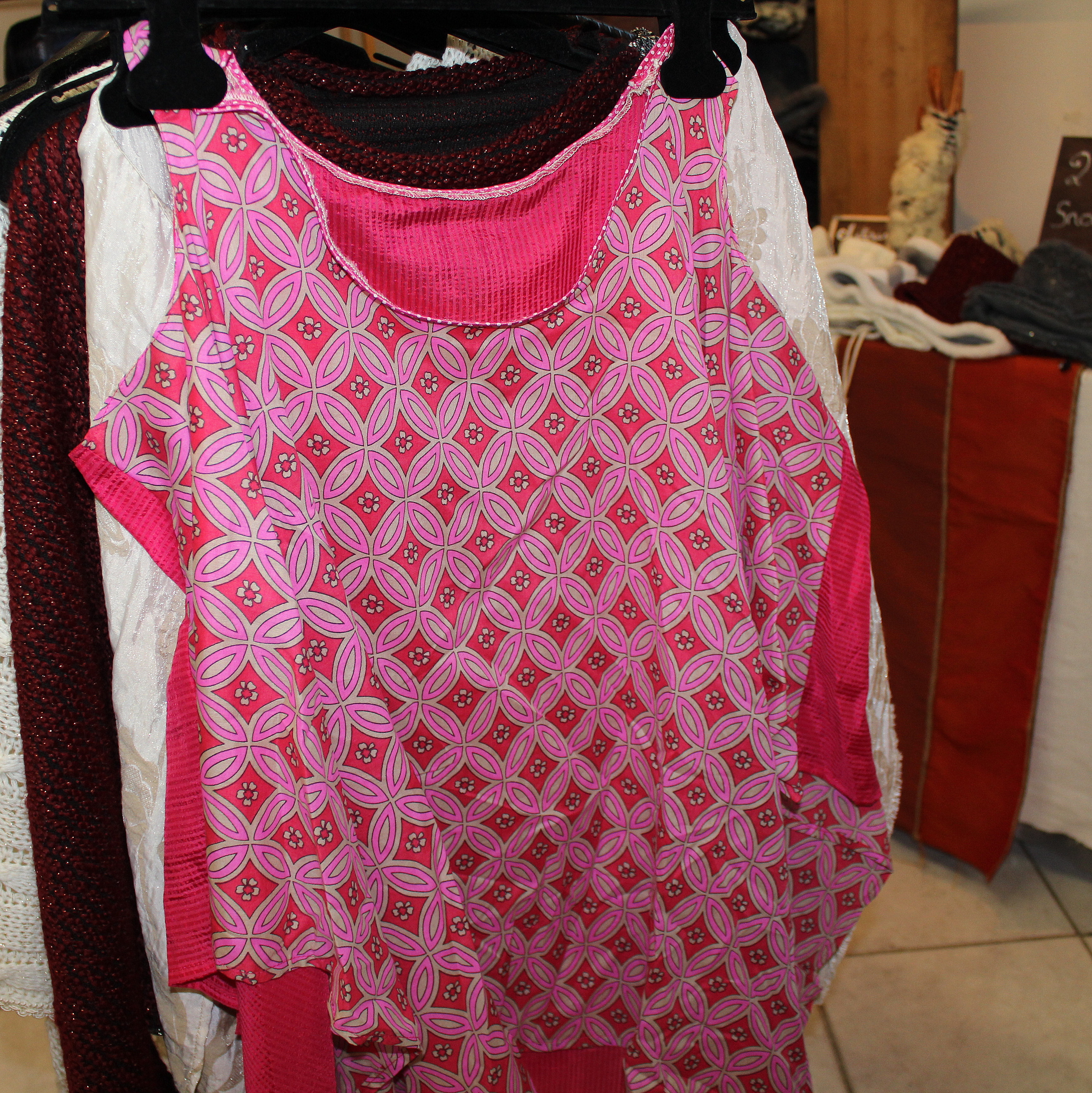 Tandis que, confortablement installée dans l’atelier de couture réaménagé pour l’occasion en une véritable boutique, je manipulais… ou plutôt tripatouillais quelques morceaux de pâte en m’interrogeant sur les couleurs de mes démonstrations du jour, mon regard balaya les portants installés devant moi. Une tunique attira mon attention par son motif, d’abord, qui m’a fait largement pensé aux jolies canes à l’irréprochable régularité que donne un extrudeur aux disques appropriés et par ses couleurs ensuite, couleurs qui me forceraient à sortir de ma zone de confort.