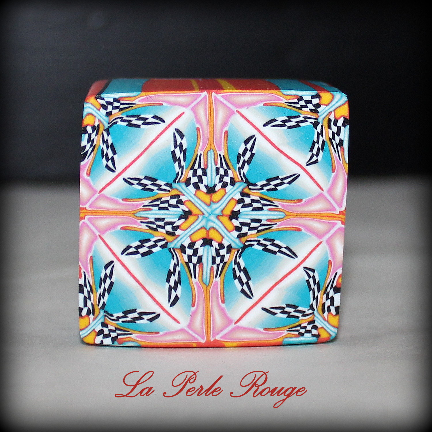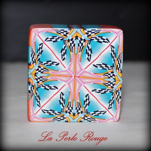 Mes petites démonstrations de canes se poursuivirent et pour mon kaléidoscope final, je décidai donc de conserver ces teintes en les associant à des turquoises grisés et là… et bien, vous jugerez pas vous-même mais en ce qui me concerne, je trouve que ce sont les plus jolies canes que j’ai montées depuis longtemps. J’ai tellement aimé ces couleurs et ces motifs que je ne suis pas parvenue à me décider sur l’assemblage final et que j’ai opté pour une doublette de kaléidoscopes :