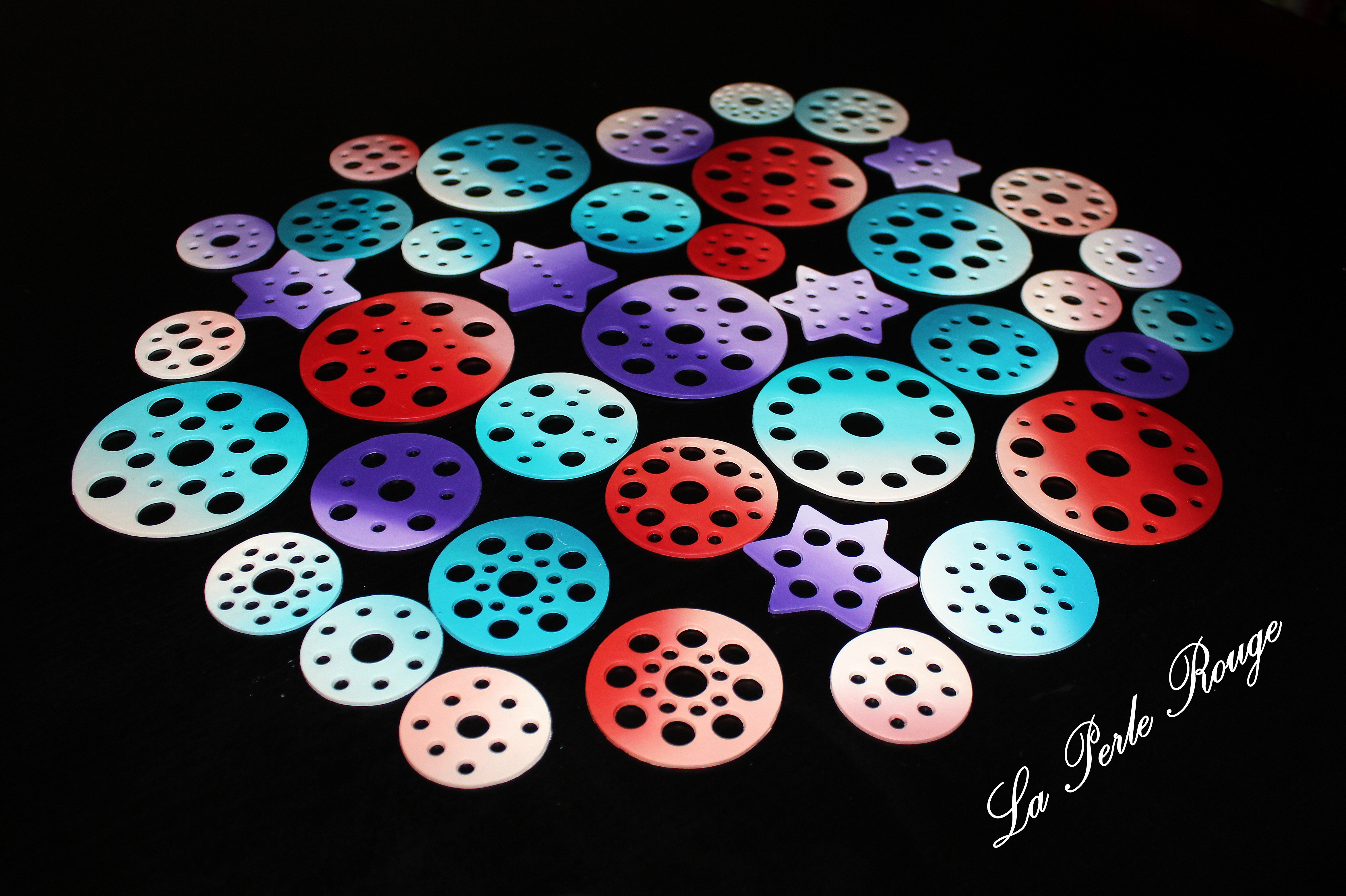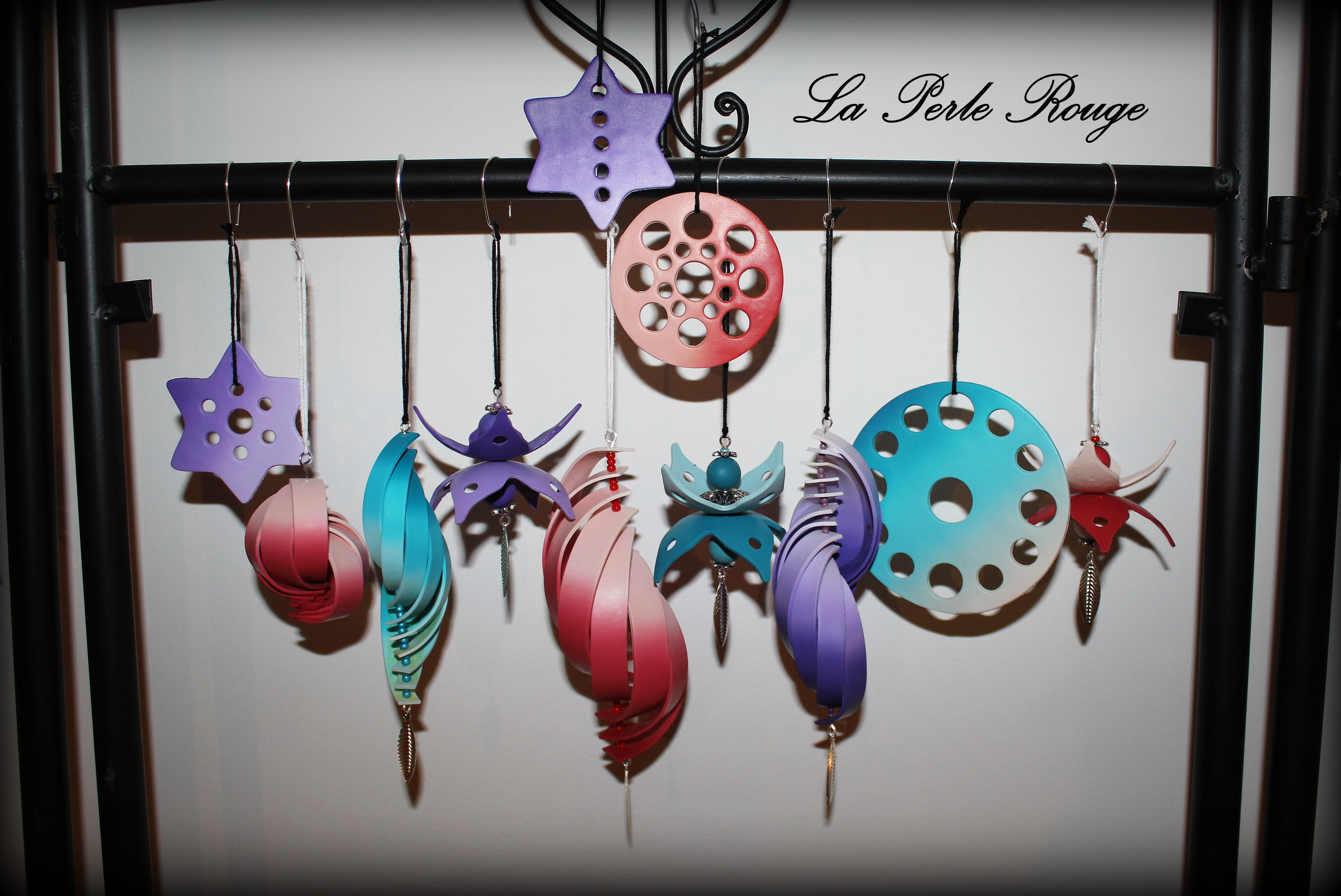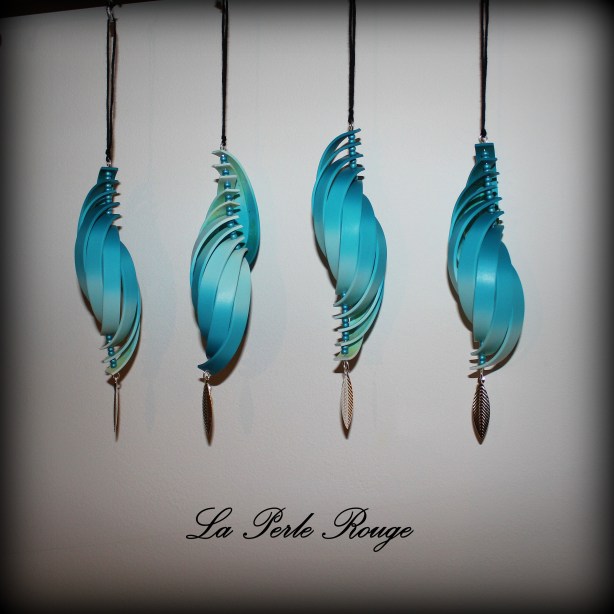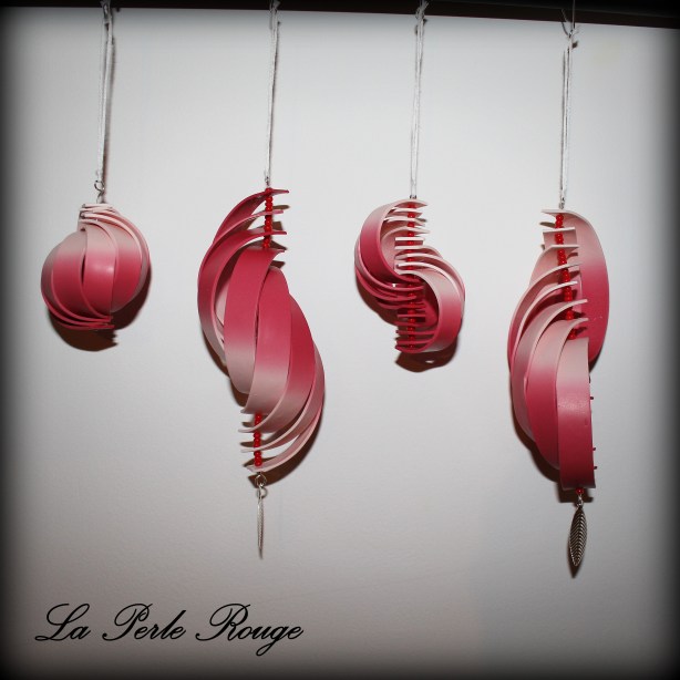 J’ai eu également envie de fabriquer des belles boules de Noël en m’inspirant, cette fois,  des boules de papier en bandes qu’on a tous fait un jour. Oui, mais voilà, la pâte polymère, même utilisée à un réglage fin de la machine présente une épaisseur incomparable à une feuille de papier. D’autant que le nombre de bandes nécessaire à fermer la sphère engendre une torsade à la façon de… Carol Blackburn et BAM. Bon… tant pis… je n’ai pas eu envie de démonter celle qui correspond tout à fait à une ÉNORME boucle d’oreille de Carol Blackburn mais j’ai modifié le montage des autres façon La Perle Rouge. J’aime beaucoup ces demi-coquilles parce que je trouve que l’intérieur est aussi beau que l’extérieur.