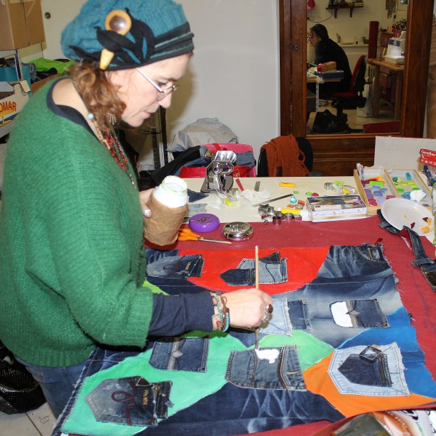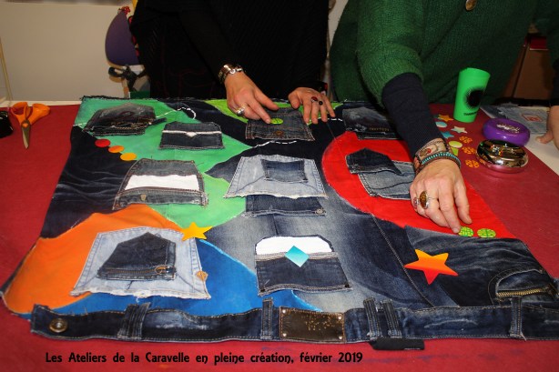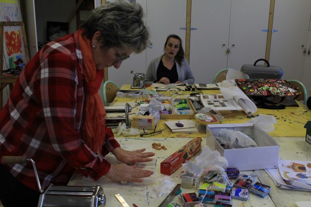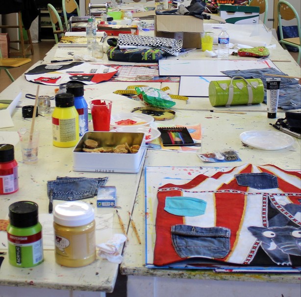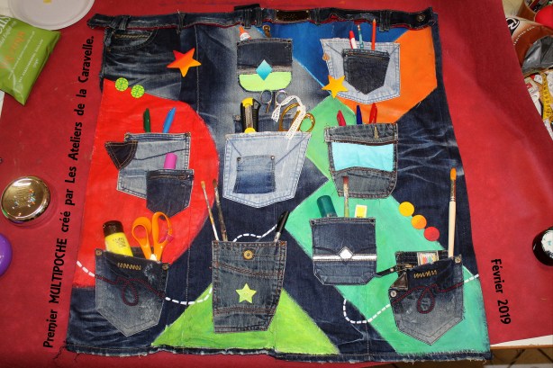 Ici, nous avons eu une journée de stage autour du multipoche qui s’est révélée aussi créative que variée comme vous allez pouvoir le constater sur les clichés de cet article. Pourtant, le travail a débuté plus tardivement que prévu et après un moment de frayeur mettant à l’épreuve nos époustouflantes capacités de réaction, nous avons investi notre espace et laissé déroulé nos idées et notre matériel :