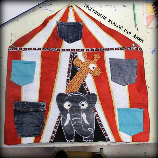 Annie a choisi le thème du cirque. Des morceaux de jean recyclés a alors surgit un immense chapiteau au rideau entrouvert laissant dépasser un éléphant et une girafe.
