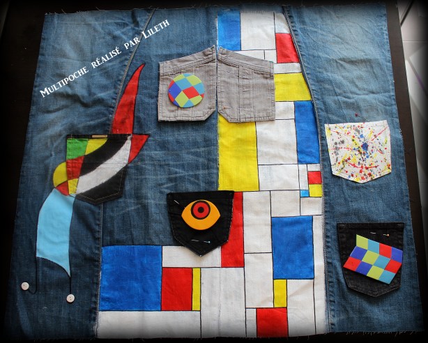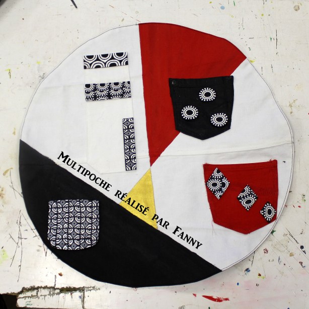 Vous apercevez l’oeil jaune et rouge parmi les motifs noir et blanc et vous vous demandez ce que ça fait là ? Et bien il fait partie de la troisième pièce, le multipoche réalisé par Lileth.