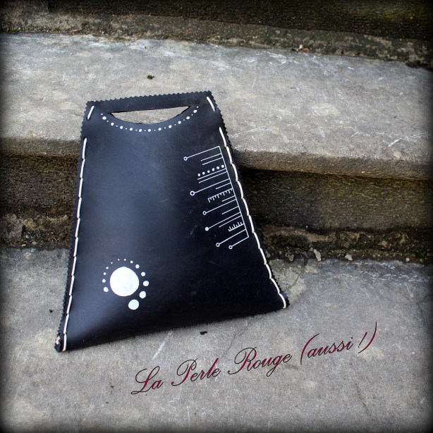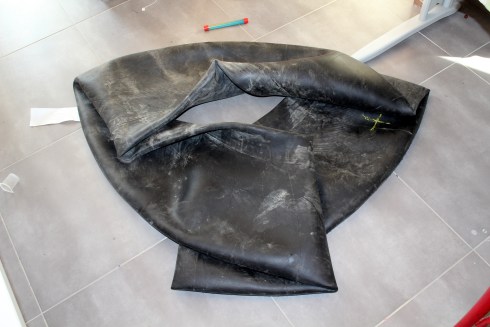 Mes emporte-pièces à frapper étant enfin arrivés dans mon atelier et s’étant synchronisés avec un peu de temps sans enfant malade, j’ai pu m’attaquer à cette chambre à air de tracteur histoire de voir ce que je pouvais bien faire avec une telle épaisseur.