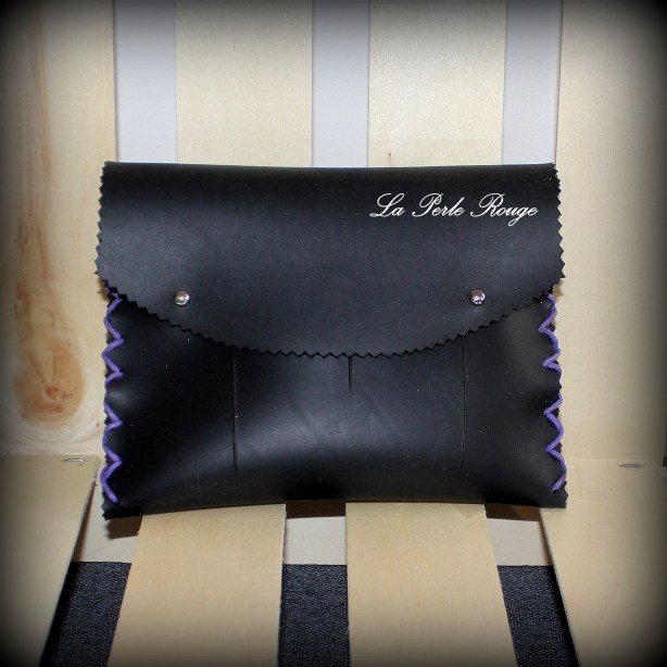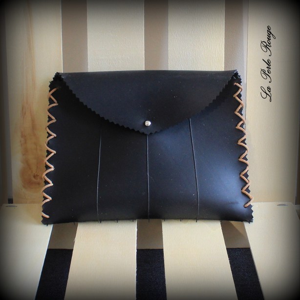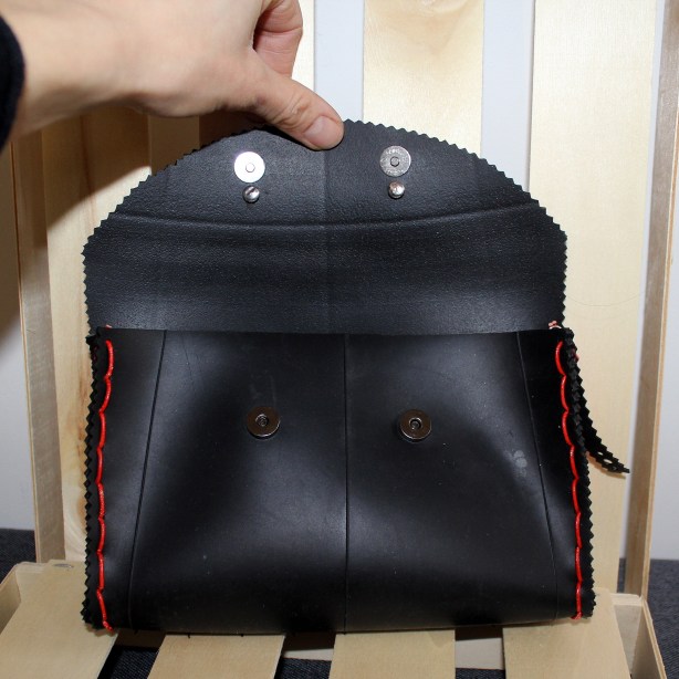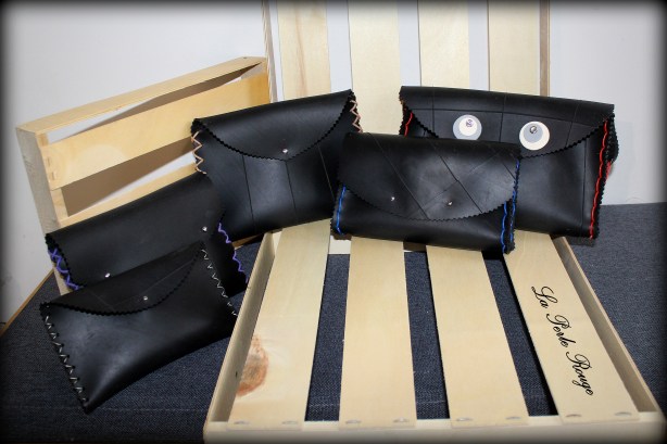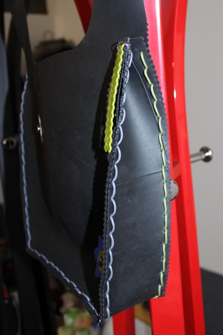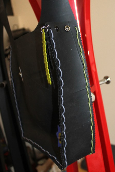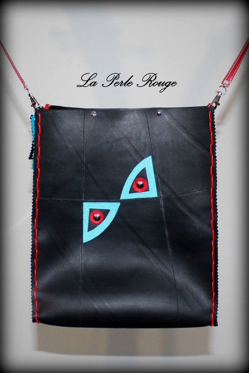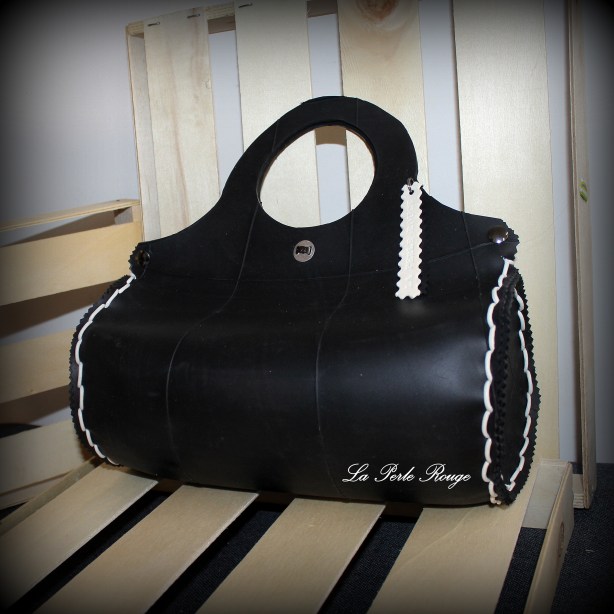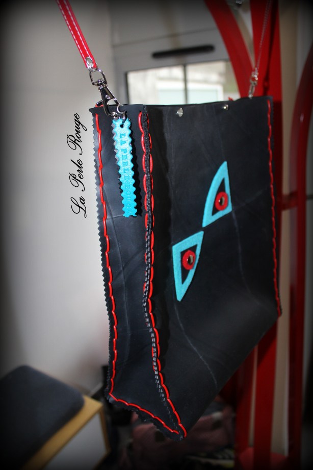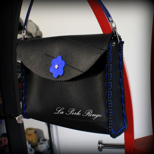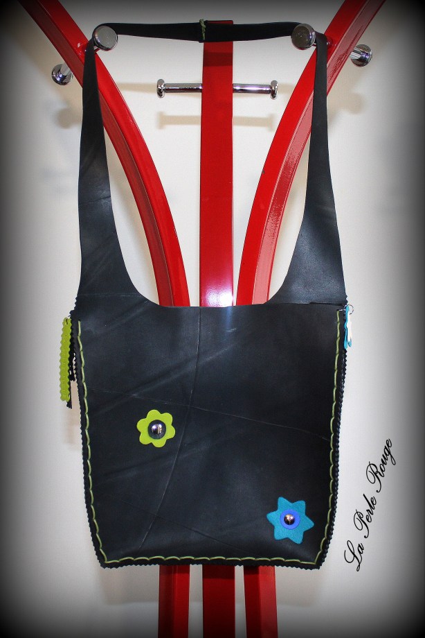 Celui-ci mériterait d’être réalisé en plus petit, genre pochette à main car la souplesse de la chambre à air par rapport au cuir ne lui permet pas de conserver sa forme cylindrique aussi parfaitement que je le voudrais. Et il va falloir également que je trouve comment masquer l’arrière du bouton aimanté parce que je ne peux pas utiliser le même stratagème que les petits sacs du dessus.