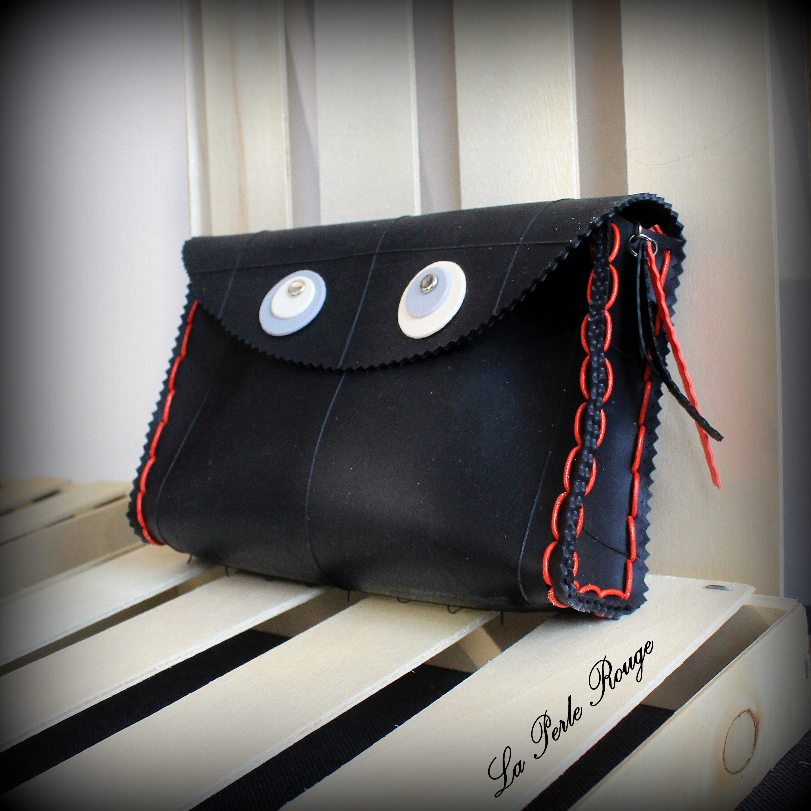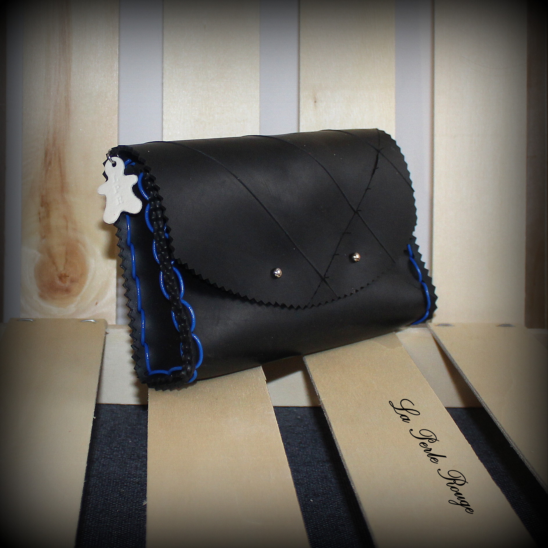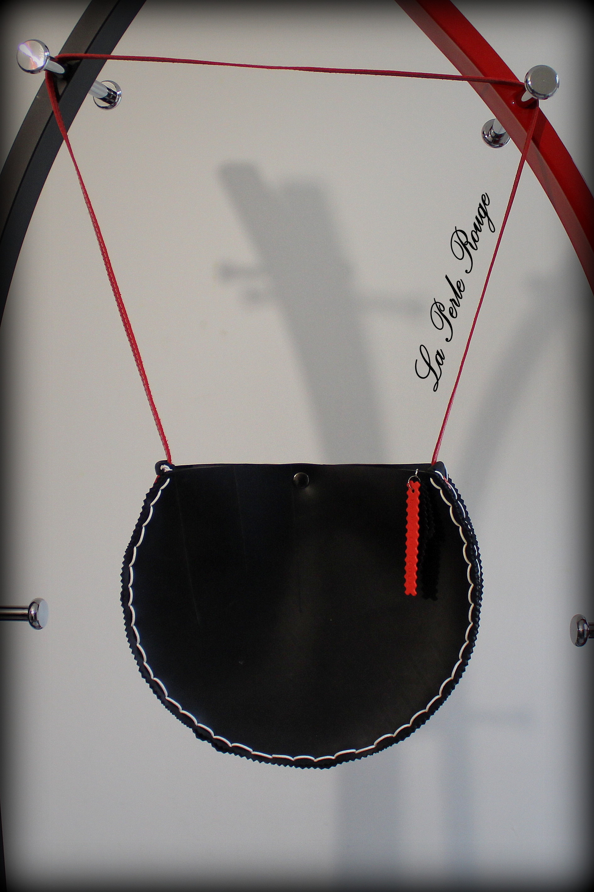 Celui-ci mériterait d’être réalisé en plus petit, genre pochette à main car la souplesse de la chambre à air par rapport au cuir ne lui permet pas de conserver sa forme cylindrique aussi parfaitement que je le voudrais. Et il va falloir également que je trouve comment masquer l’arrière du bouton aimanté parce que je ne peux pas utiliser le même stratagème que les petits sacs du dessus.